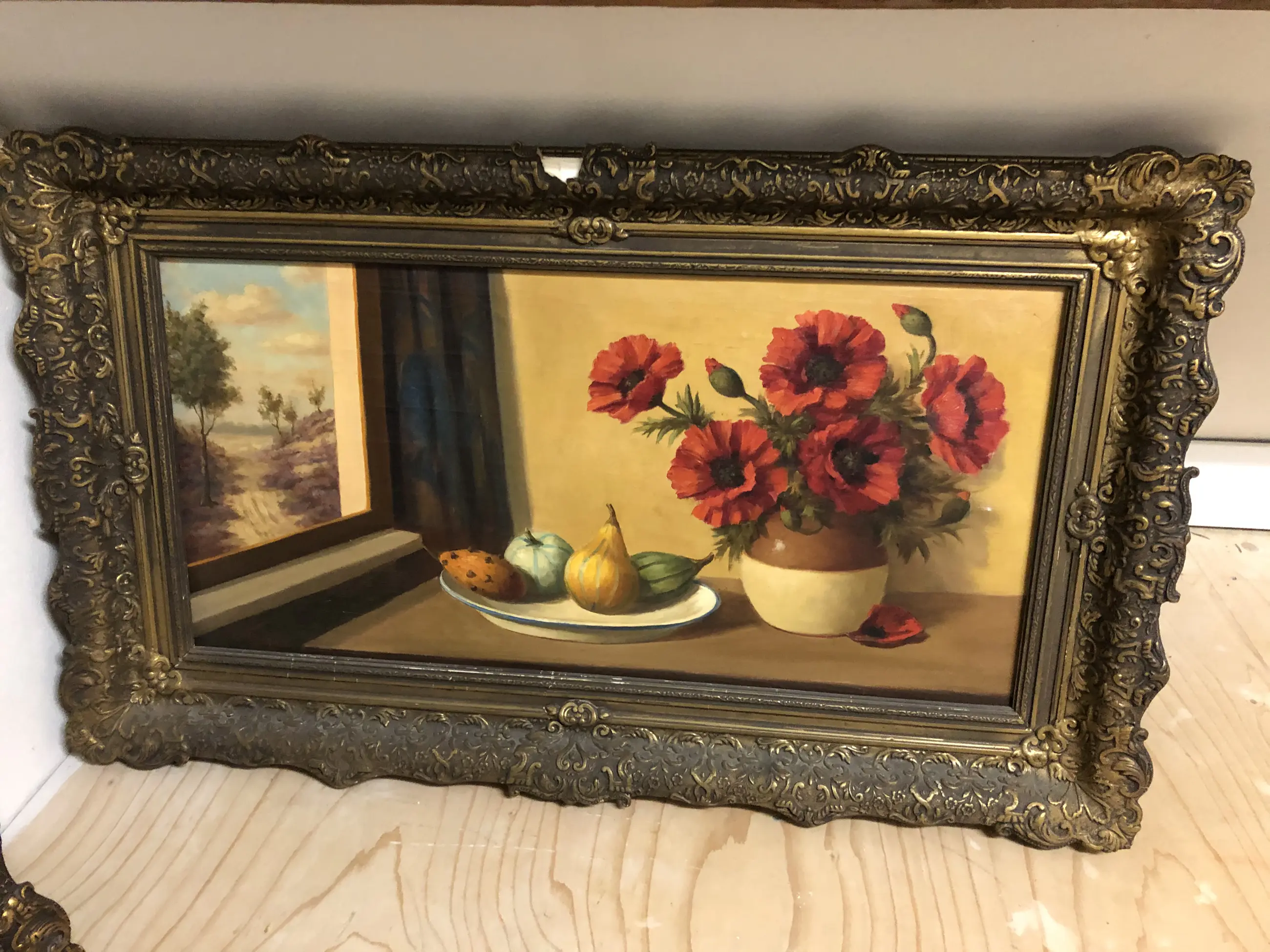 Kleine beschadiging aan lijst maar ontbrekende stukje is bewaard.