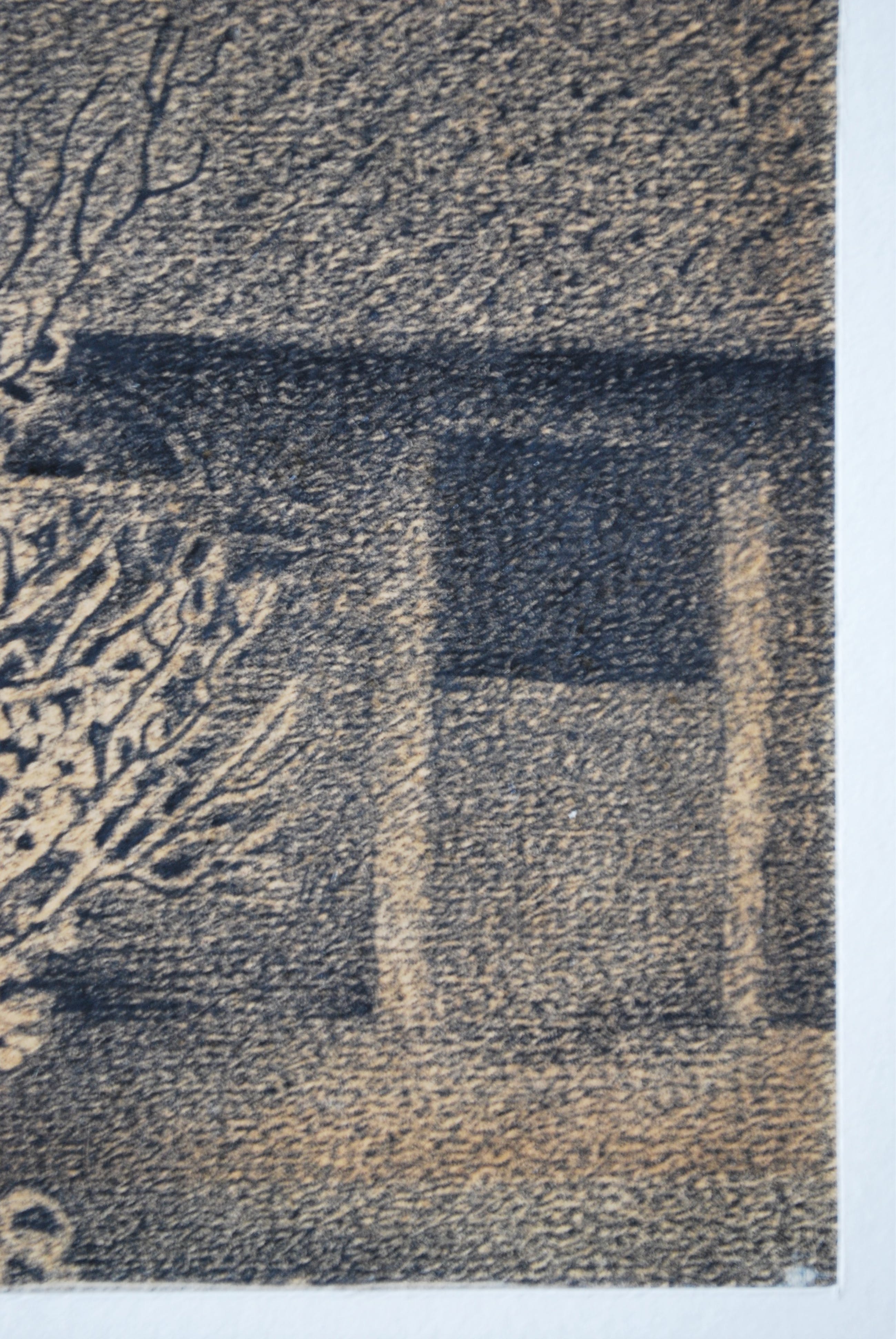Blad is bevestigd op karton, geplaatst achter passepartout.