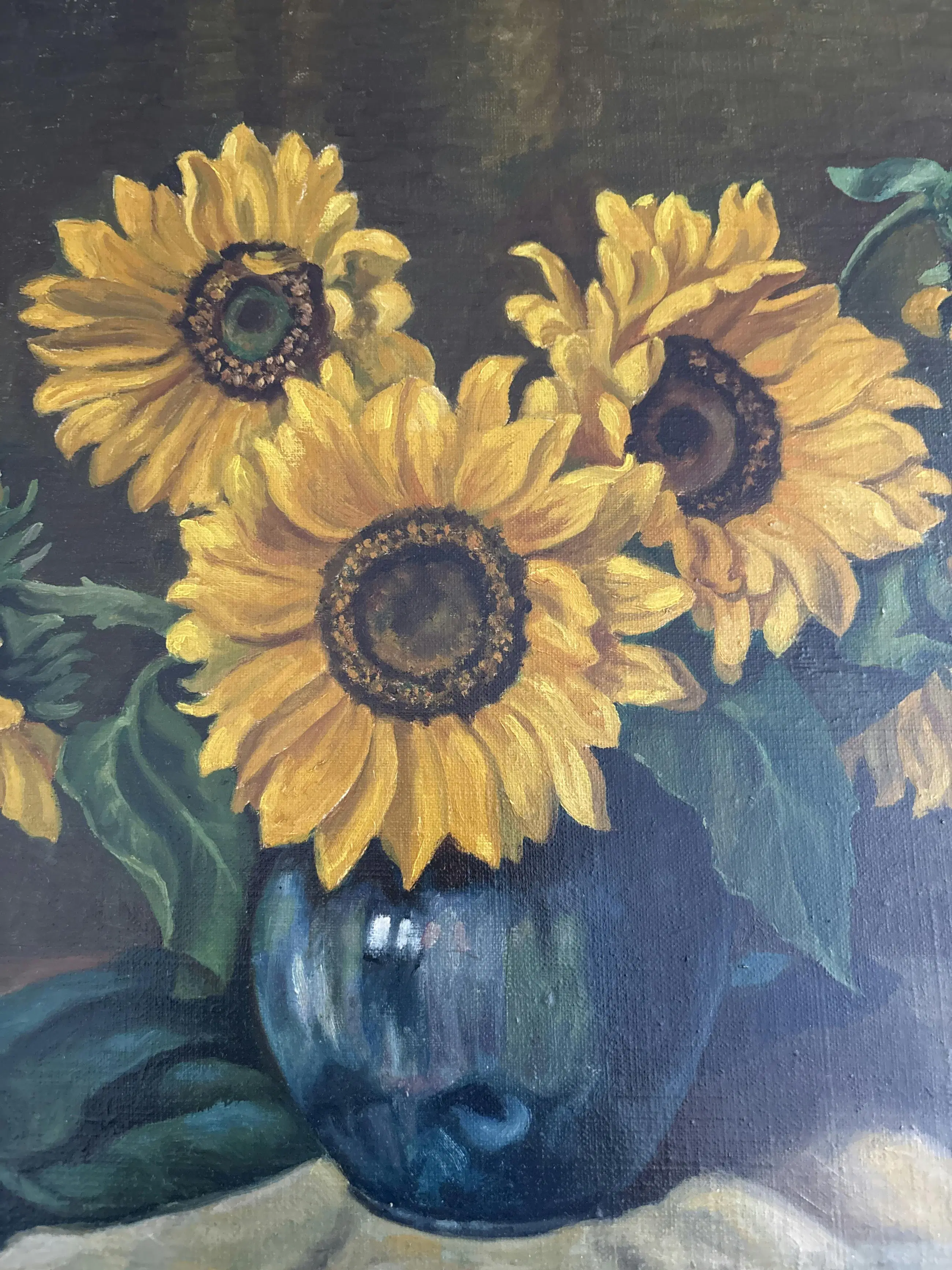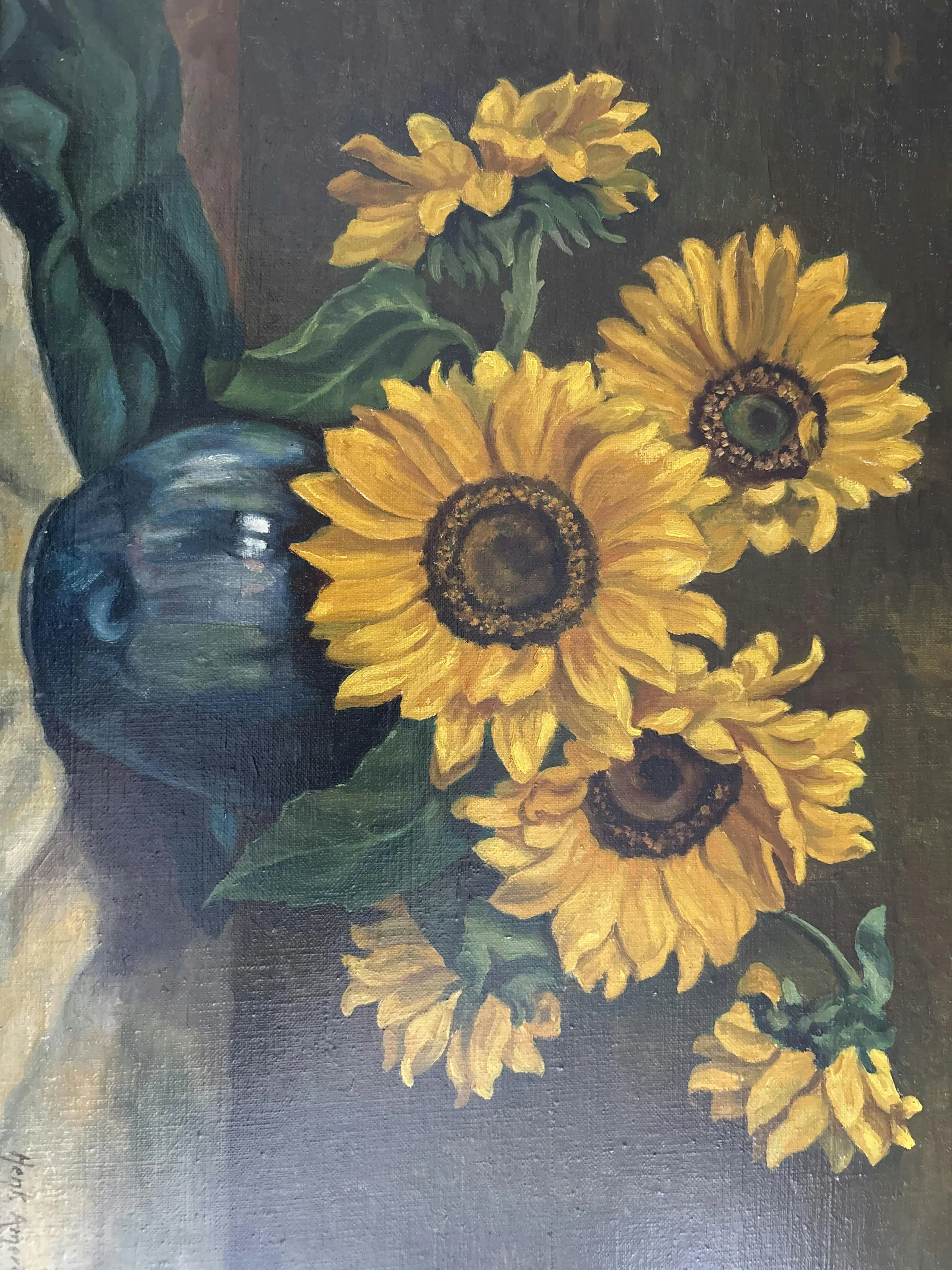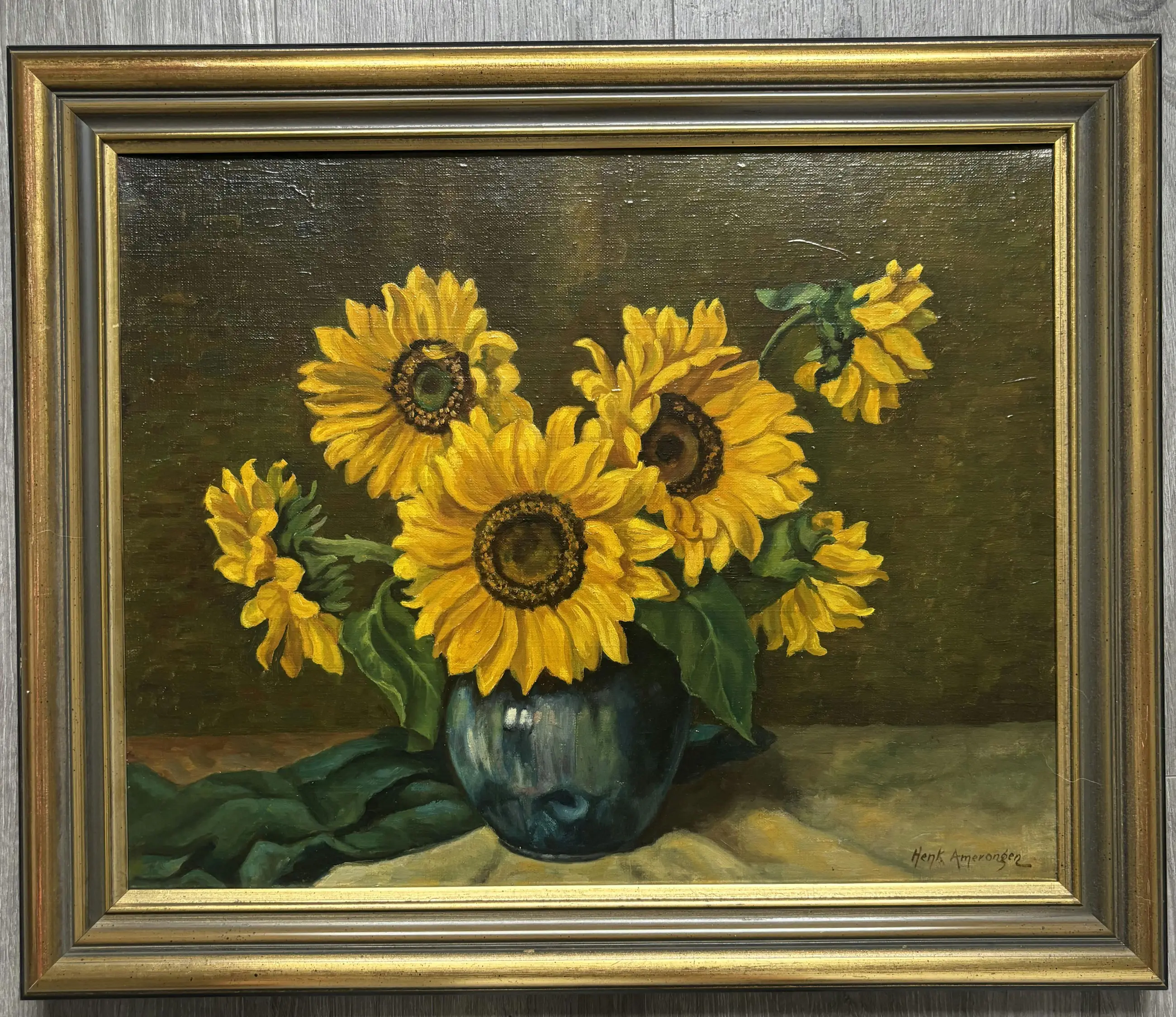 Prachtig handgeschilderd olieverfschilderij van zonnebloemen in een vaas, in klassieke stijl. Het werk is gesigneerd rechtsonder met Henk Amerongen en is professioneel ingelijst in een stevige houten lijst met goudaccenten.