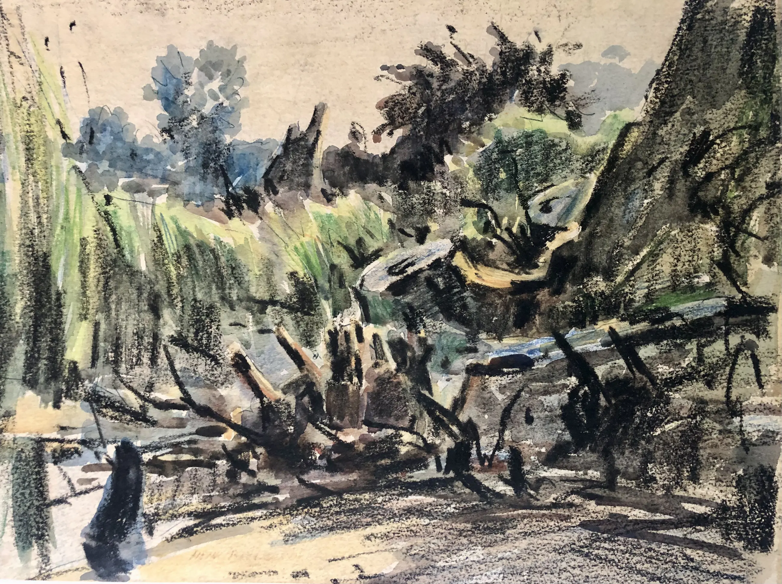 Expressionistisch landschap van kunstenaar en Artibus leraar Henk Bellaard. Te dateren jaren 60.