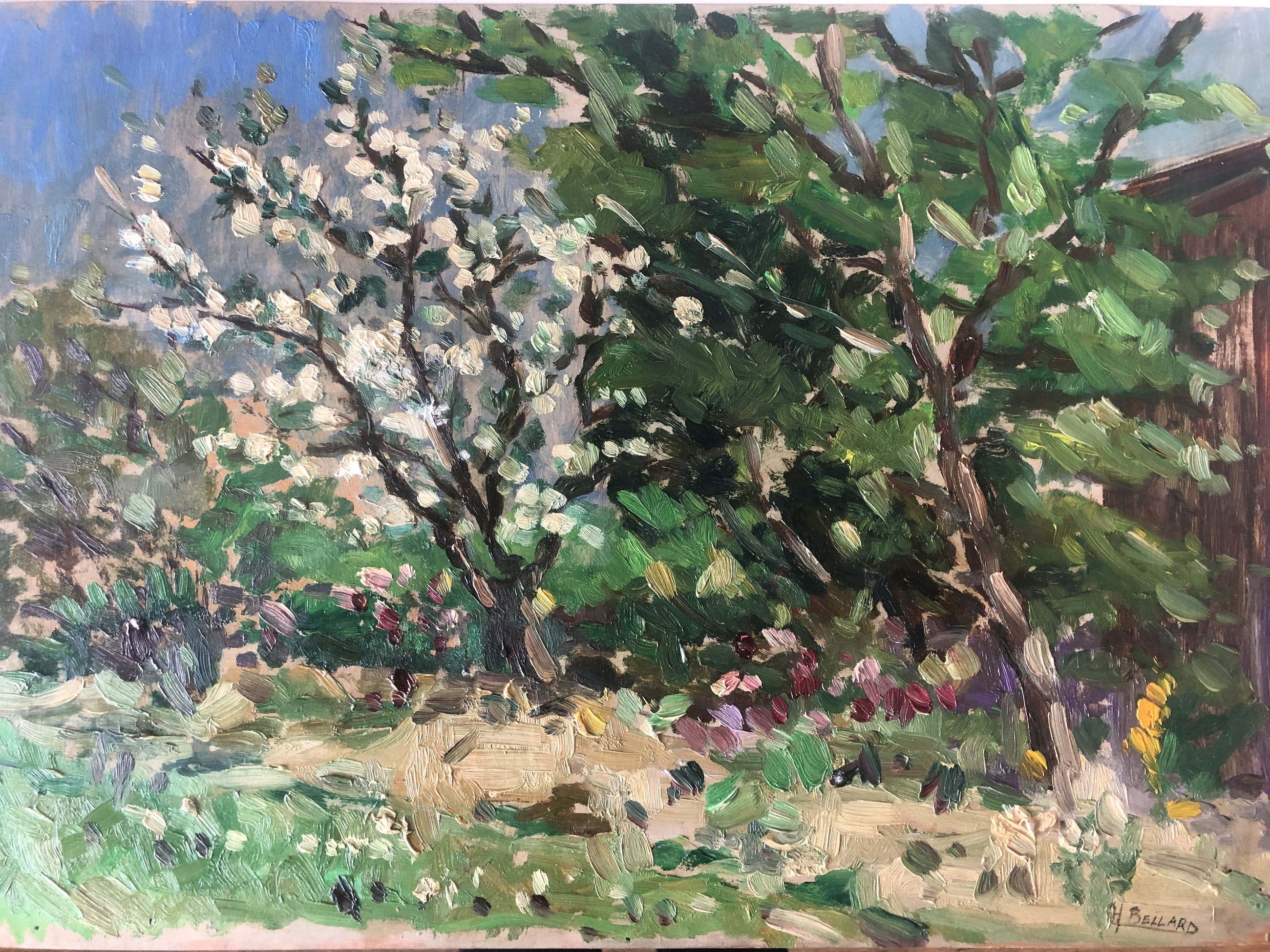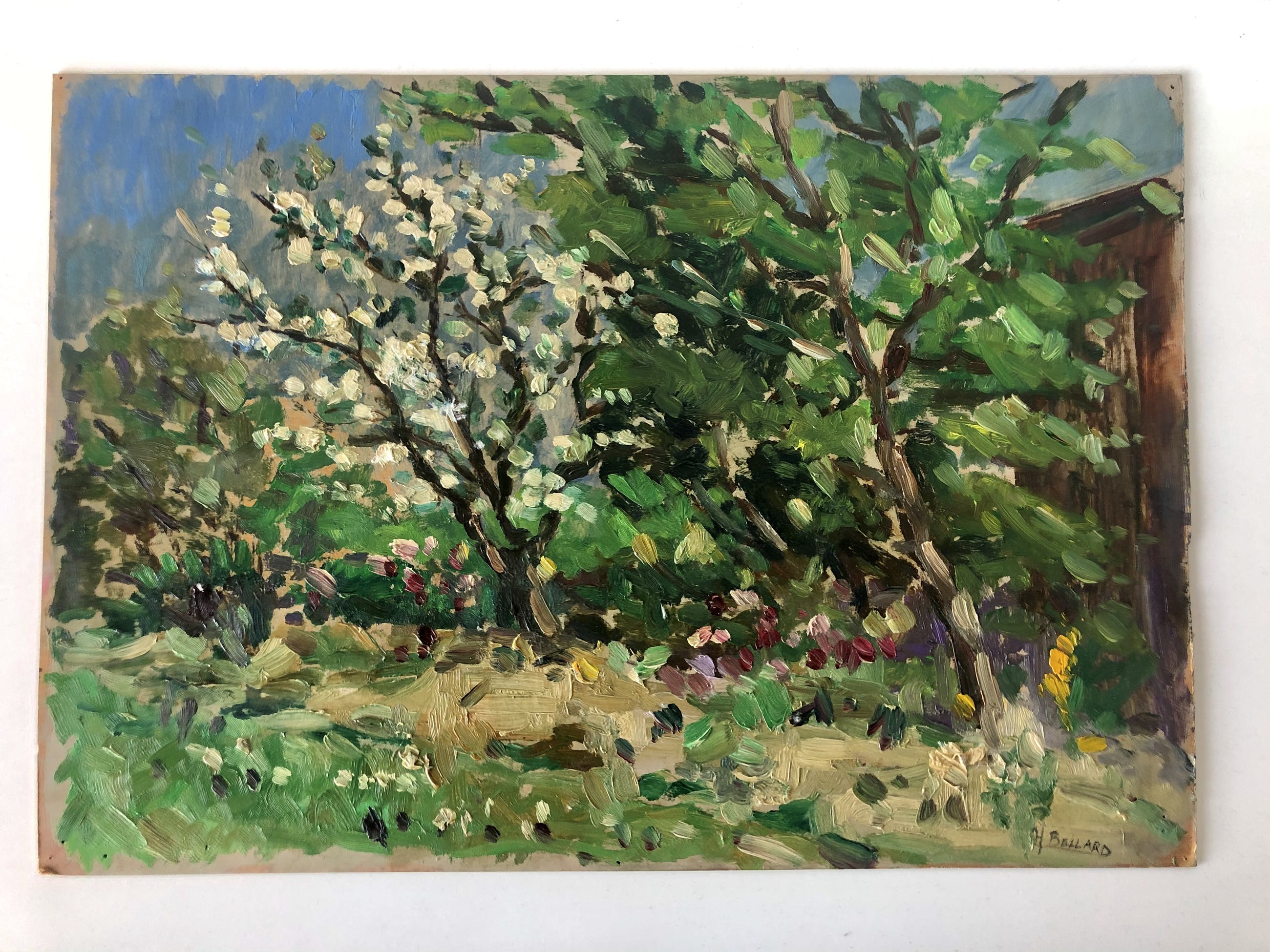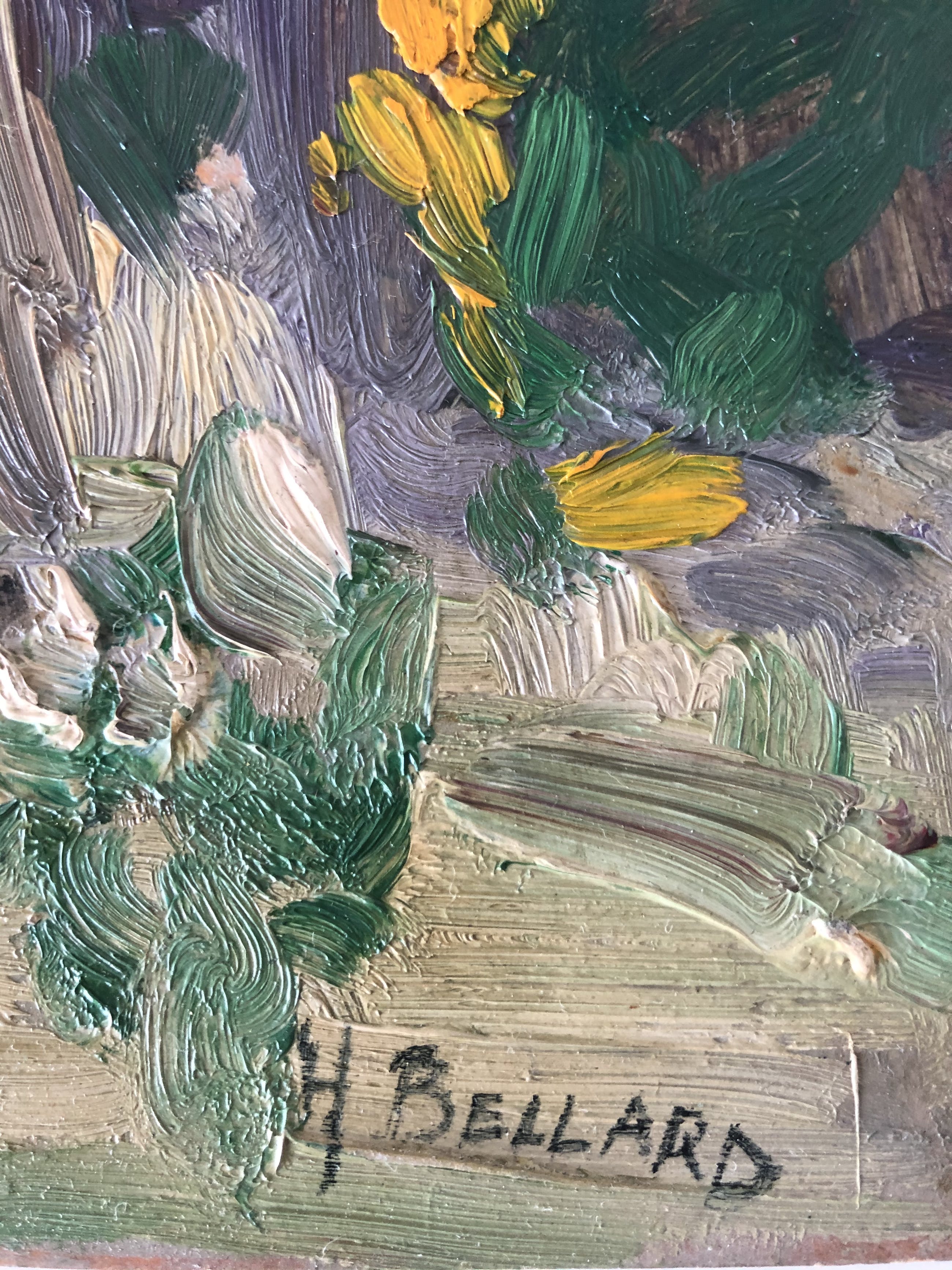 Landschap van kunstenaar en Artibus leraar Henk Bellaard. Vlotte stijl en dik in de verf. Gesigneerd als Bellard, handschrift komt overeen met ander werk van de kunstenaar en de provenance is bekend.