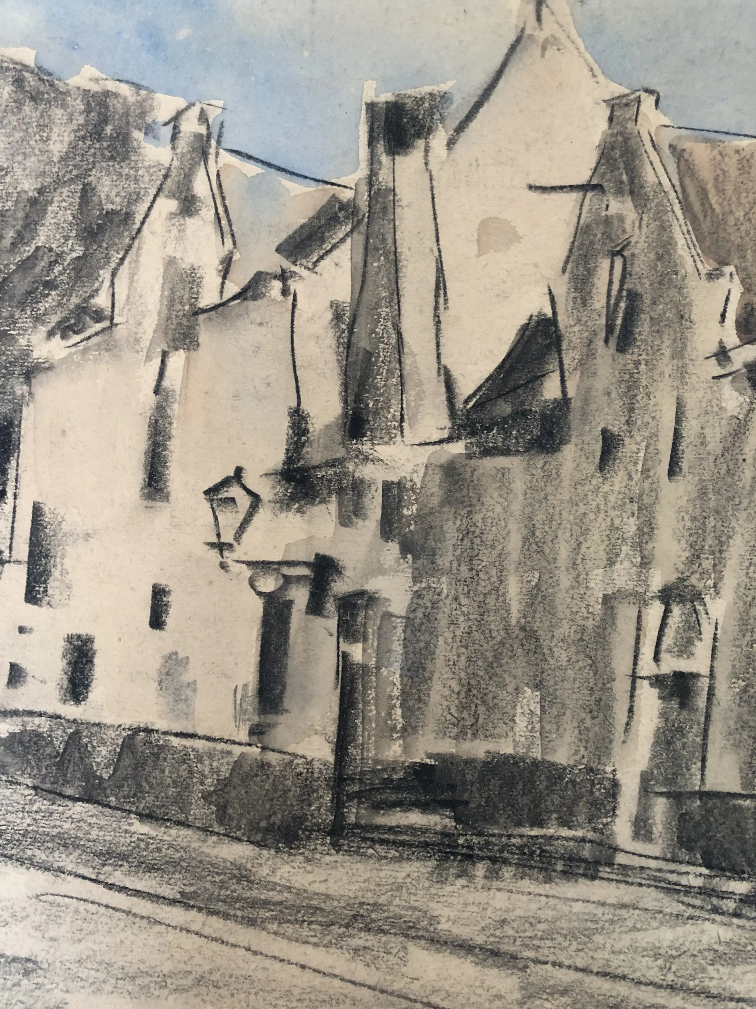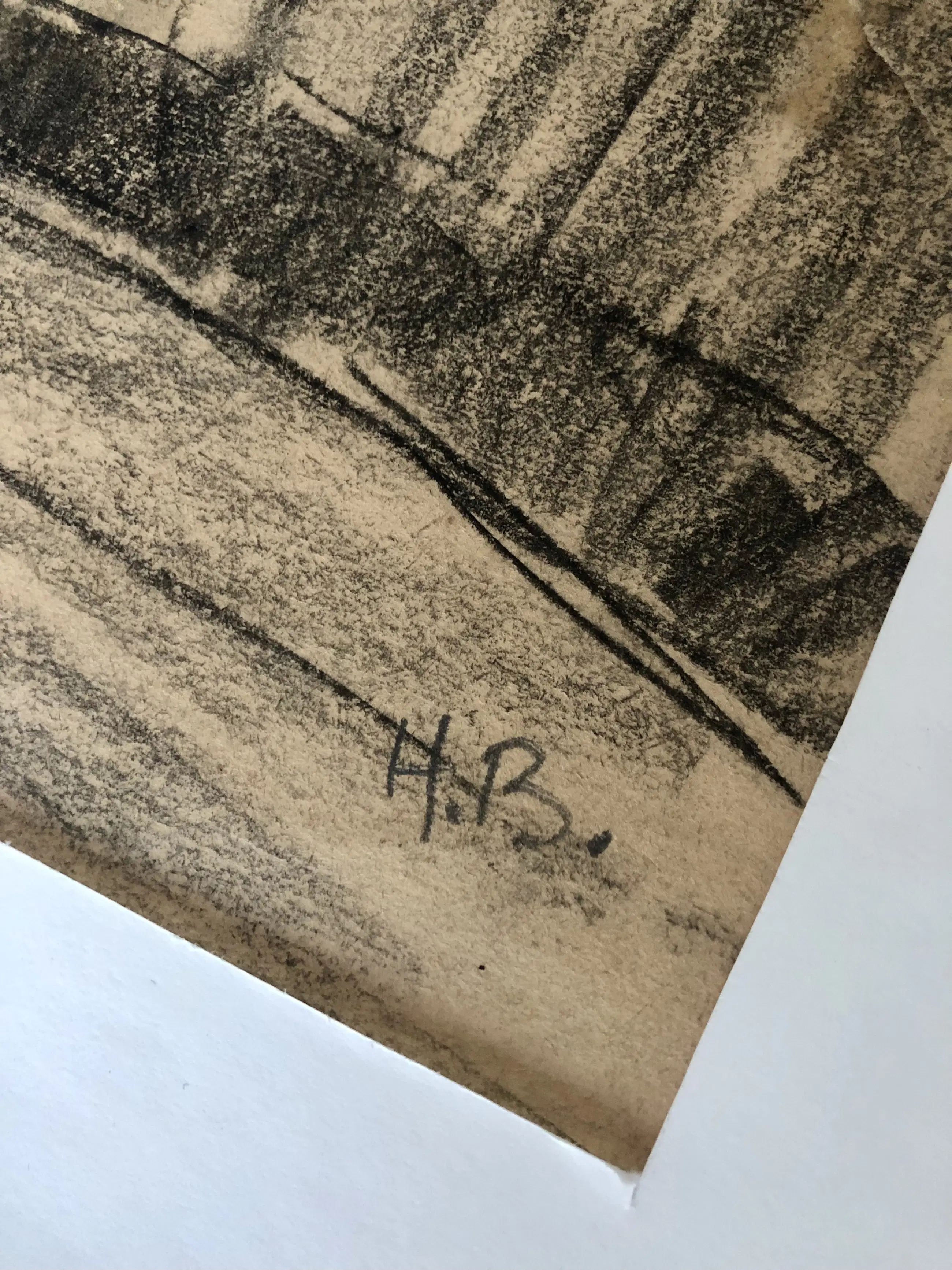Stads of dorpsgezicht van kunstenaar en Artibus leraar Henk Bellaard. In vlotte stijl getekend. Verso een havengezicht met vissende kinderen en boten.