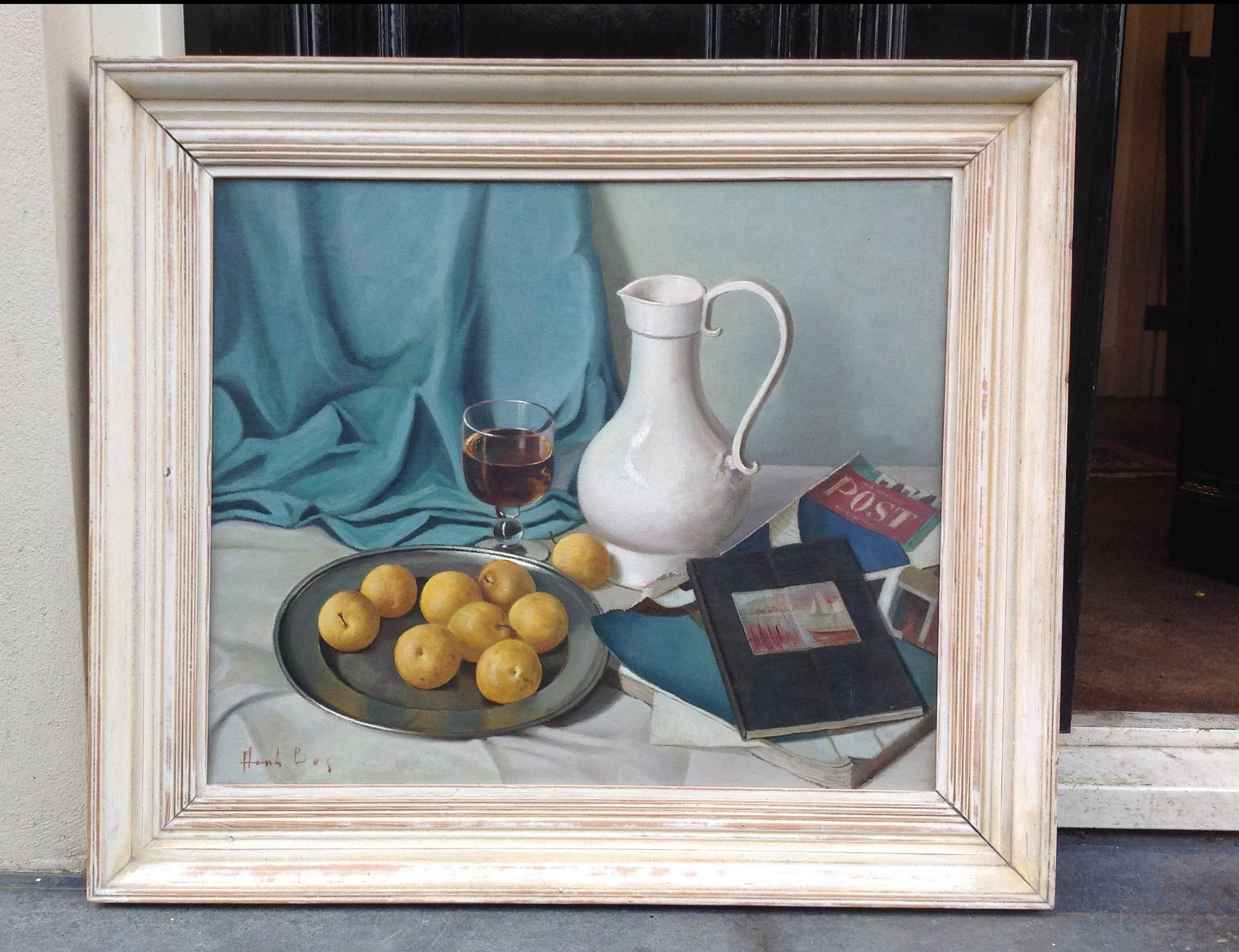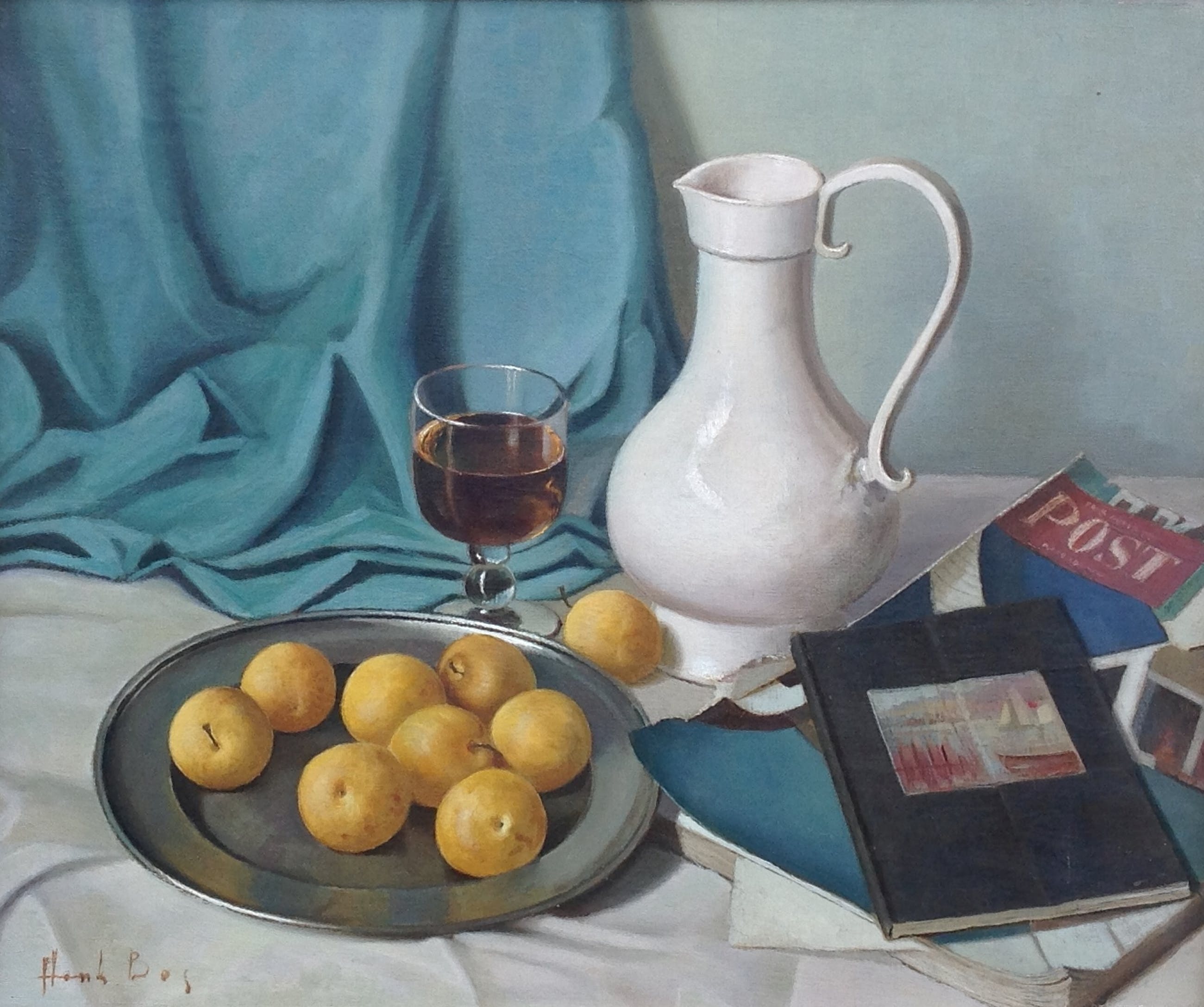 Henk Bos, stilleven met witte kan en wijnglas, l.o. gesigneerd, olieverf op doek, doekmaat 50 x 60 cm, lijstmaat 65 x 75 cm.