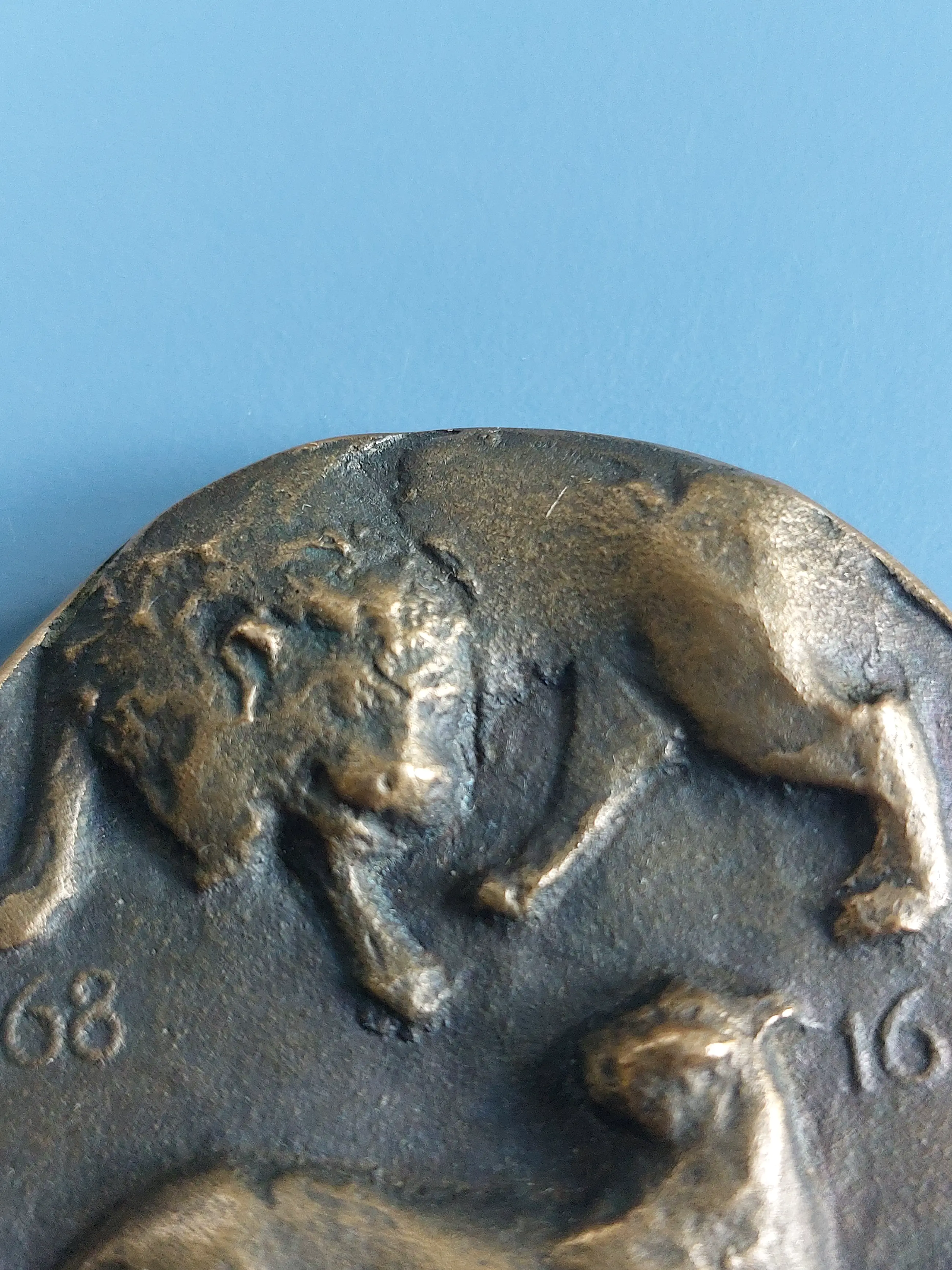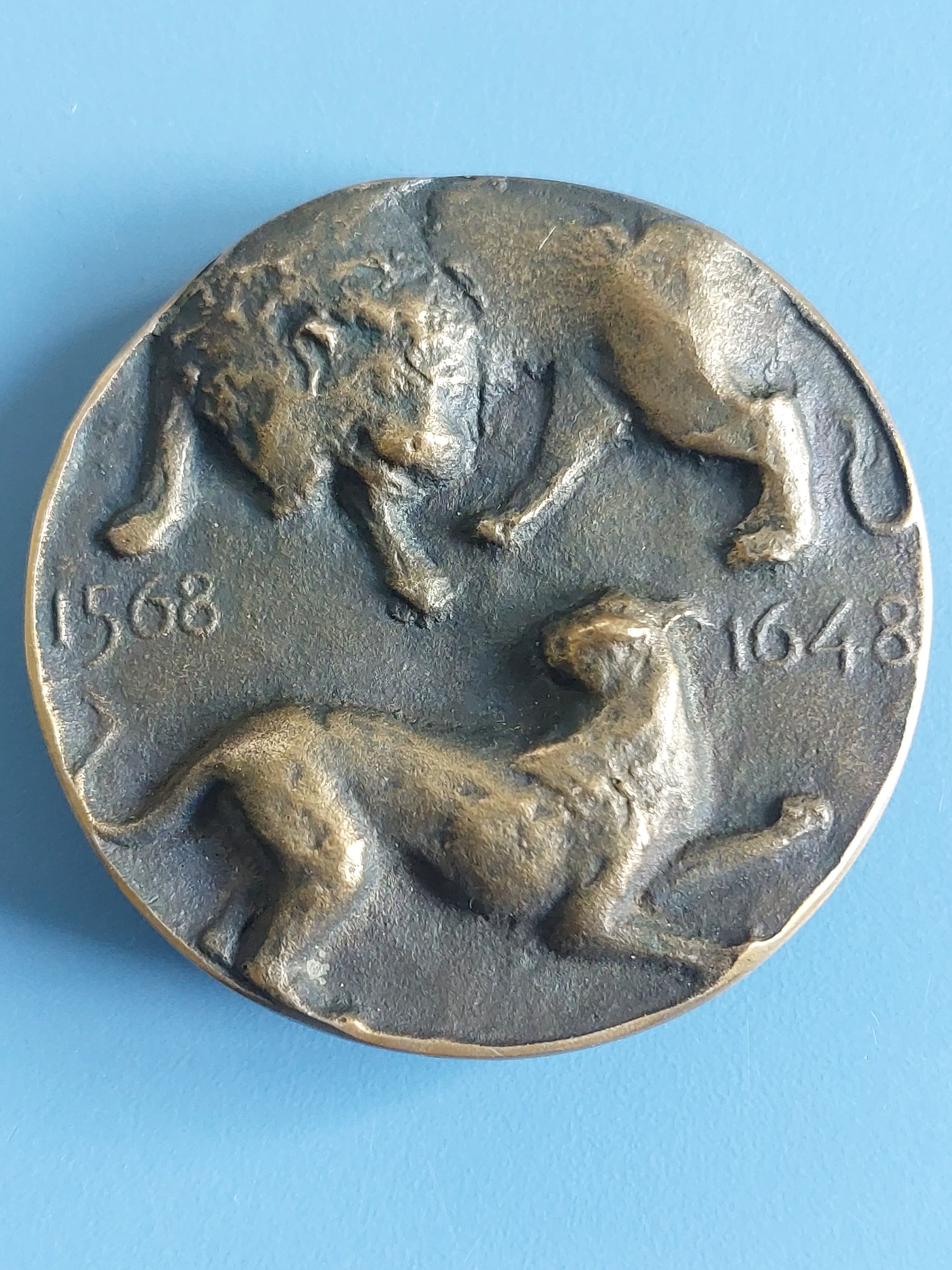 Een ingetogen portret van Willem van Oranje (1533-1584) met een bijna korrelig modelé waarin iets van de vroege ouderdom van de geportretteerde met zijn kapje doorschemert. Dannenburg, leerling van Bronner, boetseerde een ondoorgrondelijk gezicht met een suggestie van een dunne baard. 'Pro lege, grege, rege', staat rond de kop te lezen. Voor recht, volk en koning. Een bekende spreuk die de Prins meermalen gebruikte in proclamaties in 1568 en de volgende jaren. Op de keerzijde - de penning draait, uitzonderlijkerwijs, om de horizontale as - symboliseren de leeuw en de panter, de strijd tussen de Nederlanden en Spanje. De medailleur kwam op het idee de vijand weer te geven als een panter door een prent die hij aantrof in Jan en Annie Romein's Erflaters van onze beschaving, waarop Margaretha van Parma staat afgebeeld in het gezelschap van een panter. De uitwerking van die gedachte is superieur: de cirkelvorm is een arena geworden waar de roofdieren gespannen en argwanend om elkaar been draaien. Het gevecht kan elk moment beginnen.