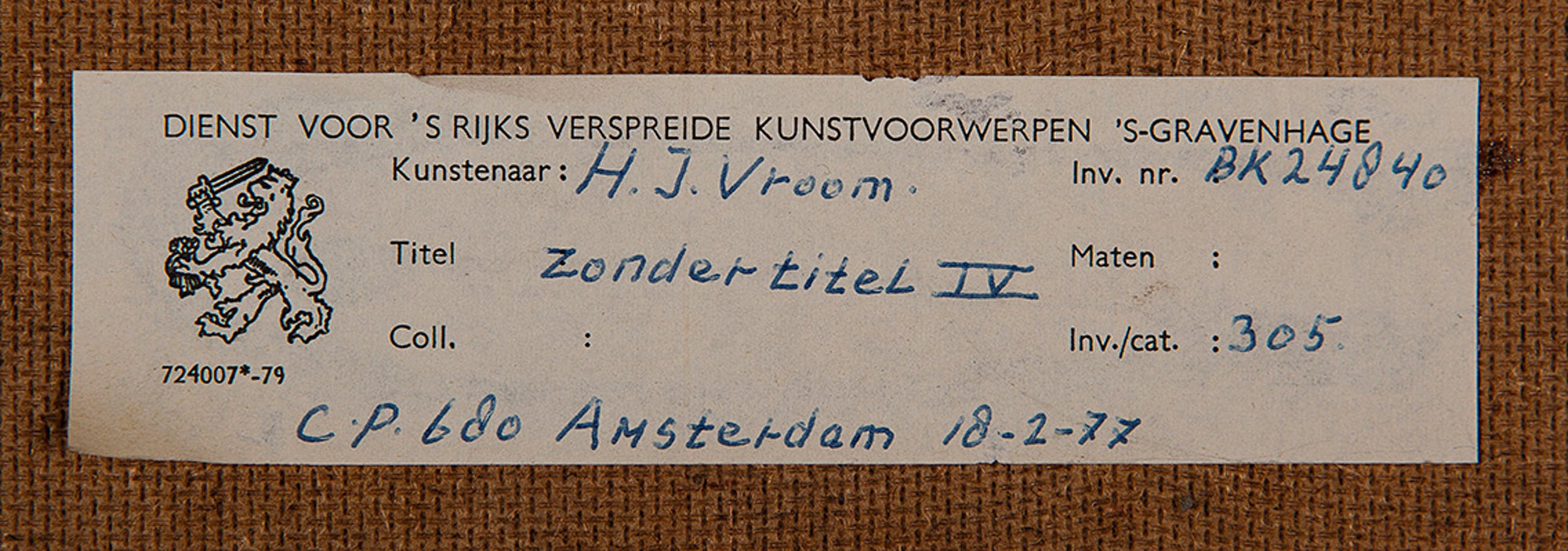 Herkomst: BKR Amsterdam (Het kunstwerk is afgevoerd uit de rijkscollectie in 2018)