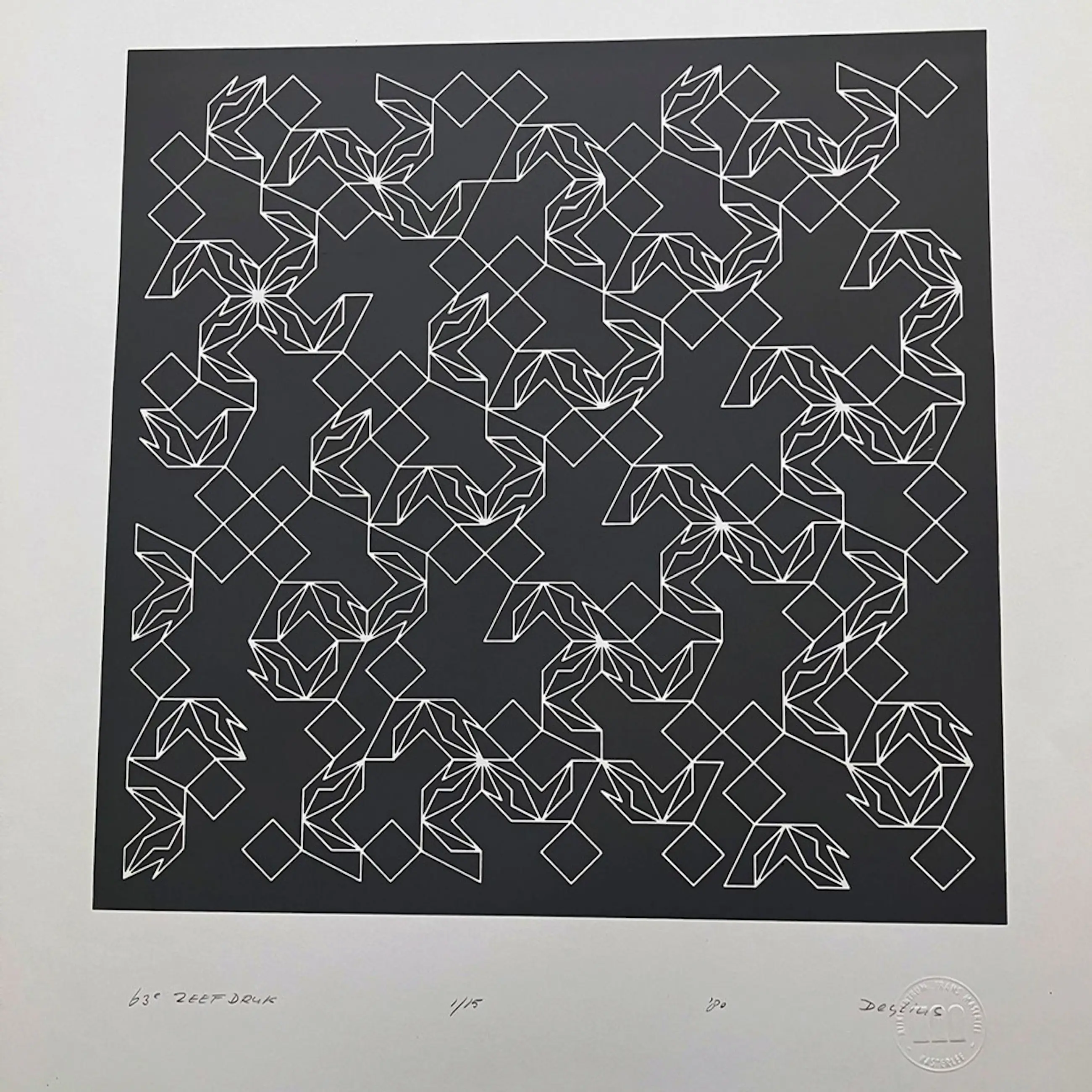 63e Zeefdruk van Henk Deylius (1920-1994), pionier van de computerkunst. Afm. papier 70 x 50 cm. Gesigneerd met potlood, gedateerd 1980, genummerd 1/15.