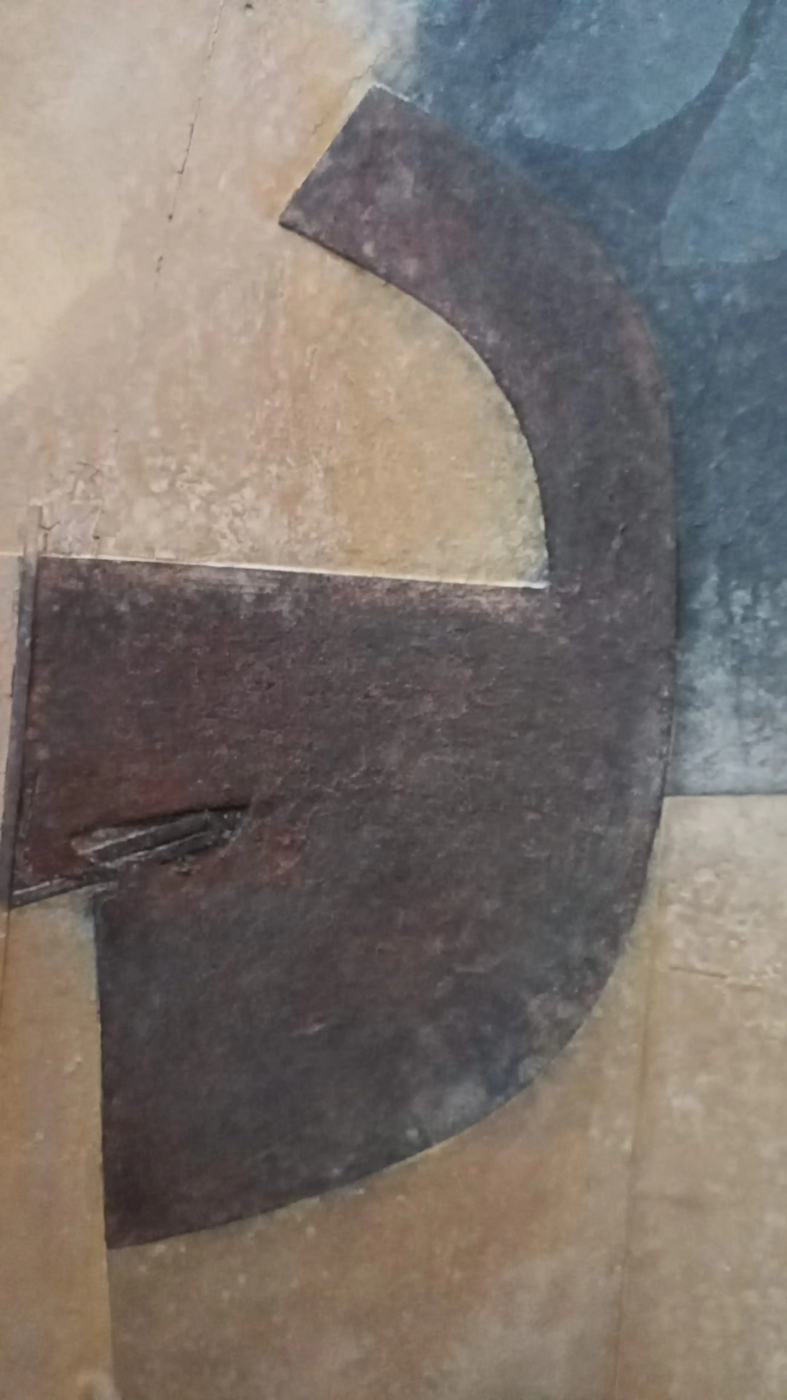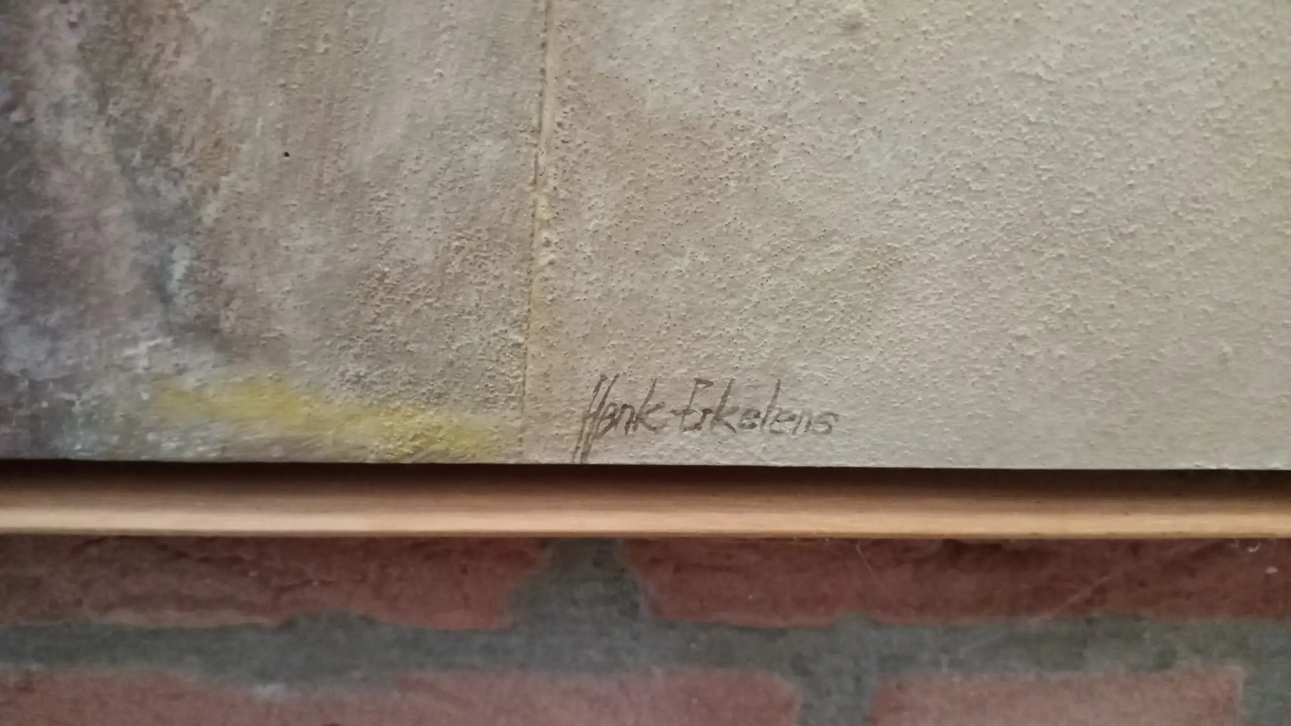 Het schilderij is geschilderd met gemengde techniek van klei, acrylverf op een paneel en is in de begin jaren 90 gekocht bij galerie Het Weefhuis te Nuenen