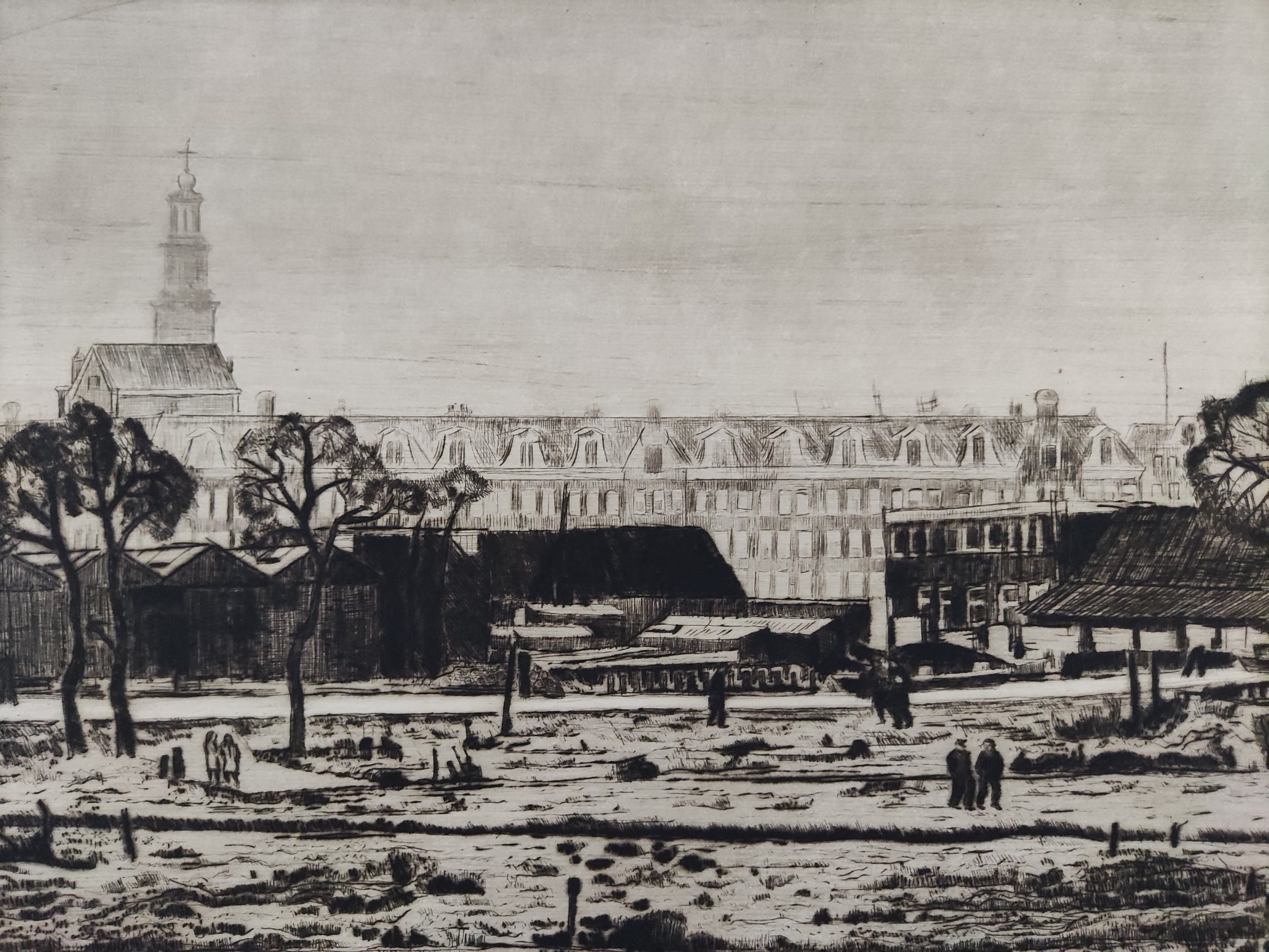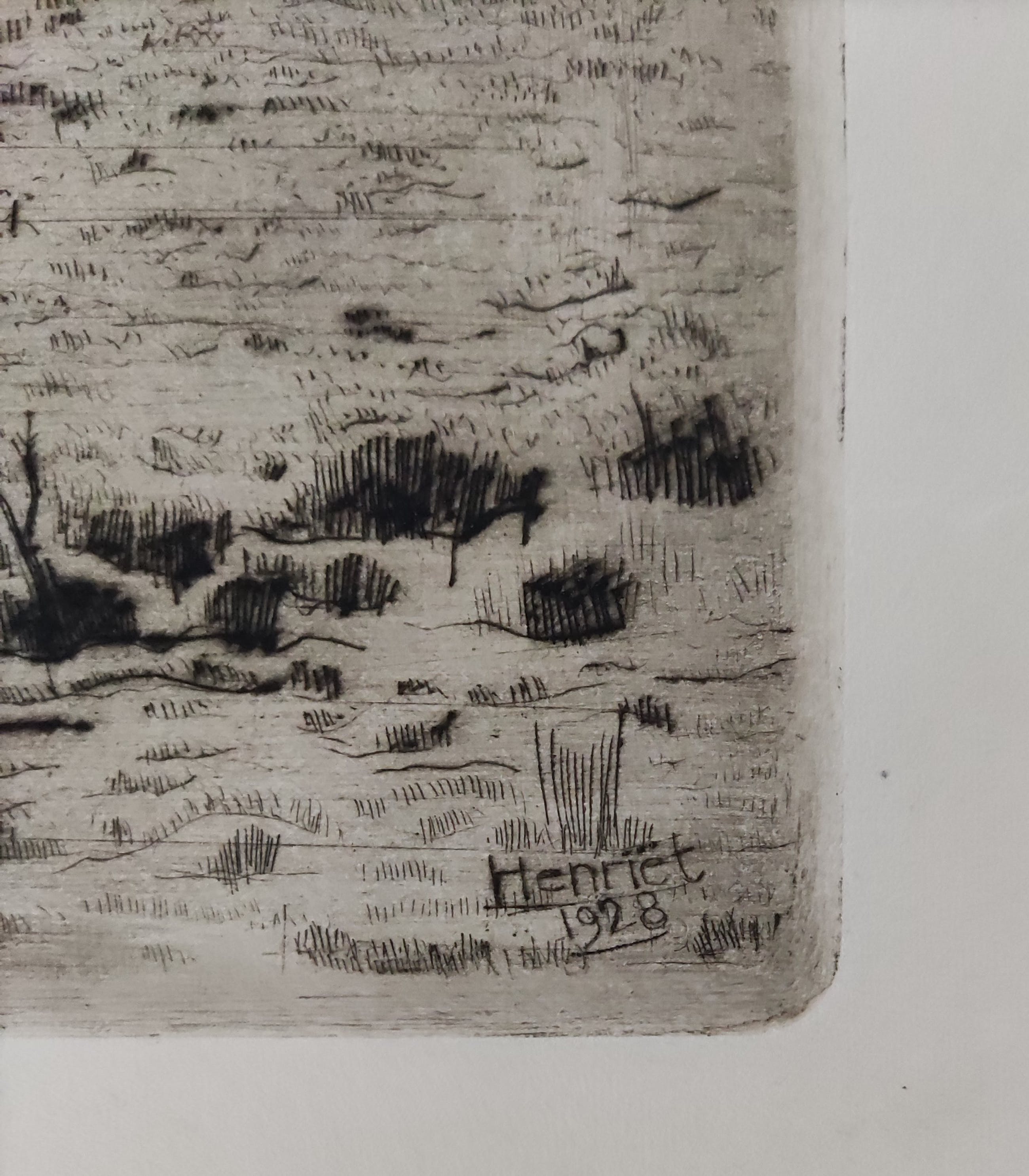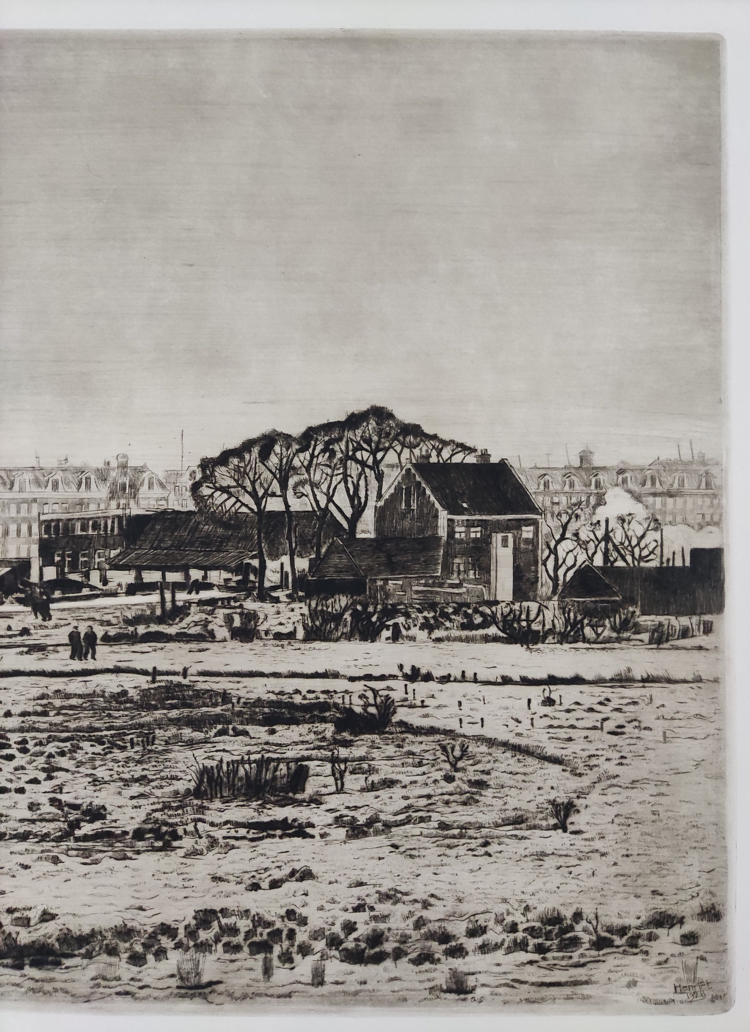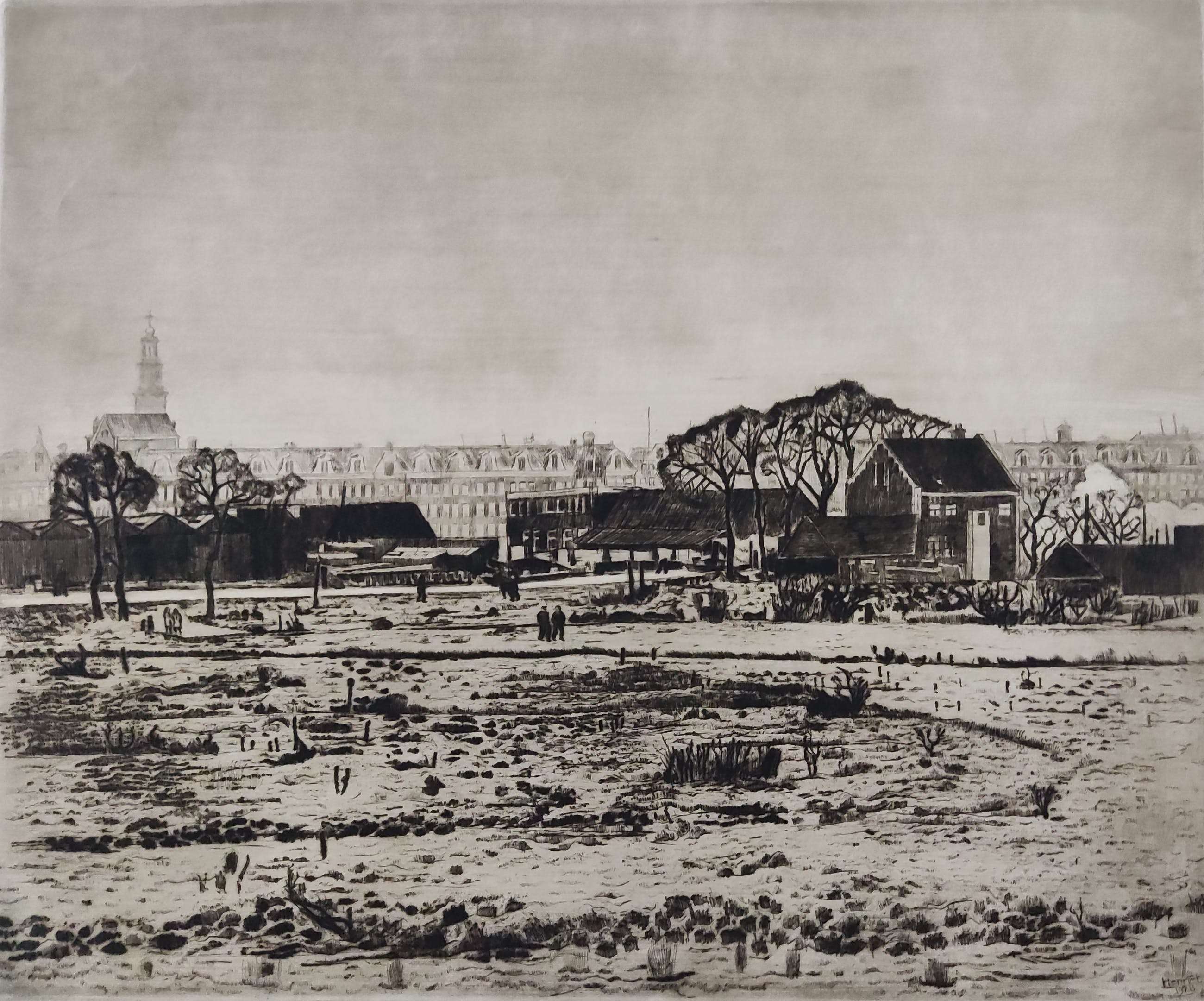 Fraaie grote ets met een gezicht op de stadsuitbreiding van Amsterdam-Zuid. In de plaat gesigneerd en gedateerd 1928 linksonder. Beeldmaat 49x59 cm. Bladmaat 65x76 cm. Losbladig. Henk