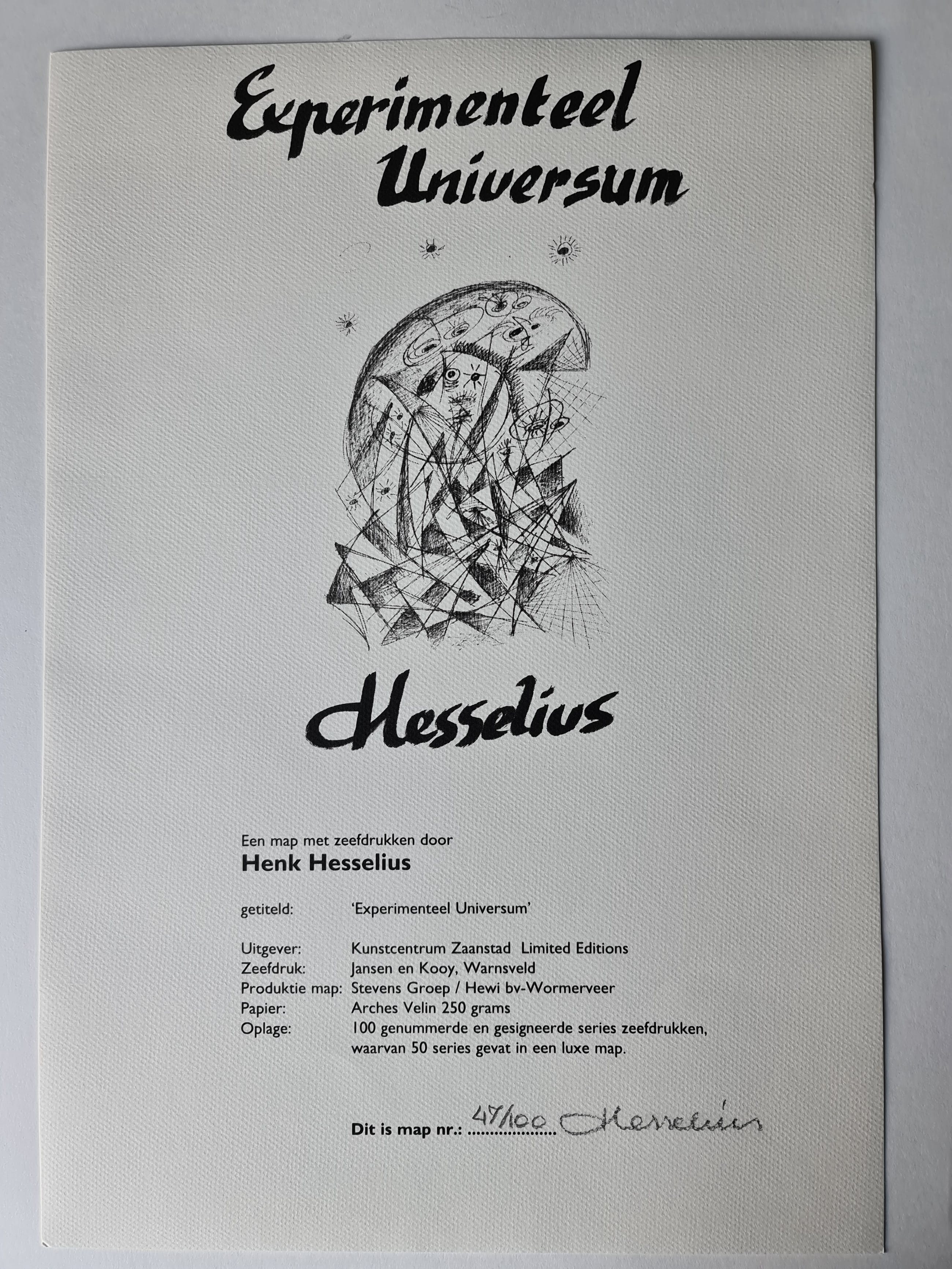 Map met 6 zeefdrukken door Henk Hesselius getiteld 'Experimenteel Universum', gedateerd 1948-1997.