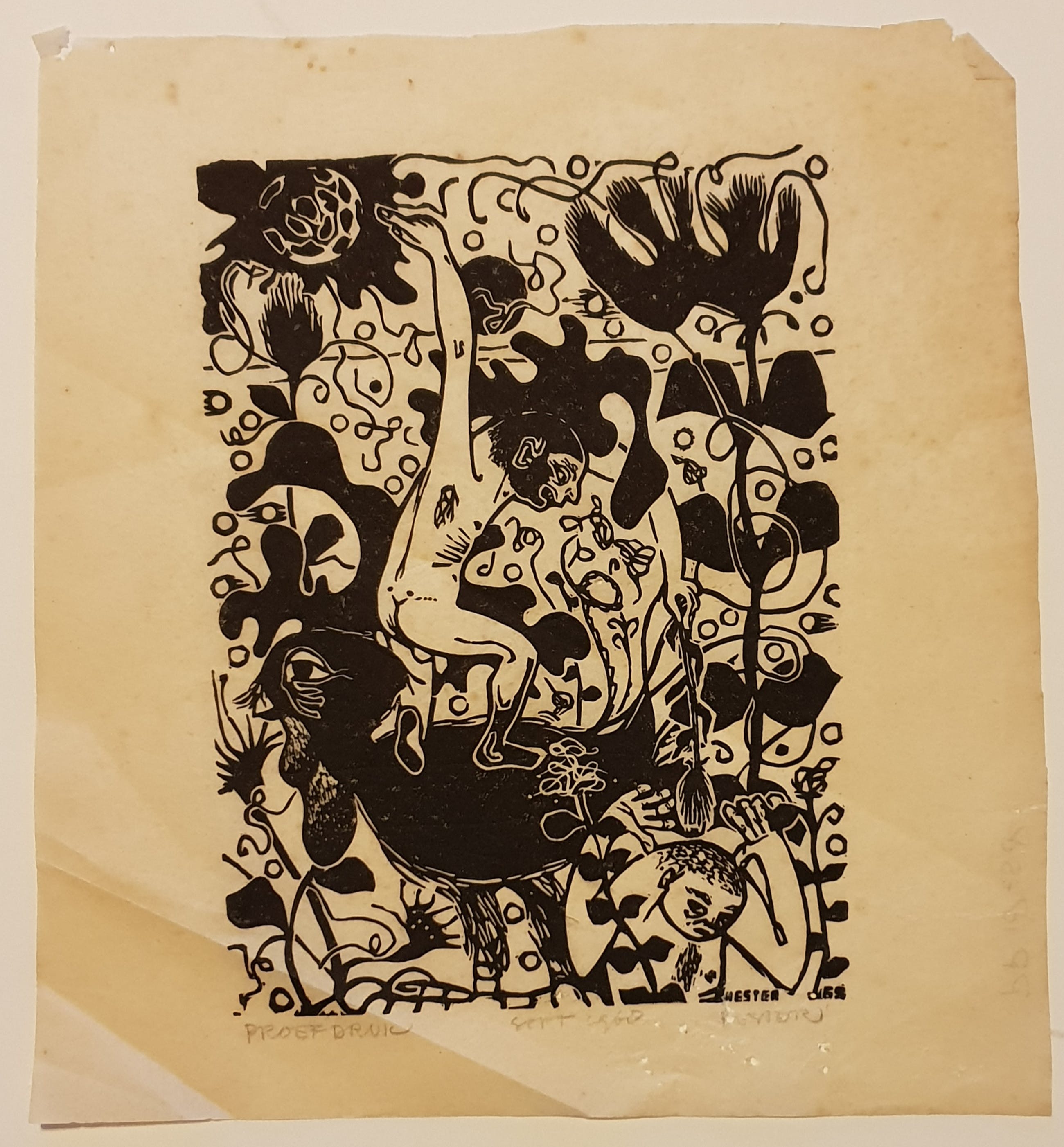 Henk HesterHoutsnedeProefdrukR.o. gesigneerd en gedateerdsept. 1968 HesterBeeldmaat 13,50 x 18 cmPapiermaat ca. 21 x 32 cm