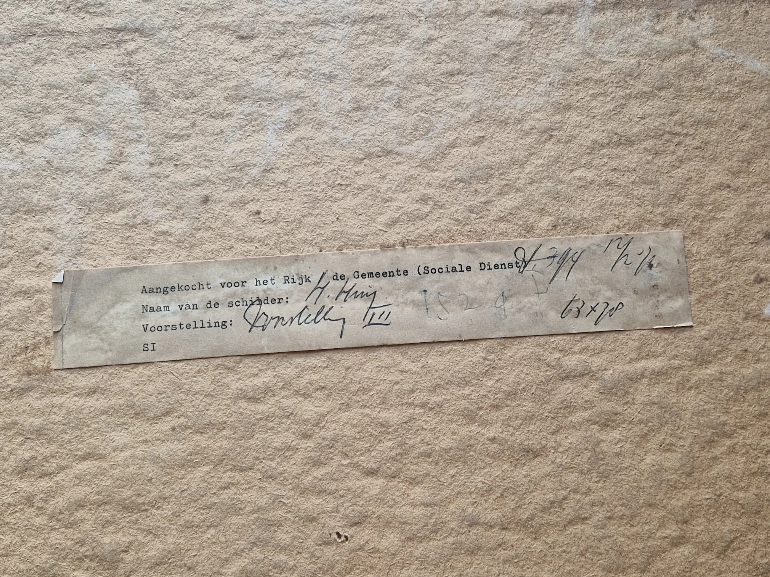 - Fraaie expressionistisch geschilderde jaren 60 (1969) gemengde techniek ( olieverf, aquarel, pastel e.a.) van de Amsterdamse beeldend kunstenaar henk Huig. Verkeert in goede conditie en zit in de originele (wel iets beschadigde) lijst. Op de achterzijde door de kunstenaar getiteld en gedateerd.