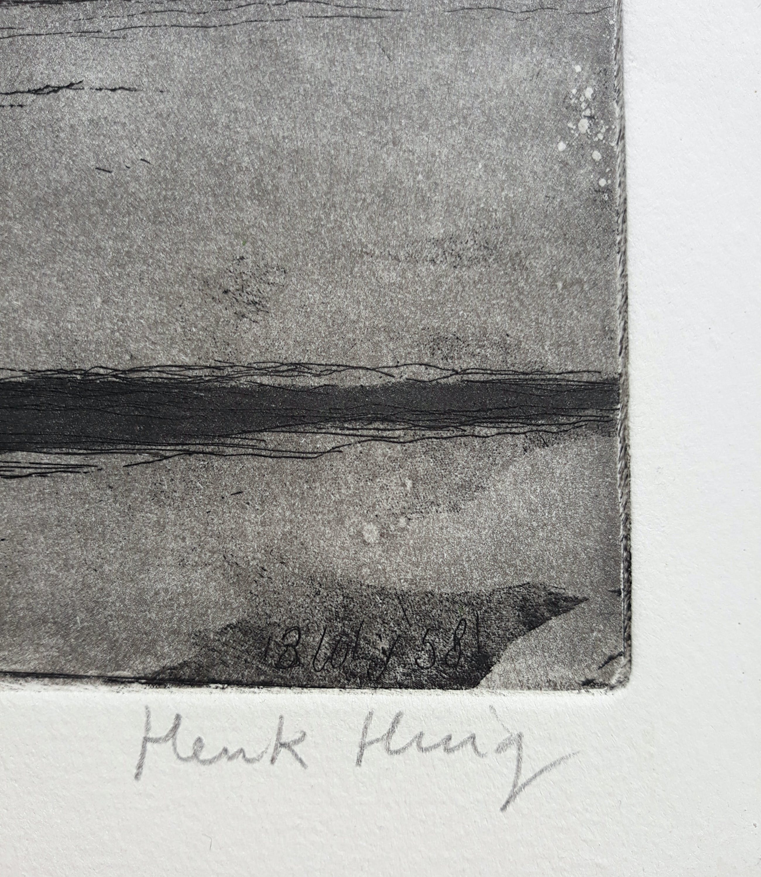 Aquatint ets op geschept papier, met potlood gesigneerd, getiteld en genummerd (4/20) en in de plaat gedateerd (18-july?-58). In goede conditie; er zit alleen een gerepareerd scheurtje in de witte marge midden onder.