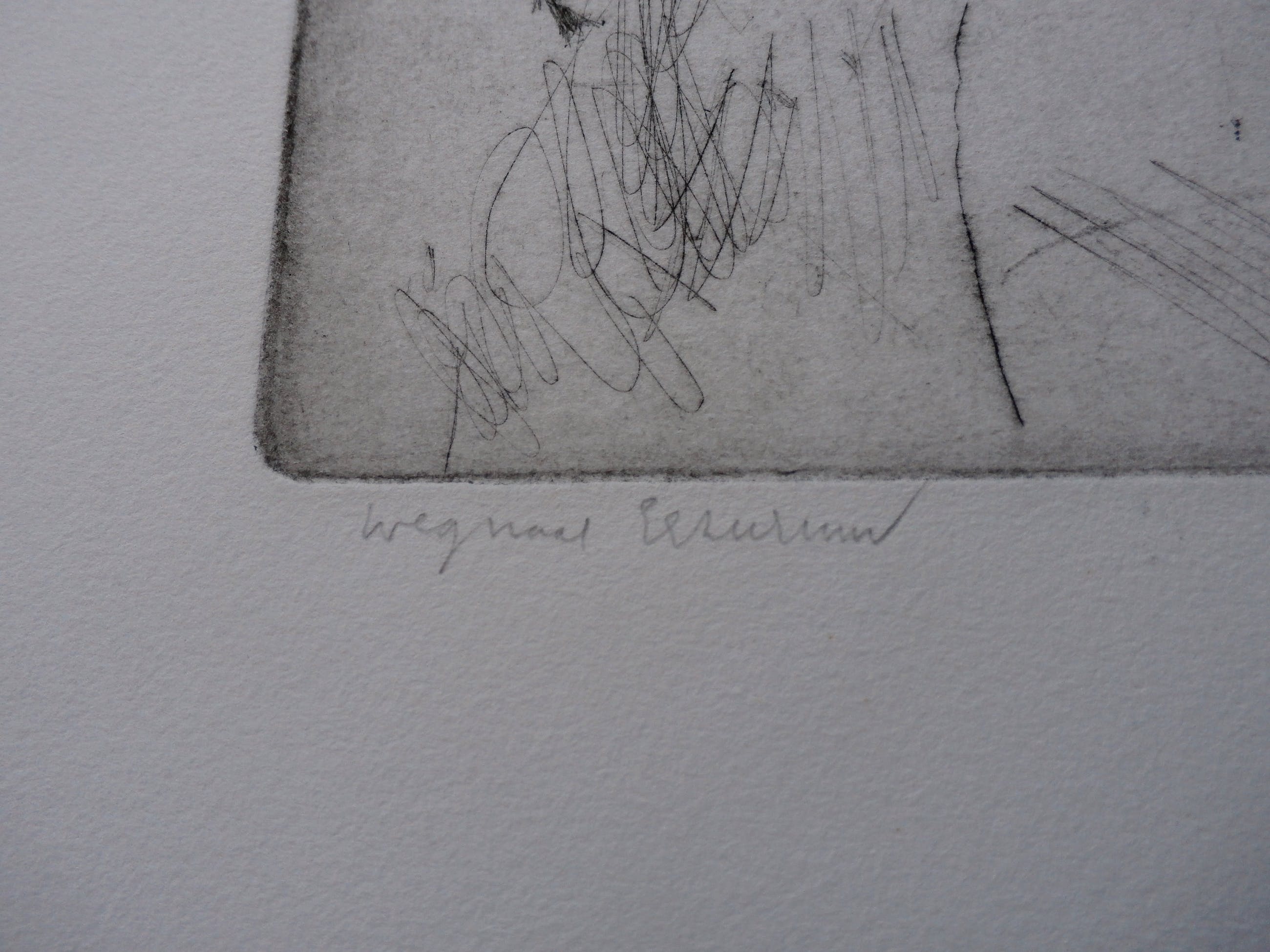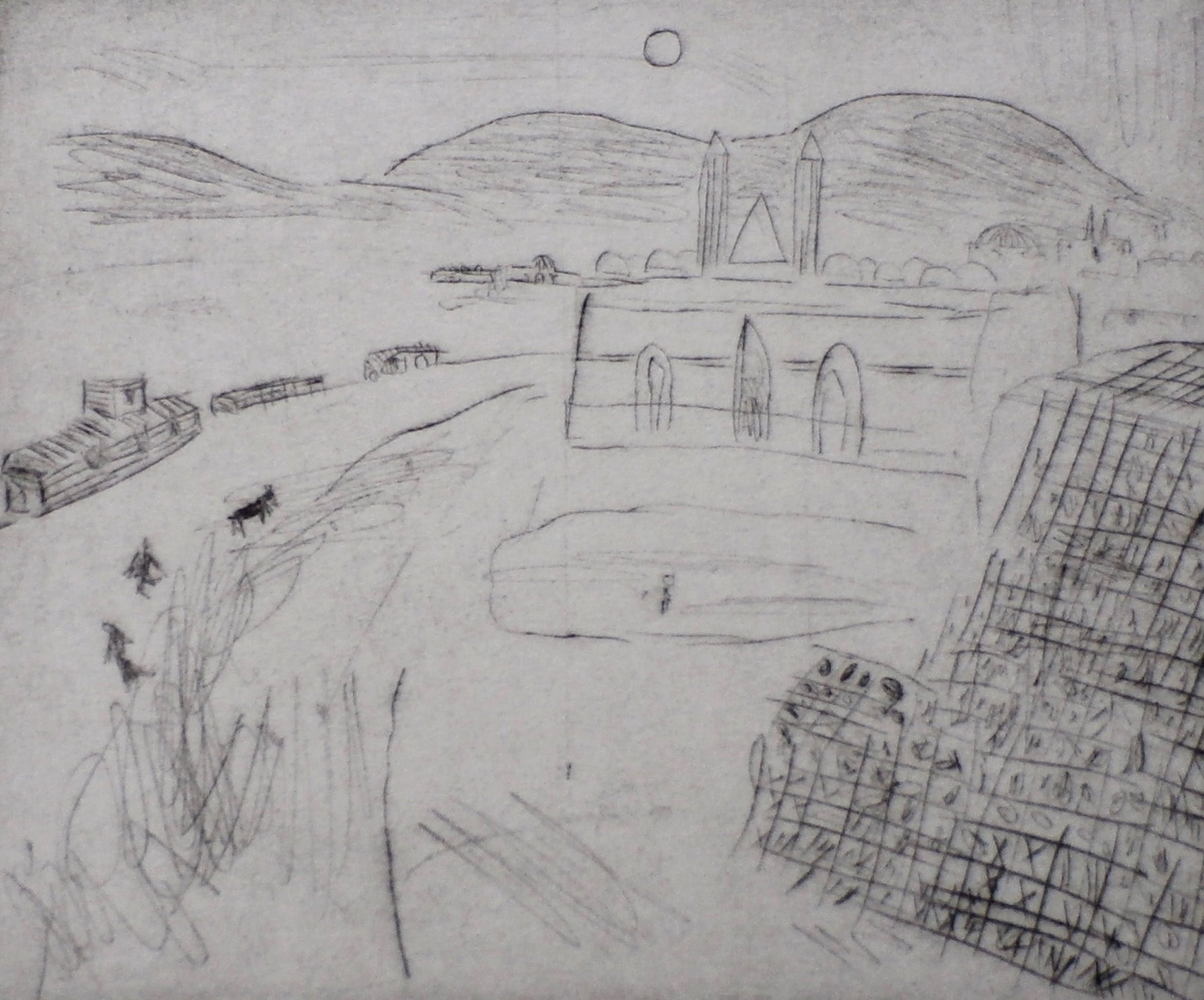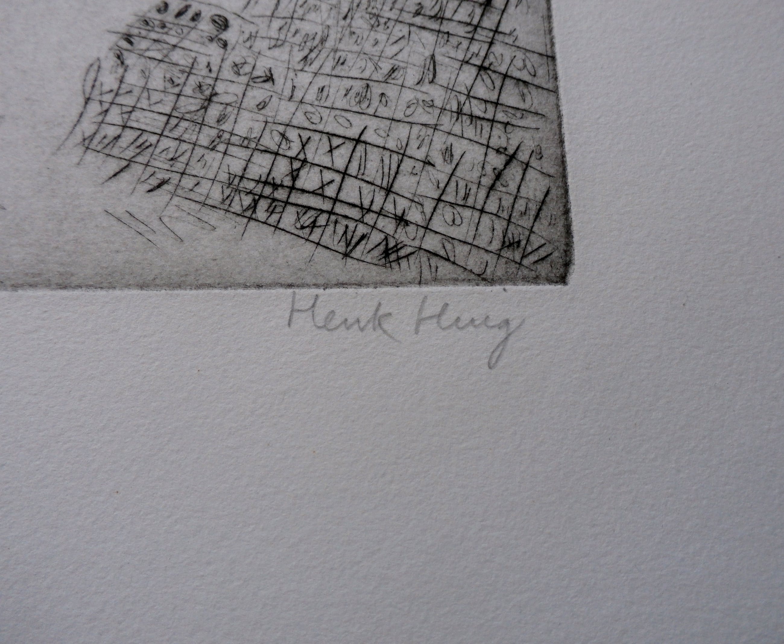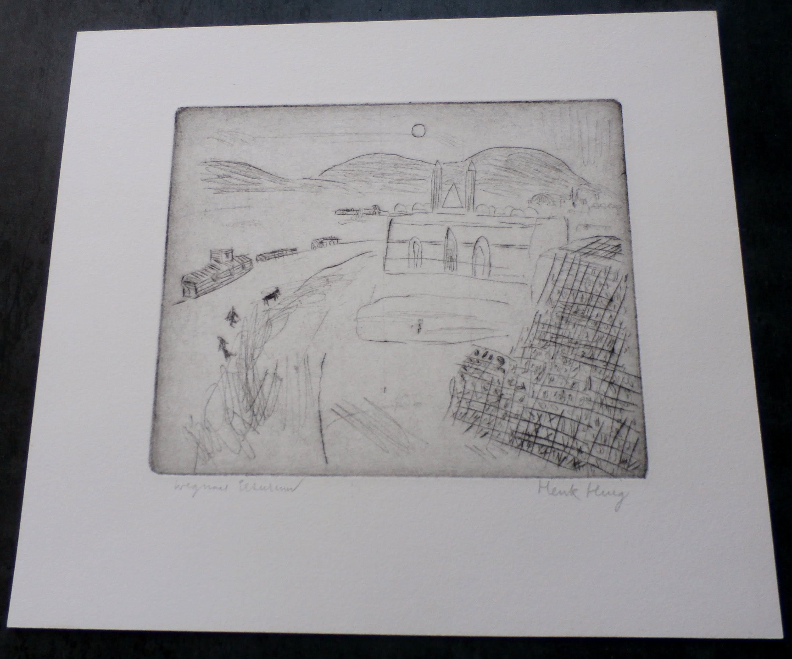 Ets van Henk Huig. Titel: weg naar ... Het werk is rechtsonder, met potlood, gesigneerd door de kunstenaar.