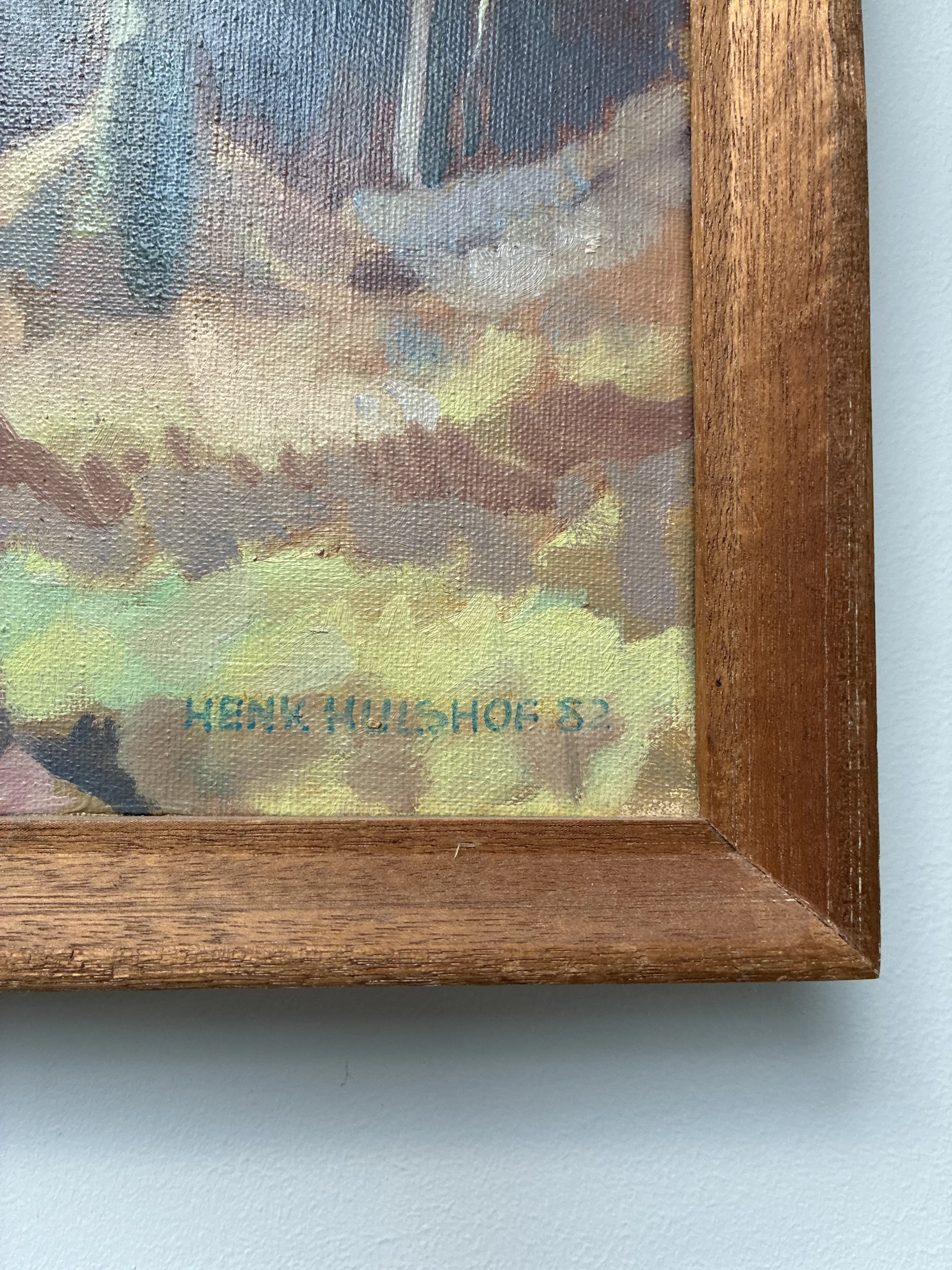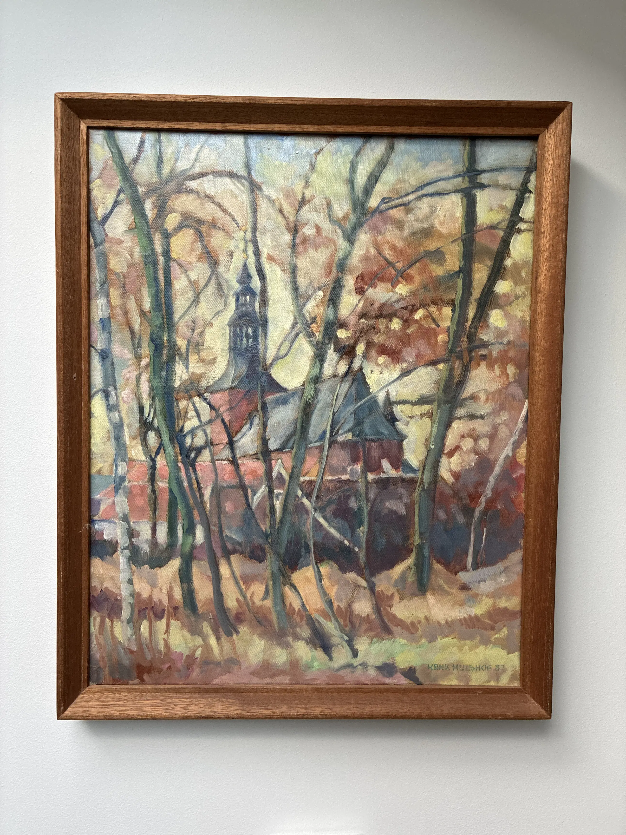 Abstract schilderij waarin takachtige lijnen een gelaagd kleurveld van warme aardetinten en koele blauwen doorkruisen. Tussen de vormen is een kerk zichtbaar, subtiel opgenomen in het geheel, alsof zij verscholen ligt achter bomen of herinneringen. Het werk combineert natuur en architectuur en roept een sfeer op van verstilling, tijd en contemplatie. Geschikt als karaktervol en verhalend kunstwerk voor interieur of collectie.