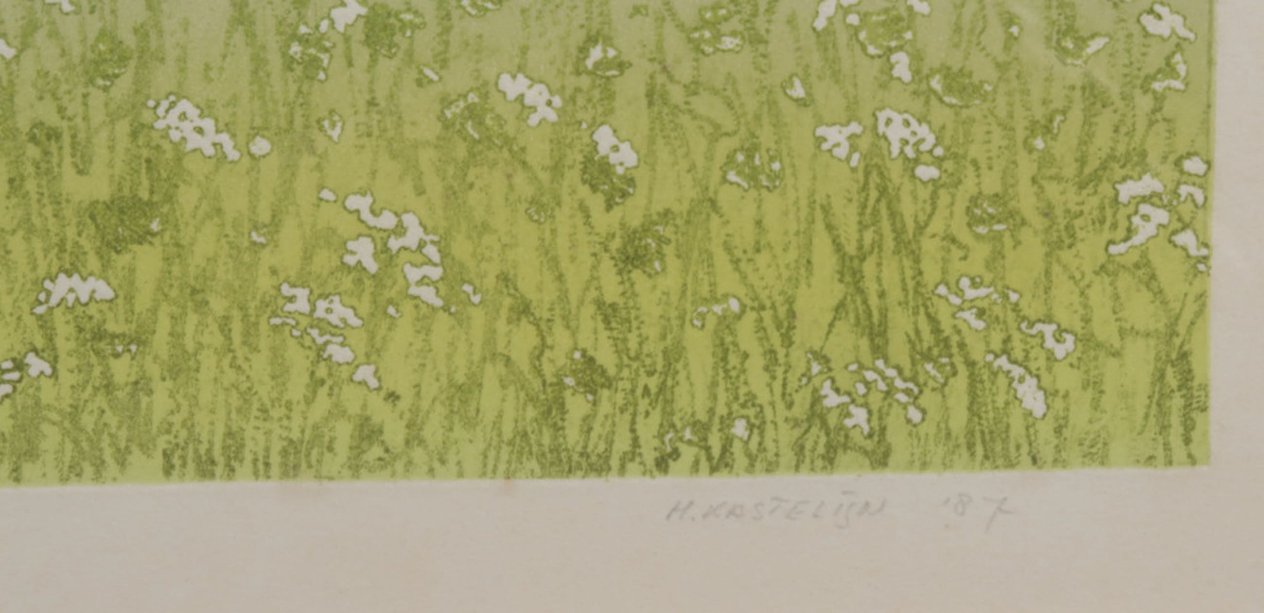 Conditie kunstwerk: In goede staat. Met oxidatiestipjes in het beeld en in de randen van het blad. De randen om het beeld heen zijn licht/egaal vergeeld.