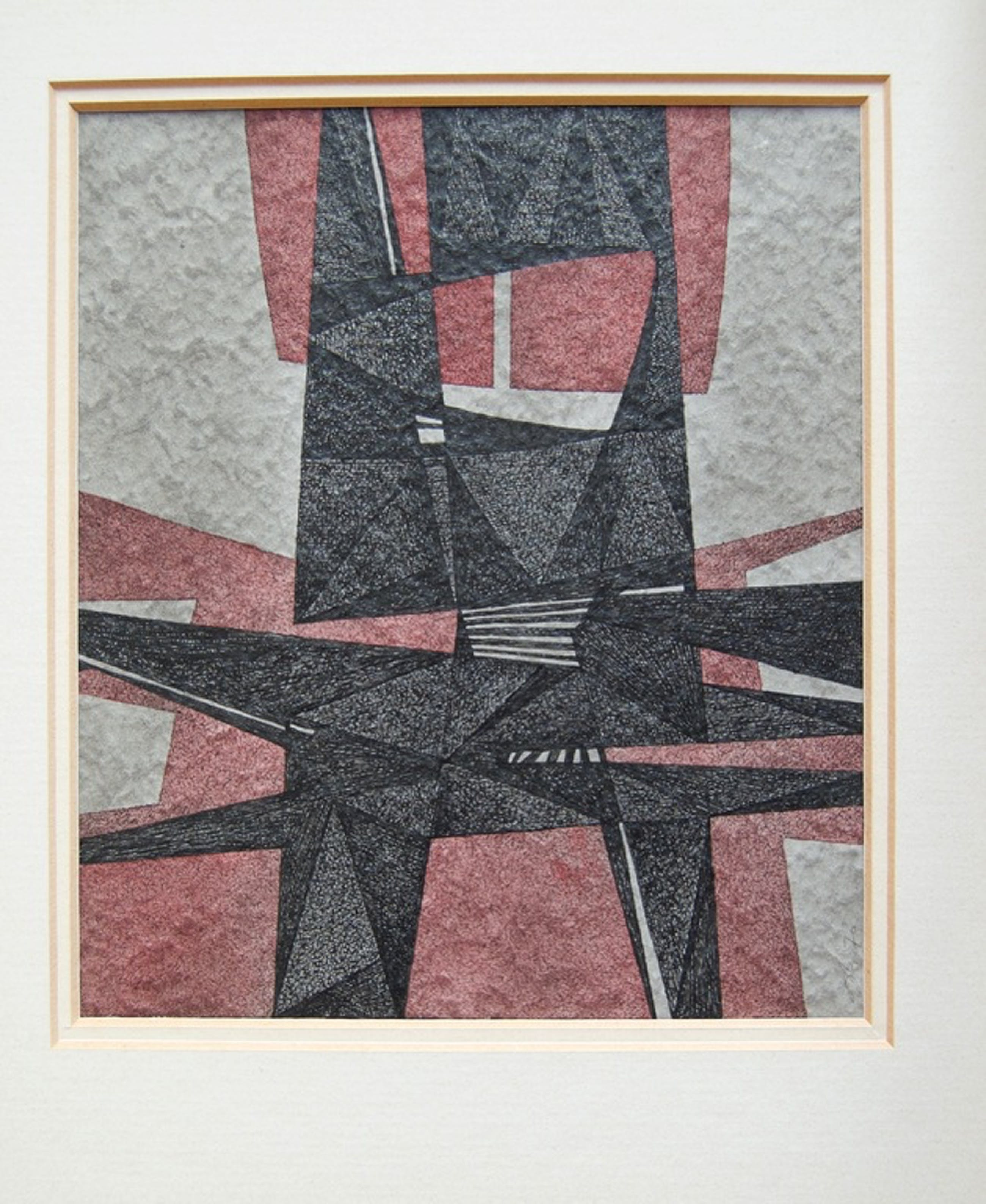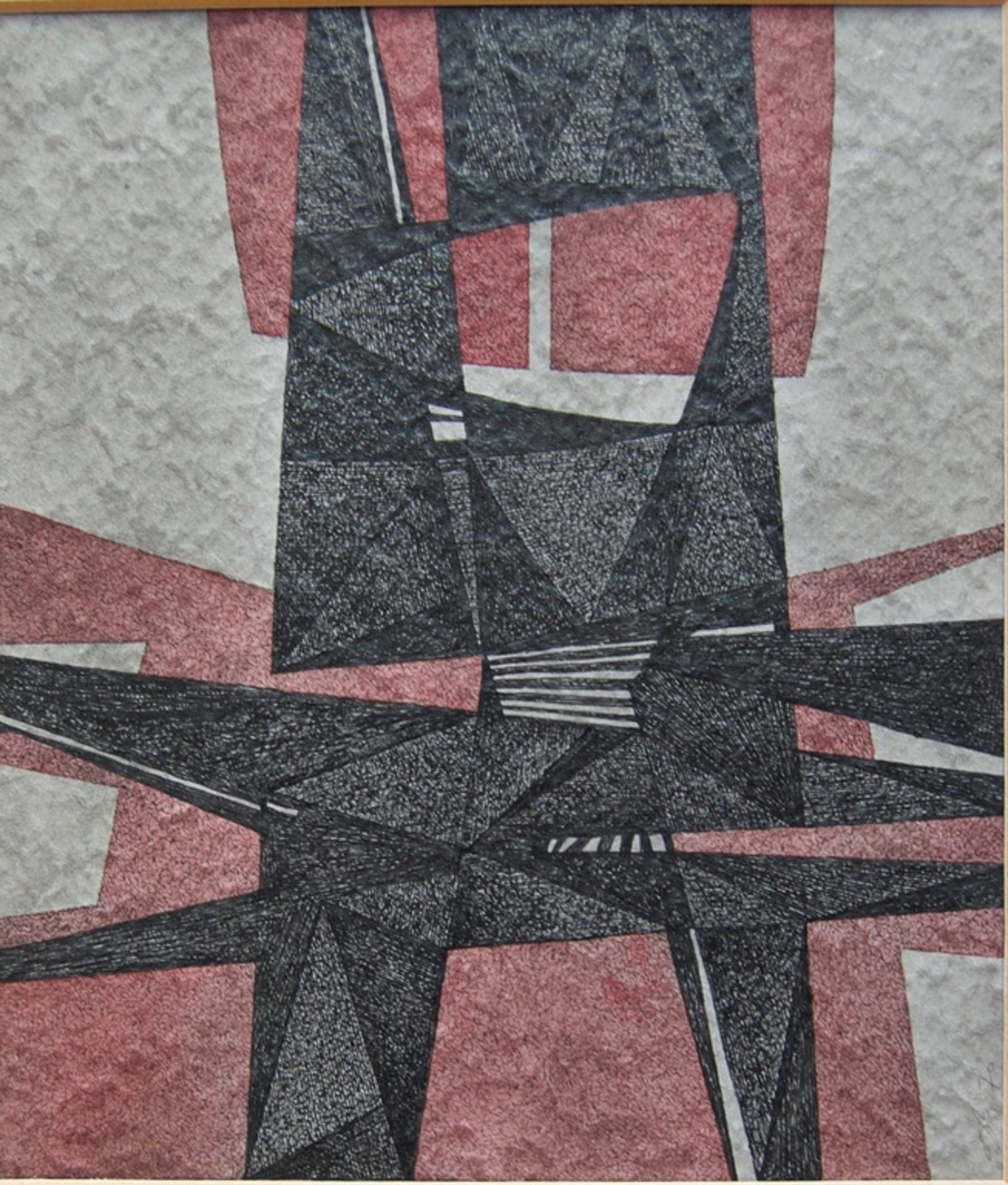 Interessant uniek abstract werk op papier door Henk Krijger. Pen en inkt in zwart, waterverf in rood, op grijs papier.