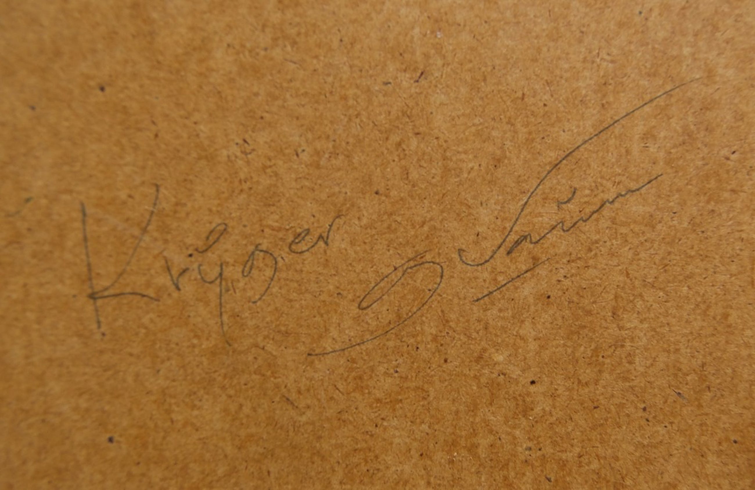 In dubbel passepartout, in aluminium wissellijst. Gesigneerd op de achterzijde van het board van de lijst: 'K' en 'Krijger' en (onleesbaar) 'SVarim' (?). Niet gedateerd (ca. 1960). Goede staat.
