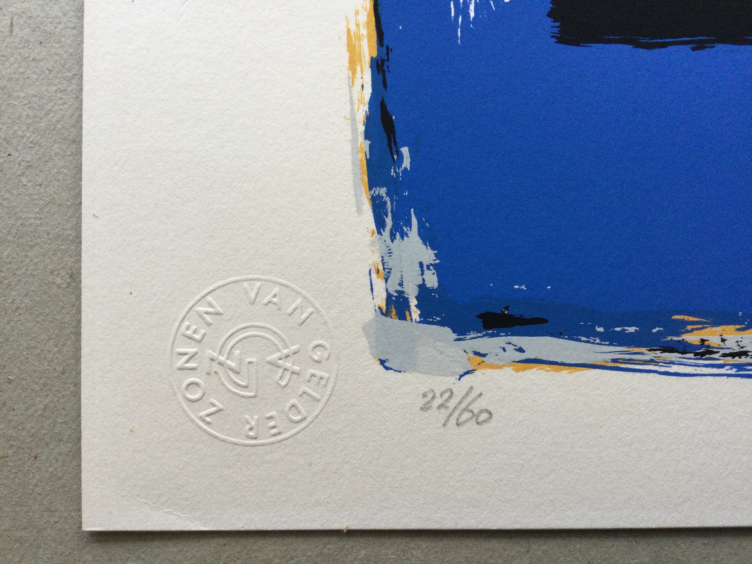 Frisse zeefdruk met heldere kleuren Op Van Gelder papier met blindstempel En blindstempel van drukkerij Het Drukhuis