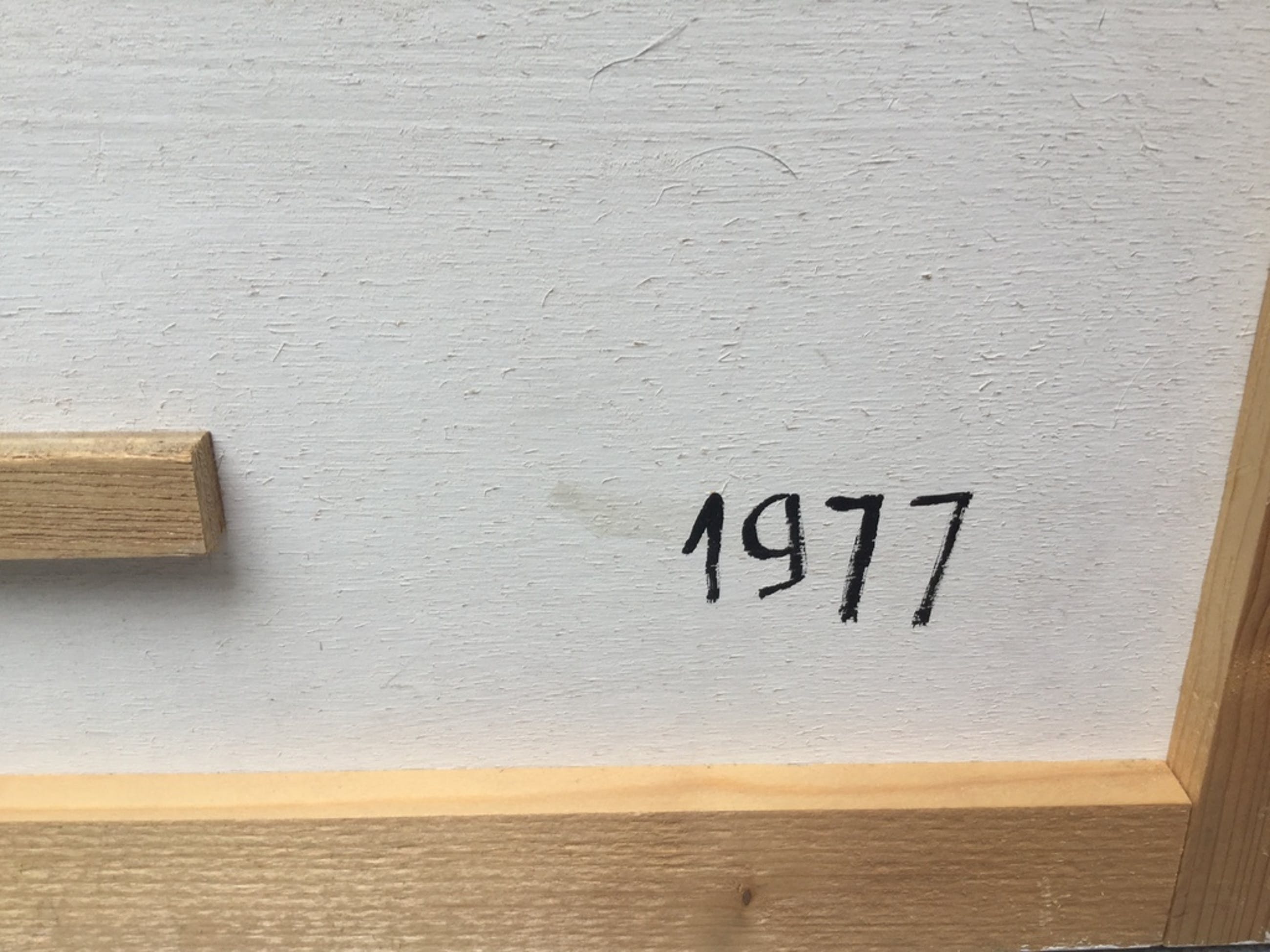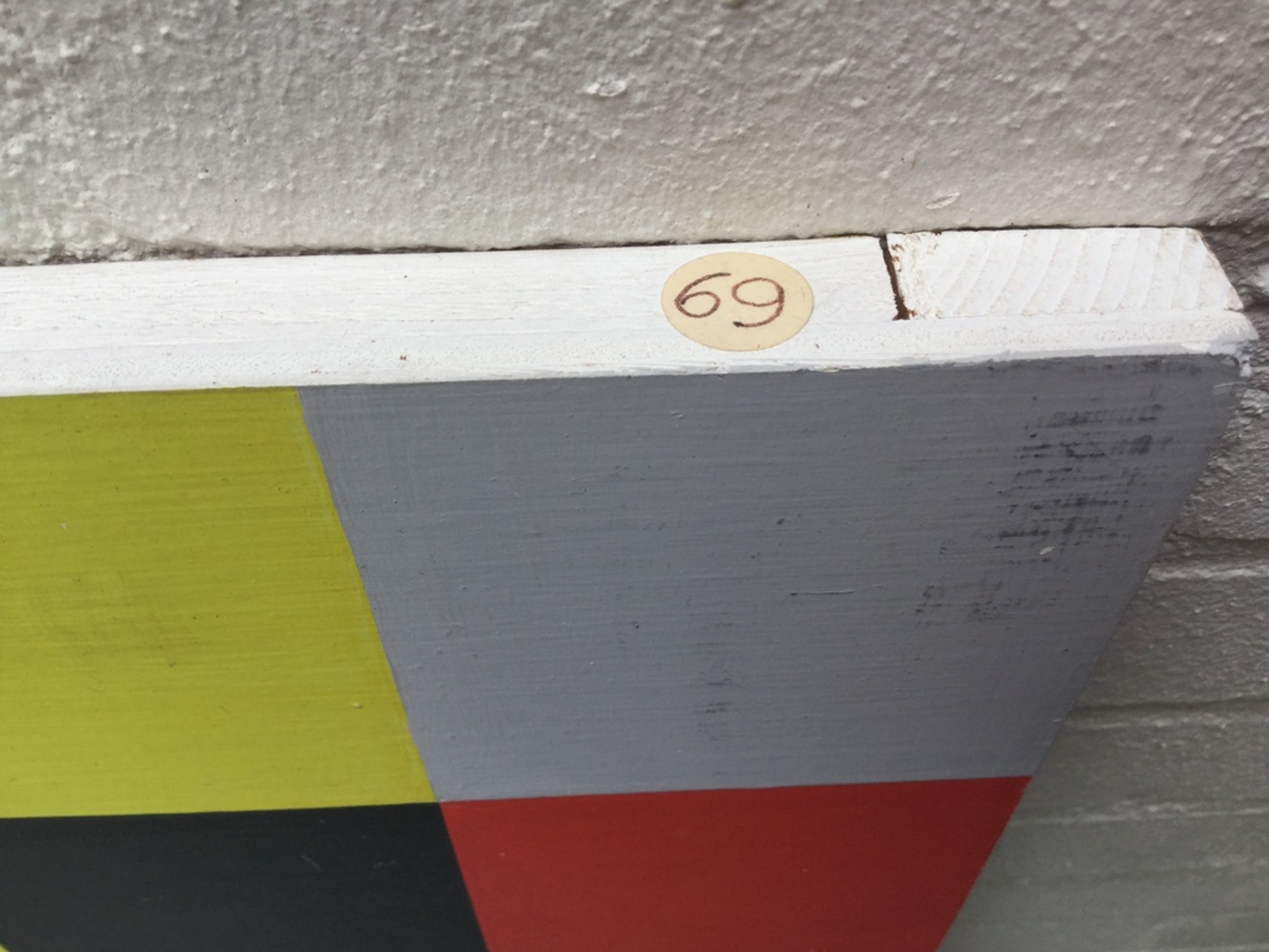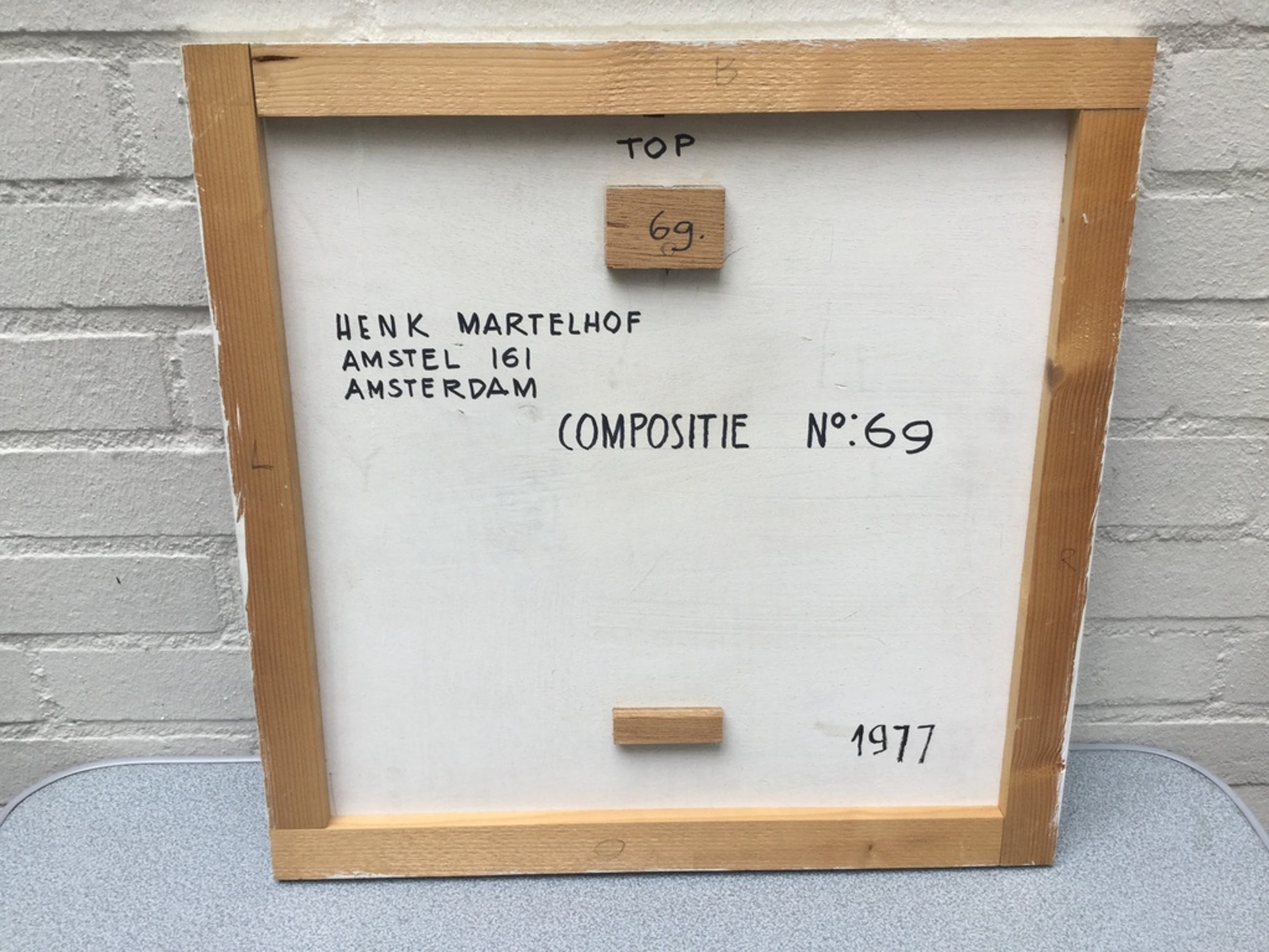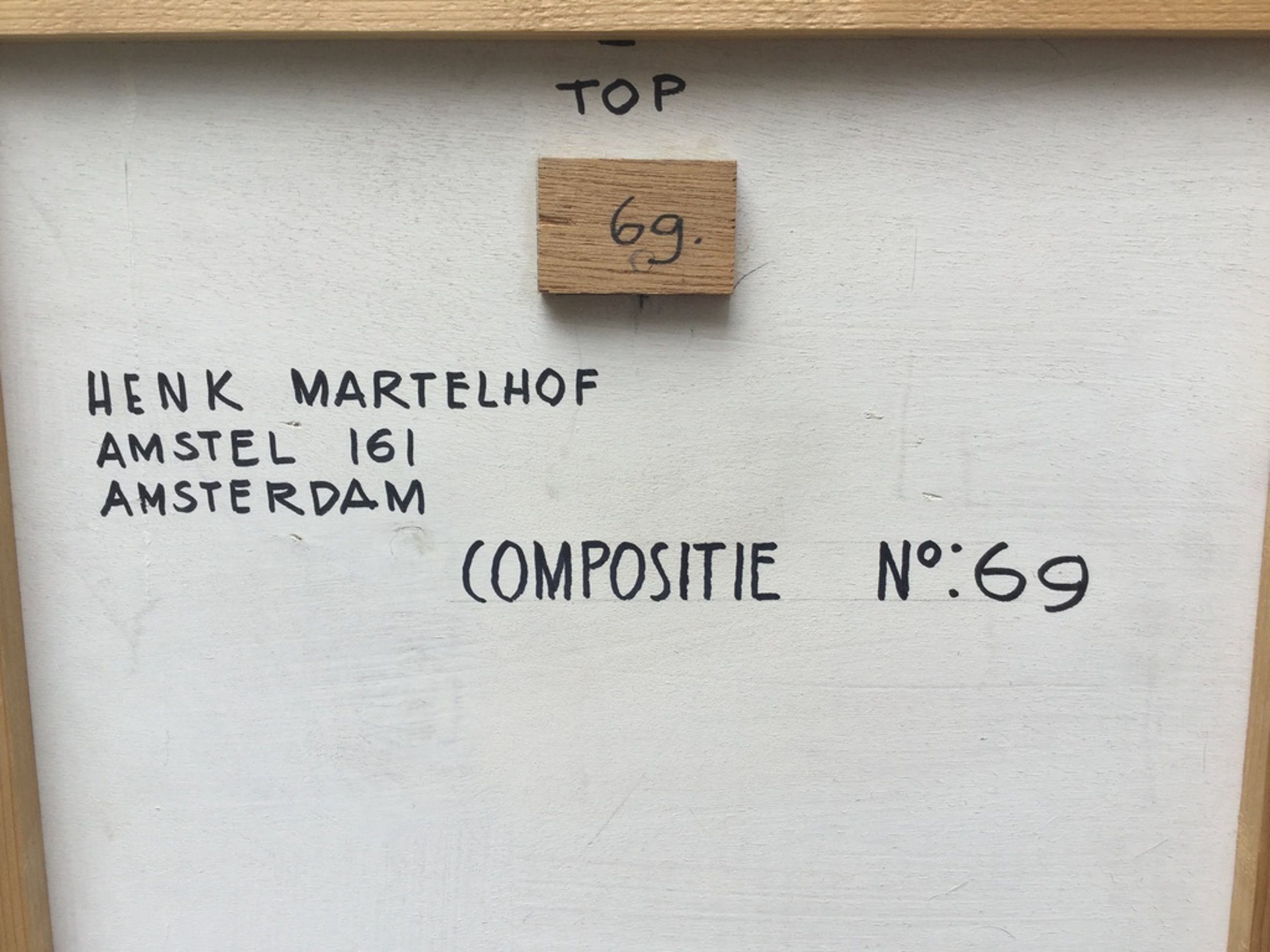 In the style of Piet Mondriaan and Bert van de Lek, this constuctivist paining by Henk Martelhof (Amsterdam) dates from a later period; 1977. In very good condition, this oil on board measures 40 by 40cm. Well marked to the reverse; Henk Martelhof, Amstel 161, Amsterdam “Compositie No. 69” and dated 1977.