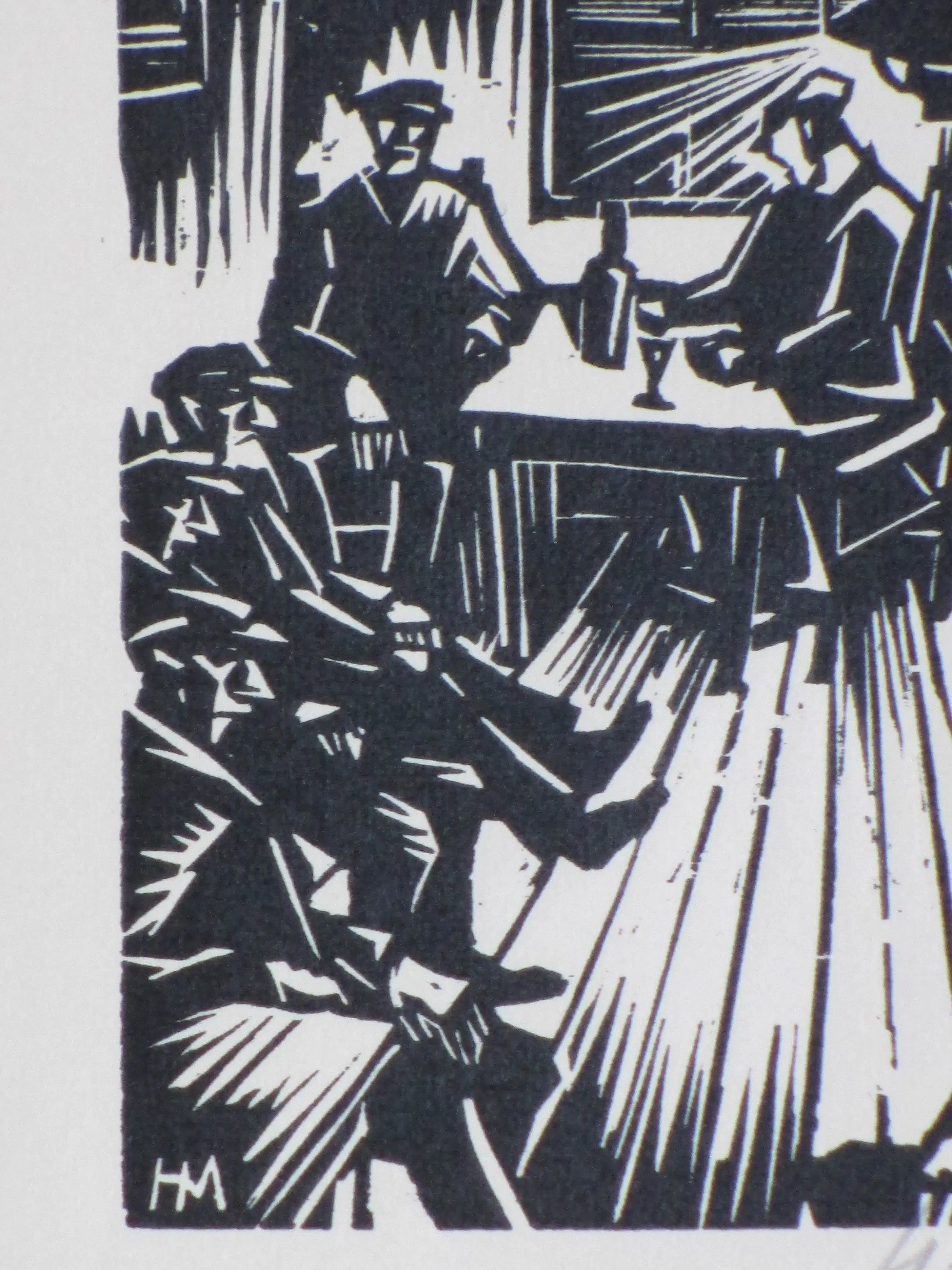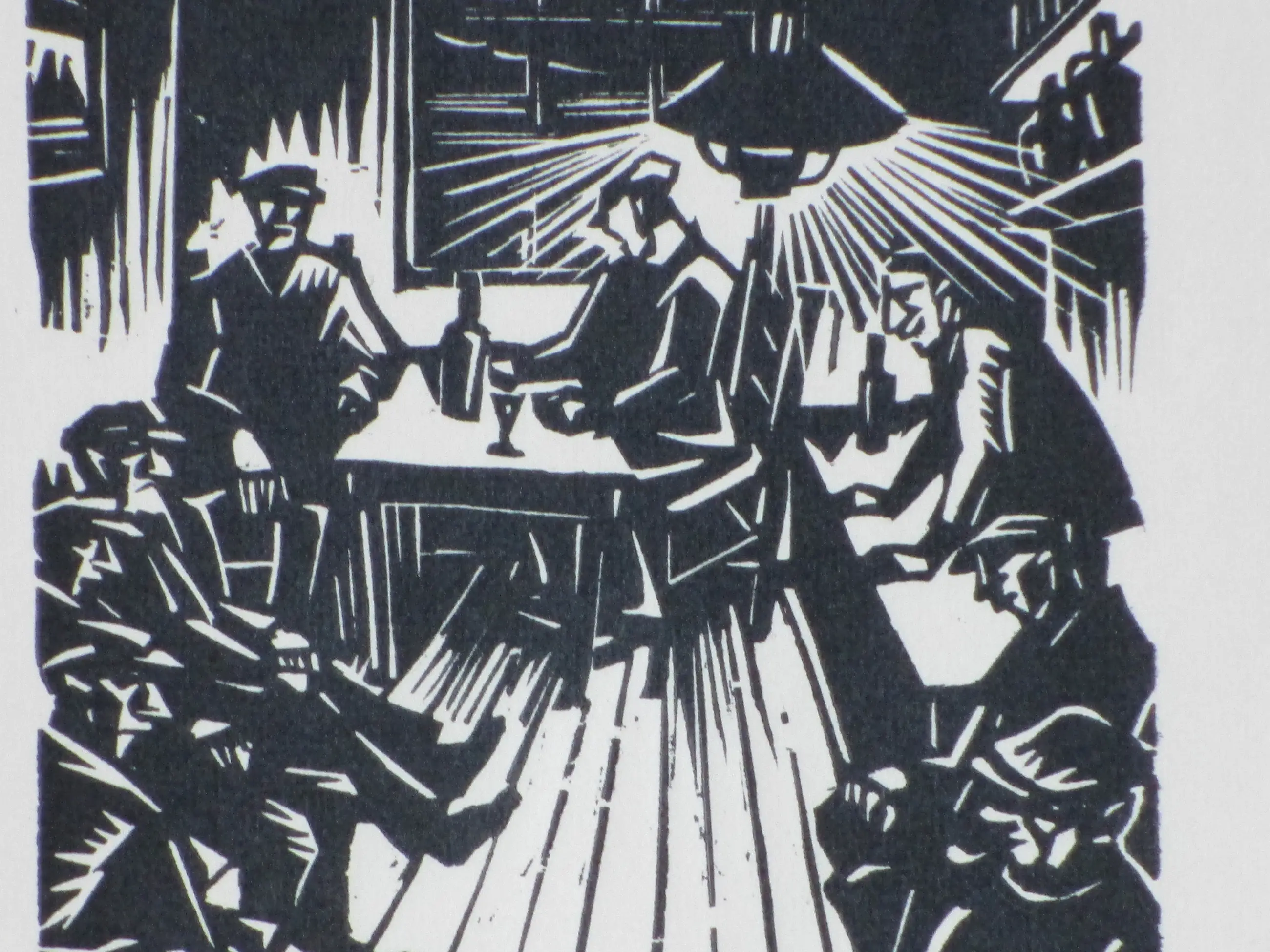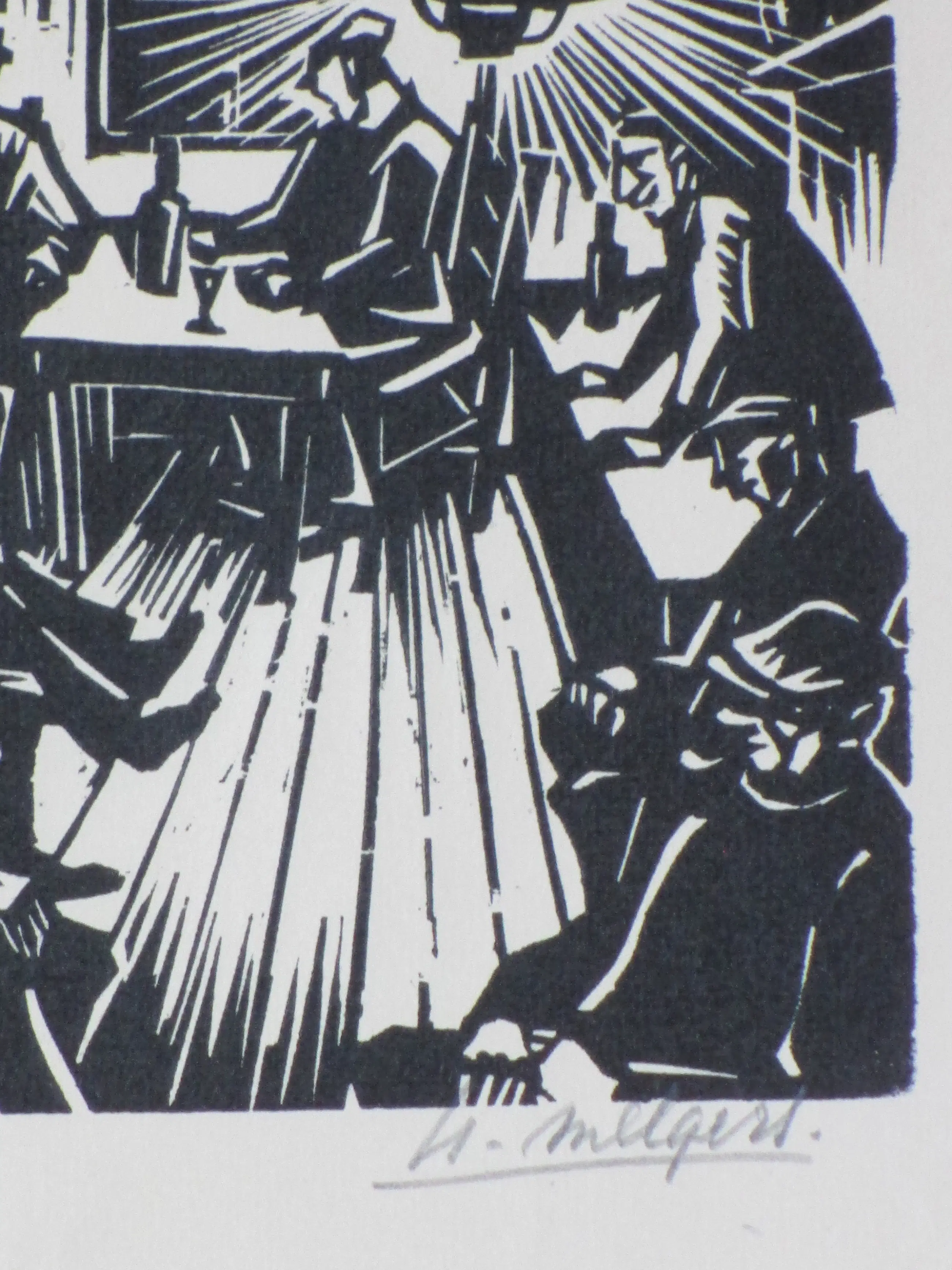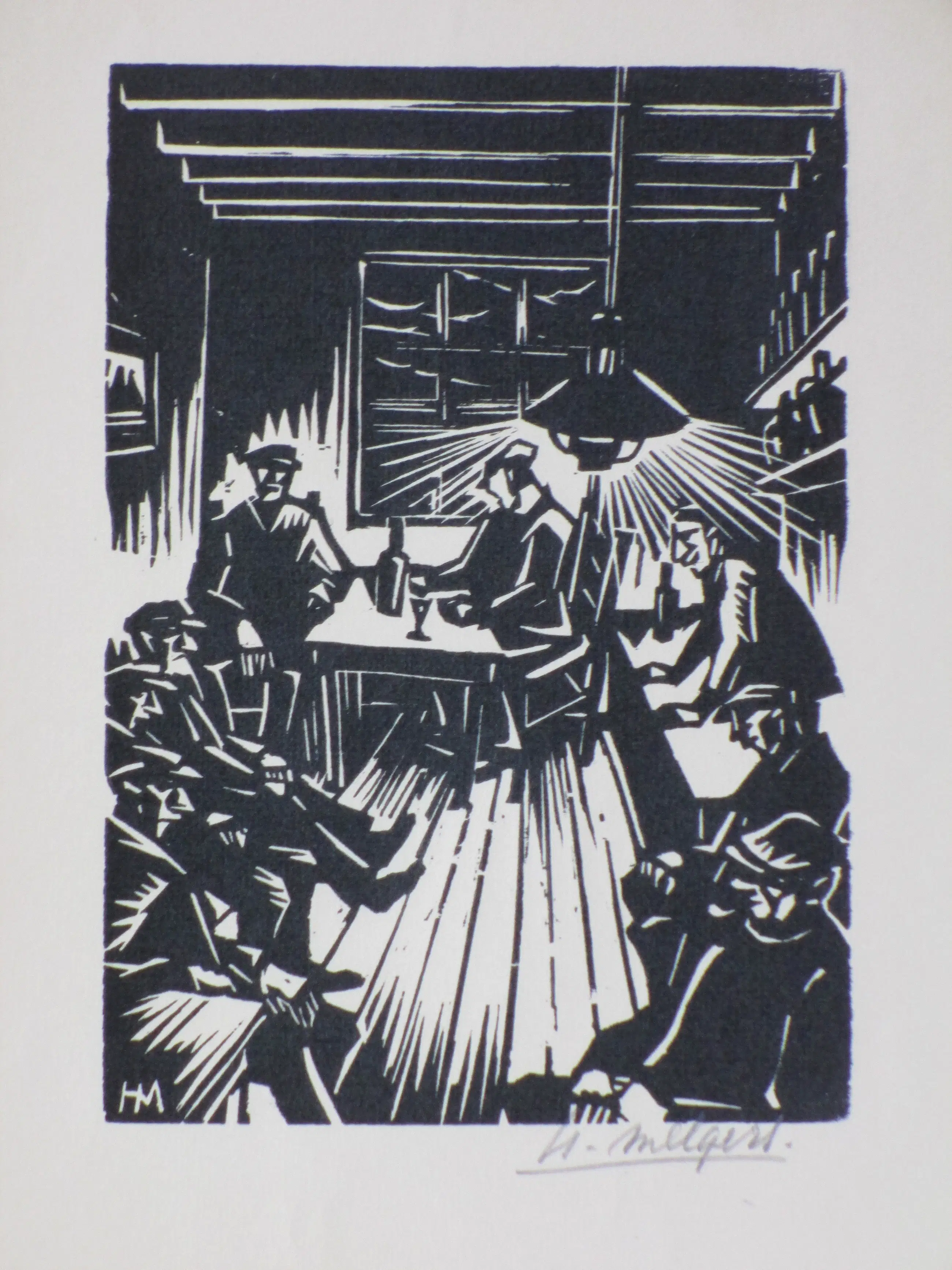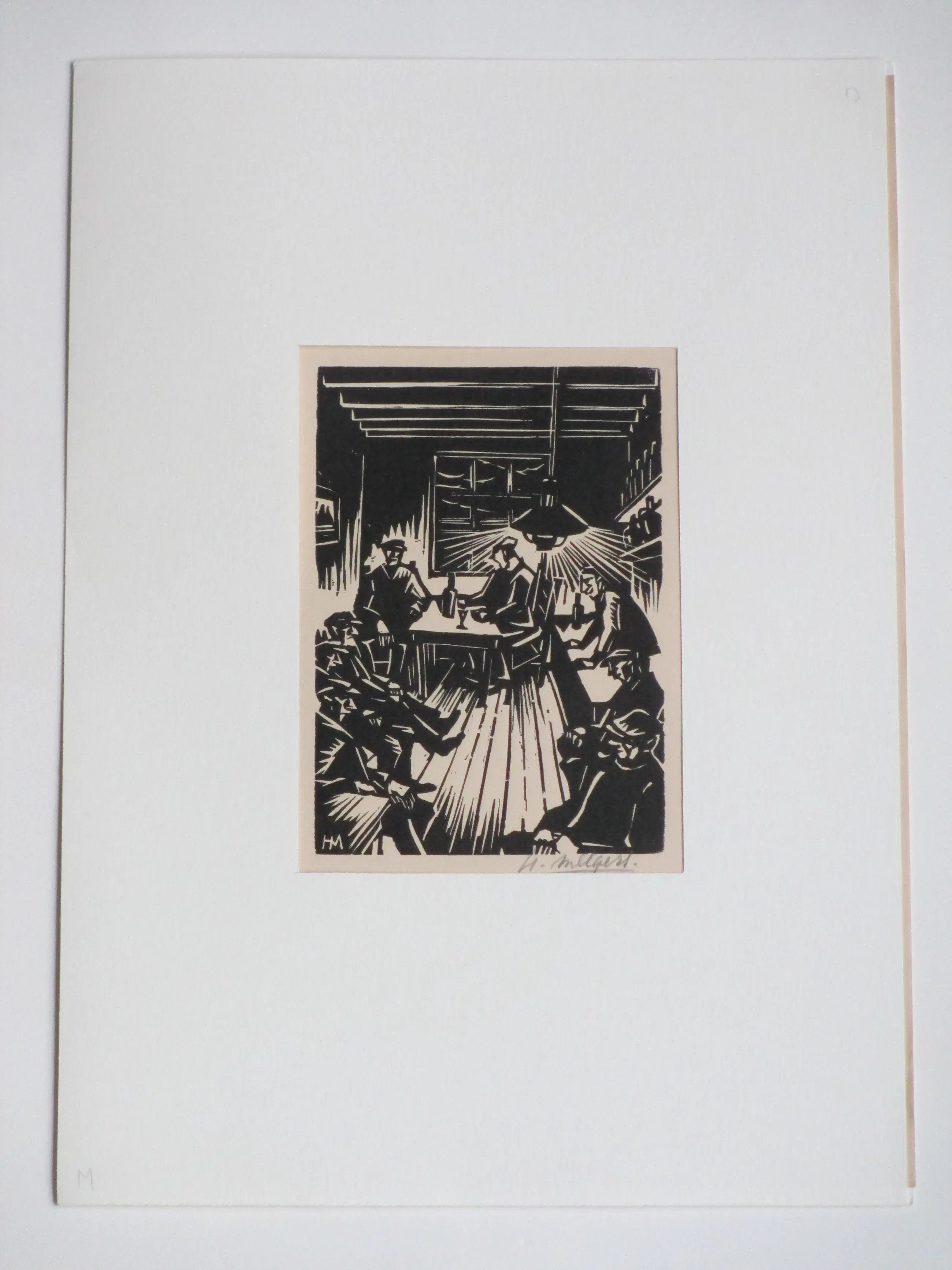 Houtsnede door Henk Melgers Voorstelling van een cafe-interieur Losbladig onder passepartout, beeldmaat 15x10.5, bladmaat 34x25 Gesigneerd in potlood r.o.: 'H. Melgers' Gemonogrammeerd in de plaat l.o.: 'HM'