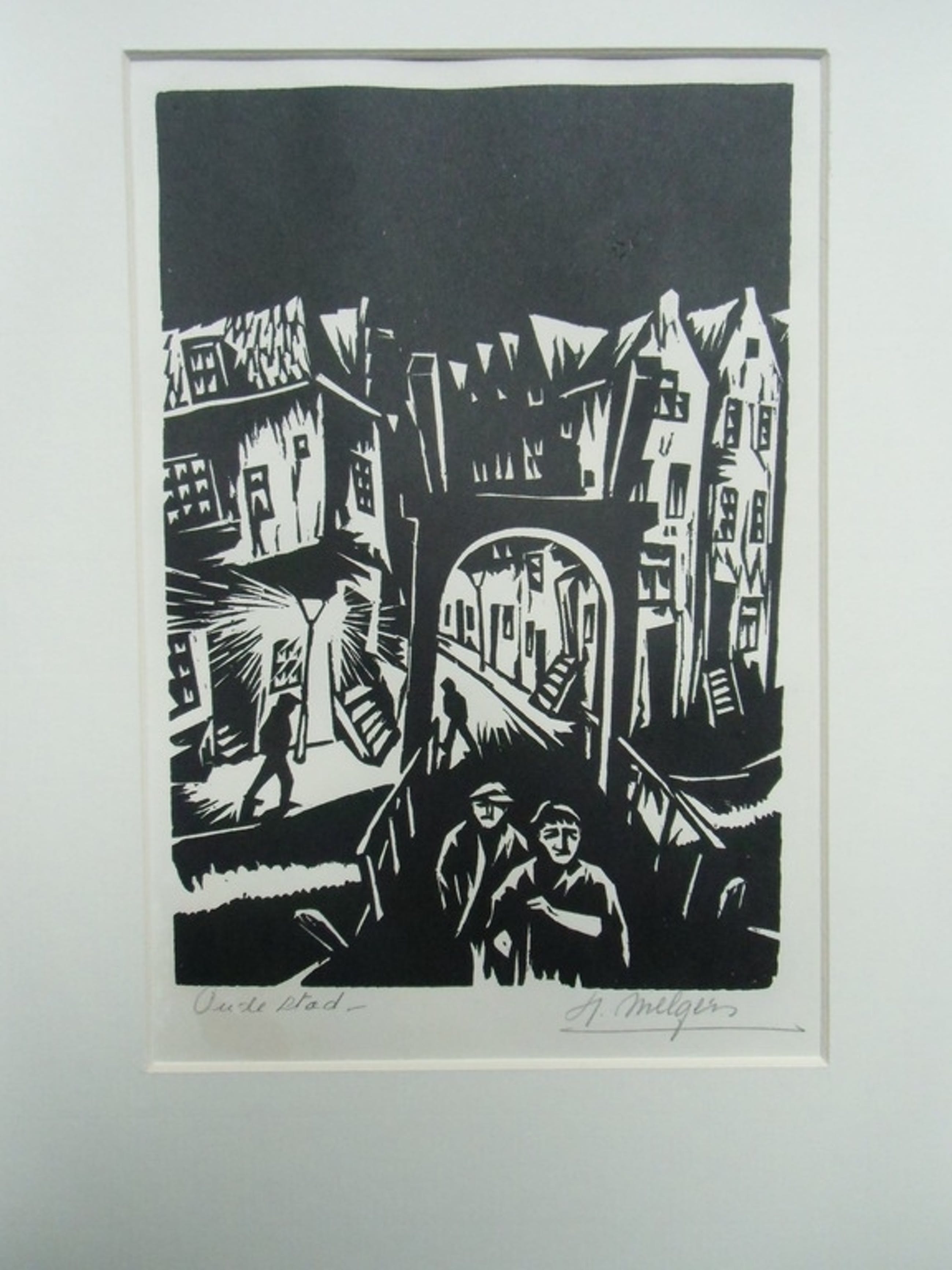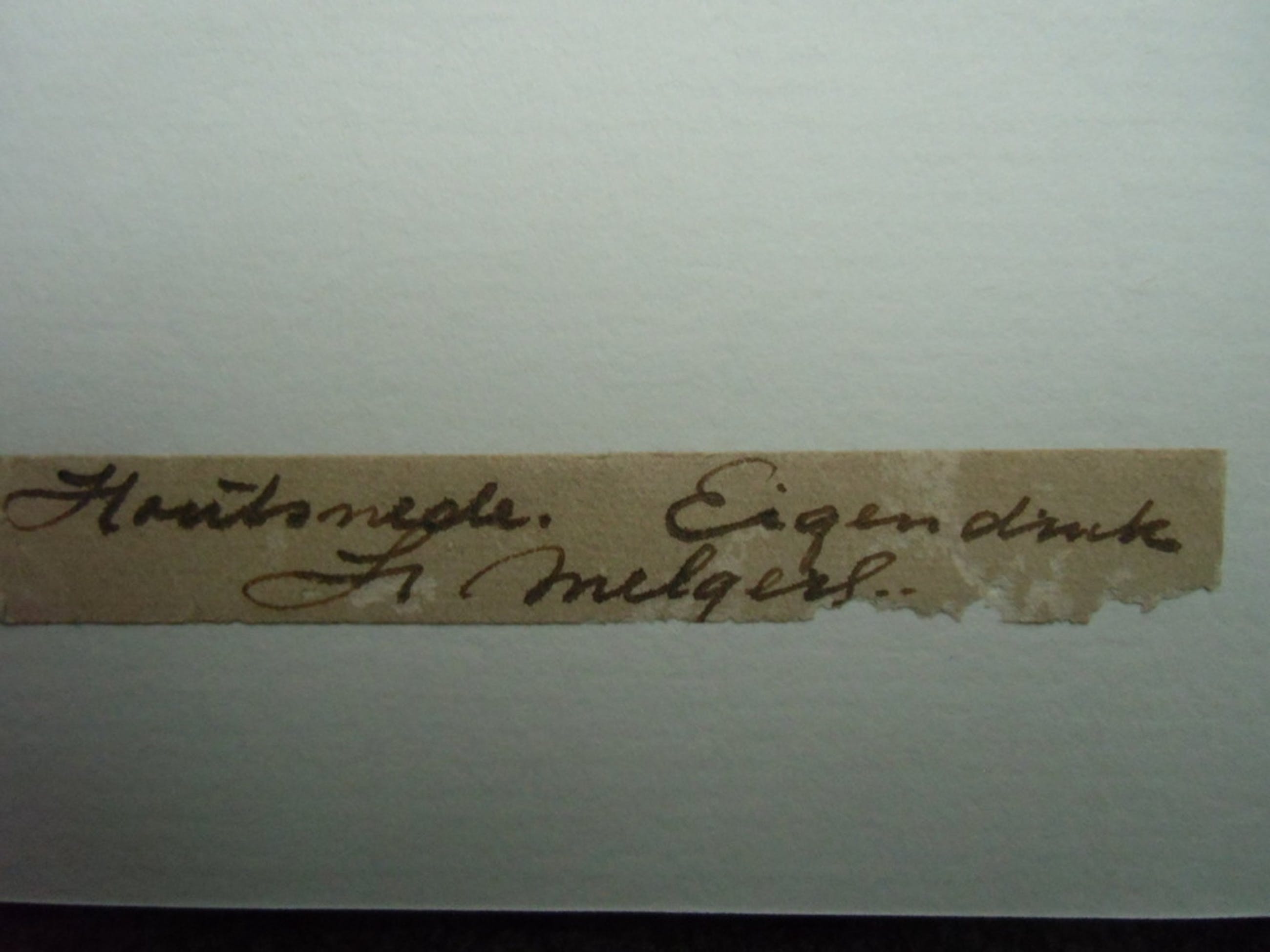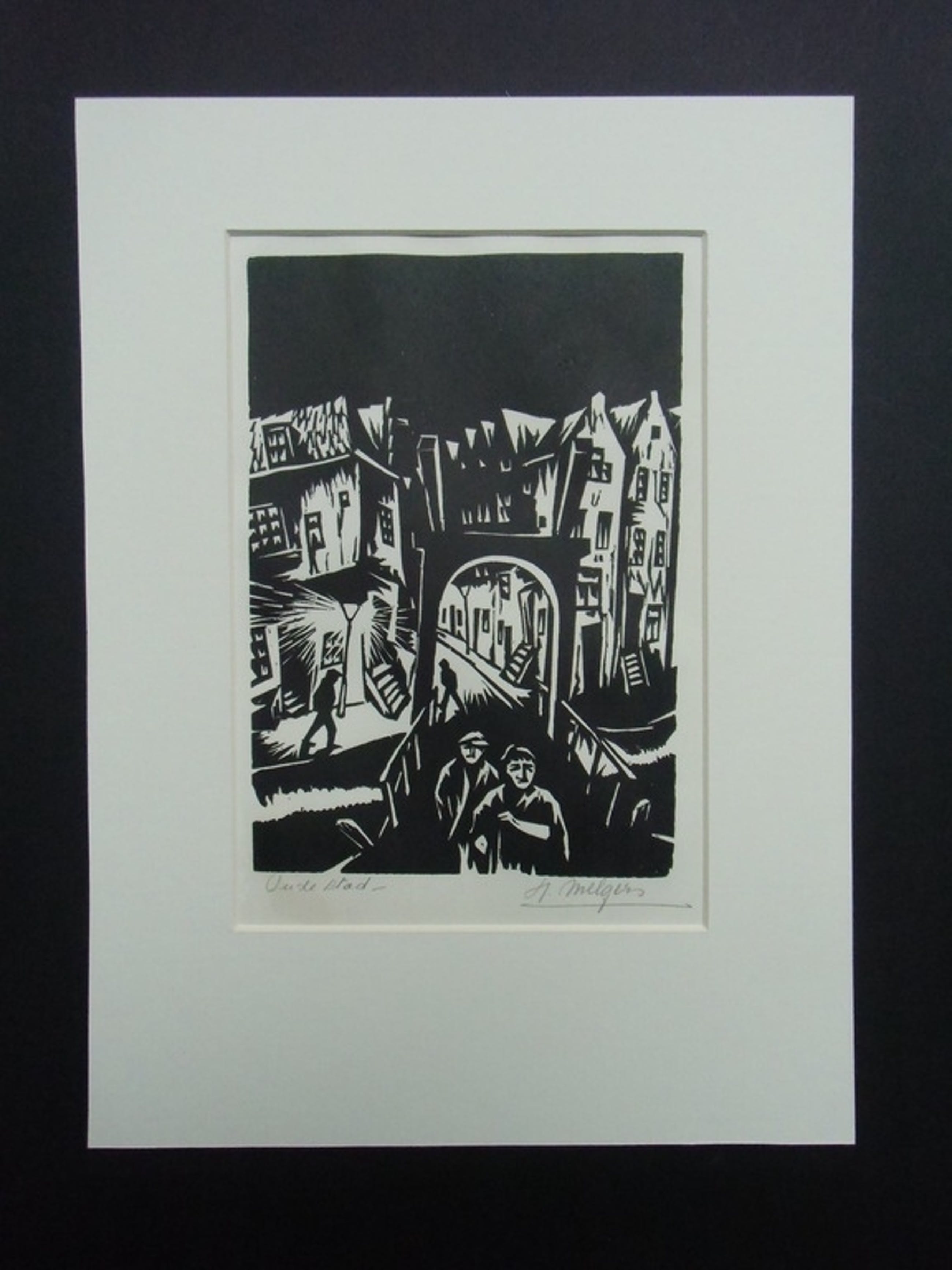 Deze houtsnede van Ploeg-lid Henk Melgers is in uitstekende conditie en met potlood gesigneerd. Jaar 1926 en Eigen druk (zie restant van het etiket afkomstig van het oorspronkelijke passepartout). Afmeting beeld 22.5 x 15.5 cm met ruime marges. Los opgenomen in passepartout met achtervel.