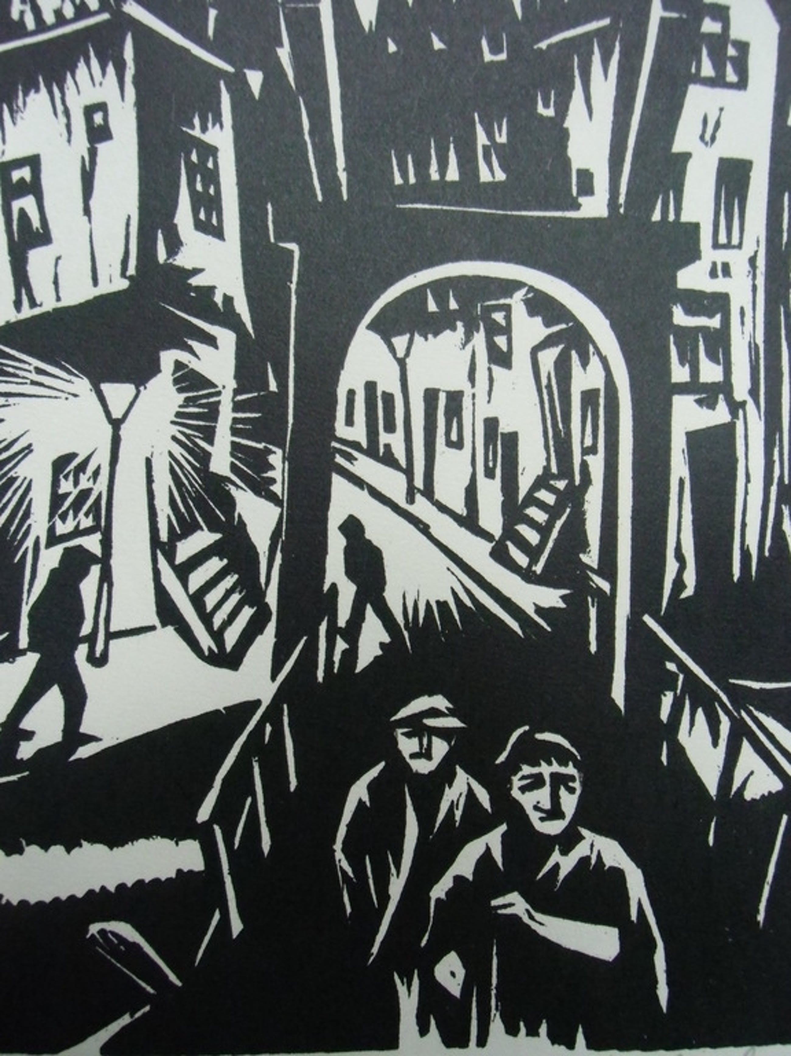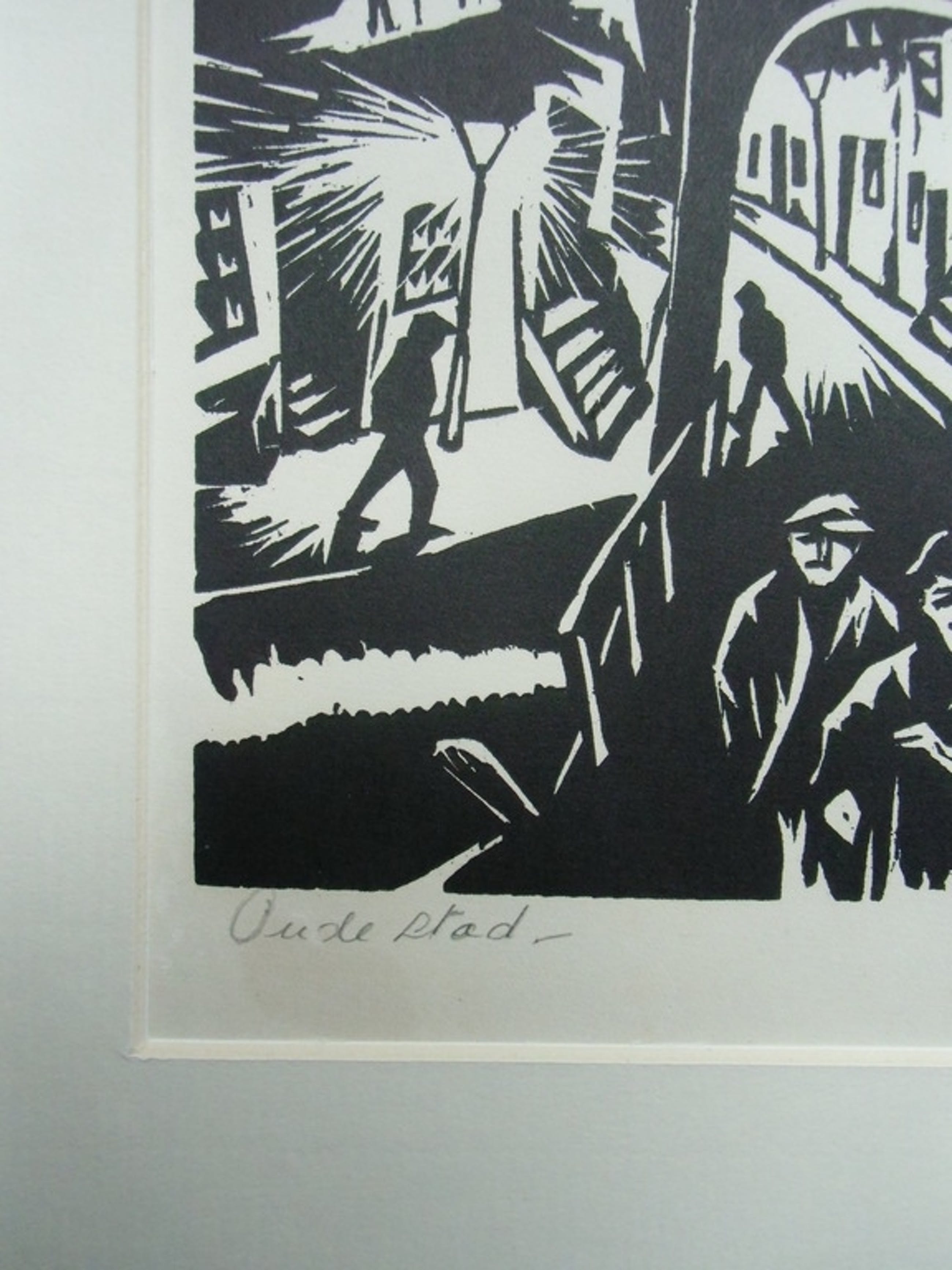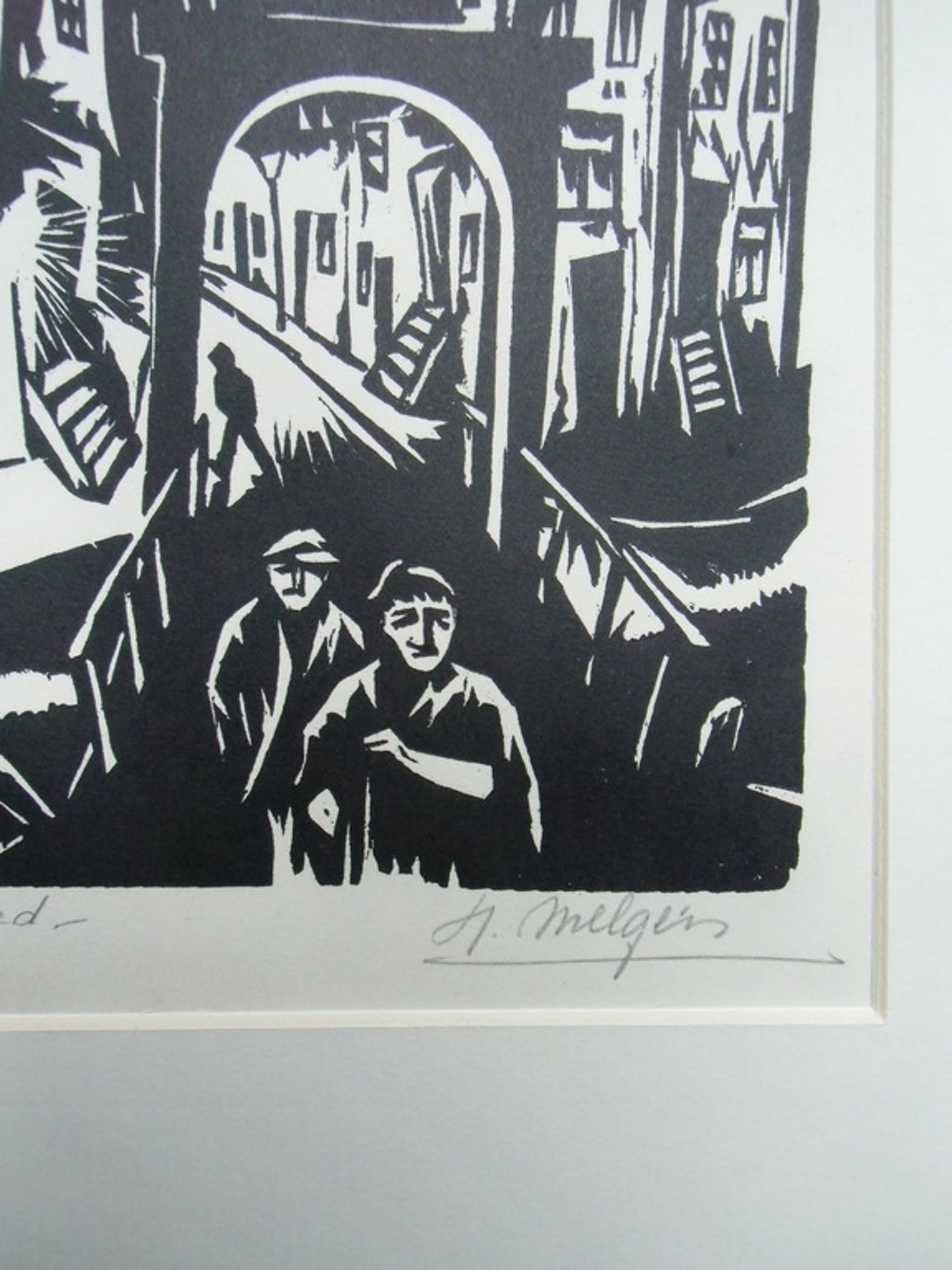 Deze houtsnede van Ploeg-lid Henk Melgers is in uitstekende conditie en met potlood gesigneerd. Jaar 1926 en Eigen druk (zie restant van het etiket afkomstig van het oorspronkelijke passepartout). Afmeting beeld 22.5 x 15.5 cm met ruime marges. Los opgenomen in passepartout met achtervel.