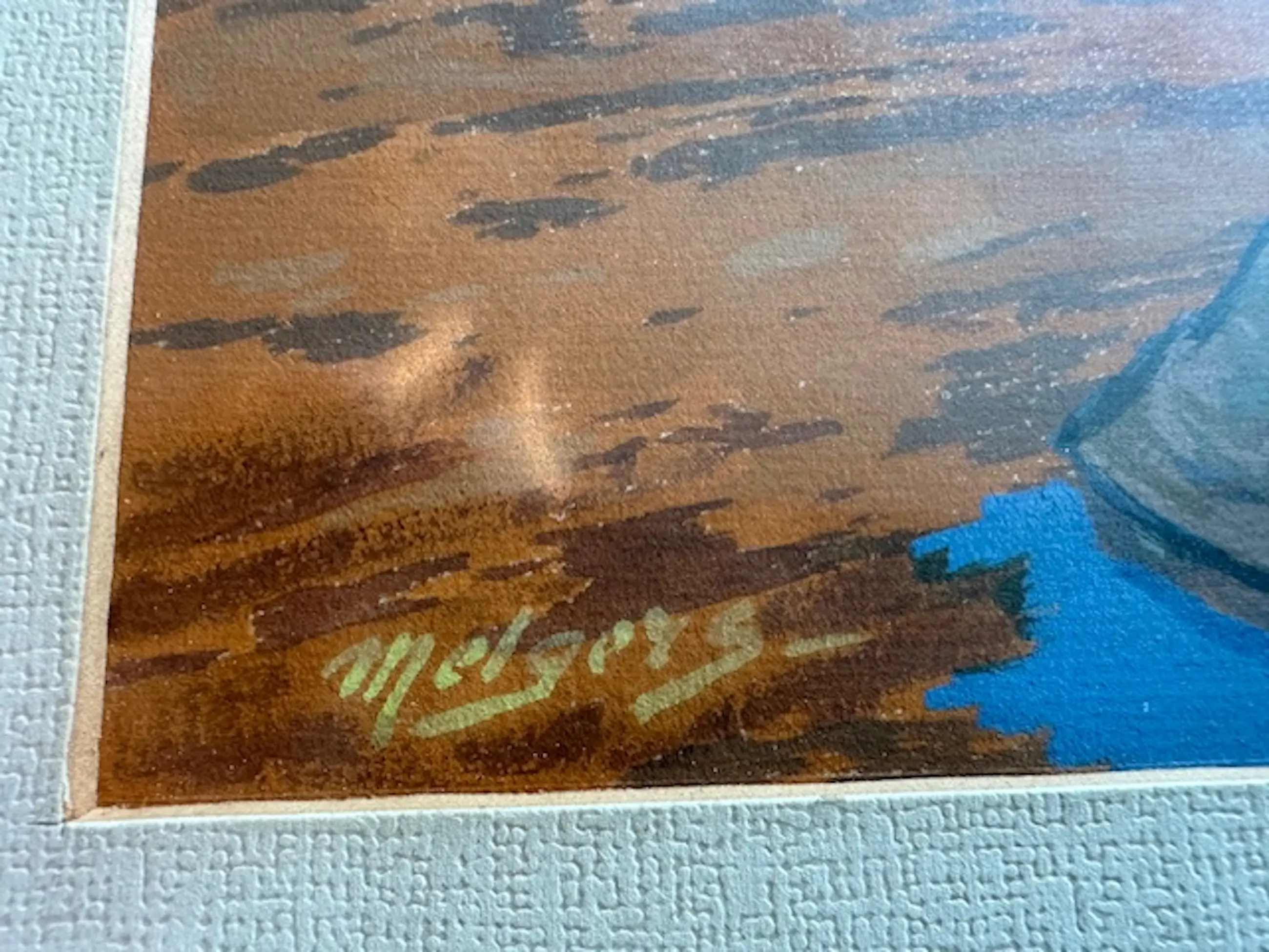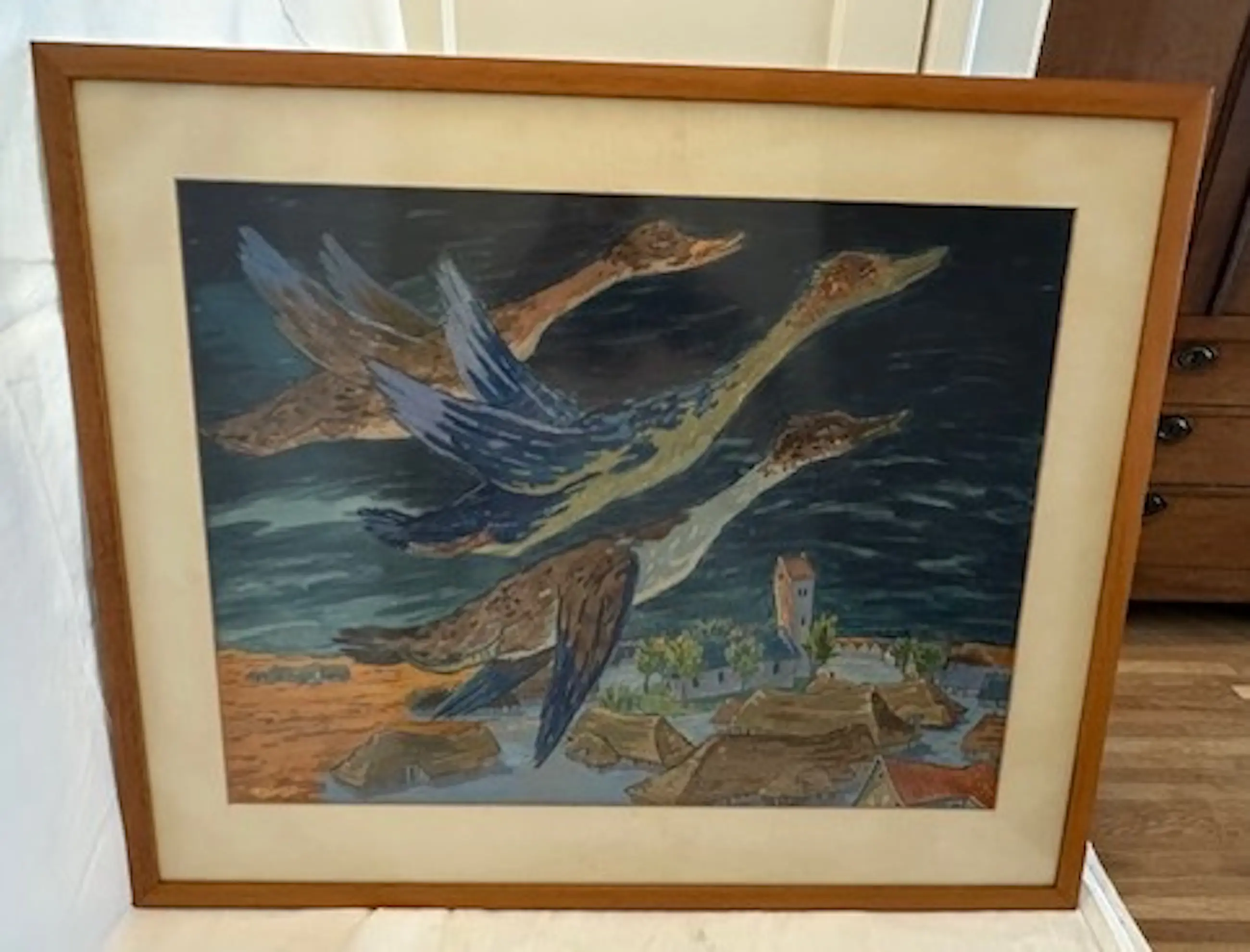 Gouache op papier. Blankhouten lijst. Vliegende ganzen over een dorp. Linksonder gesigneerd.