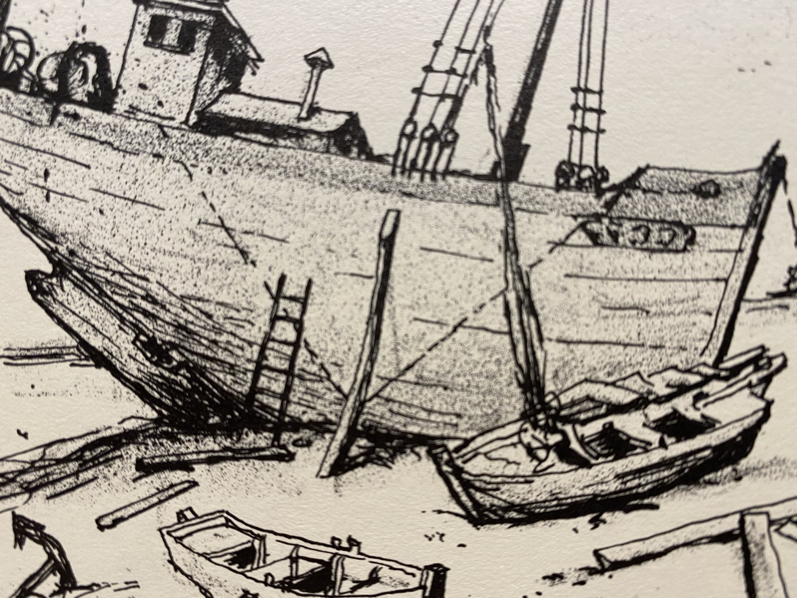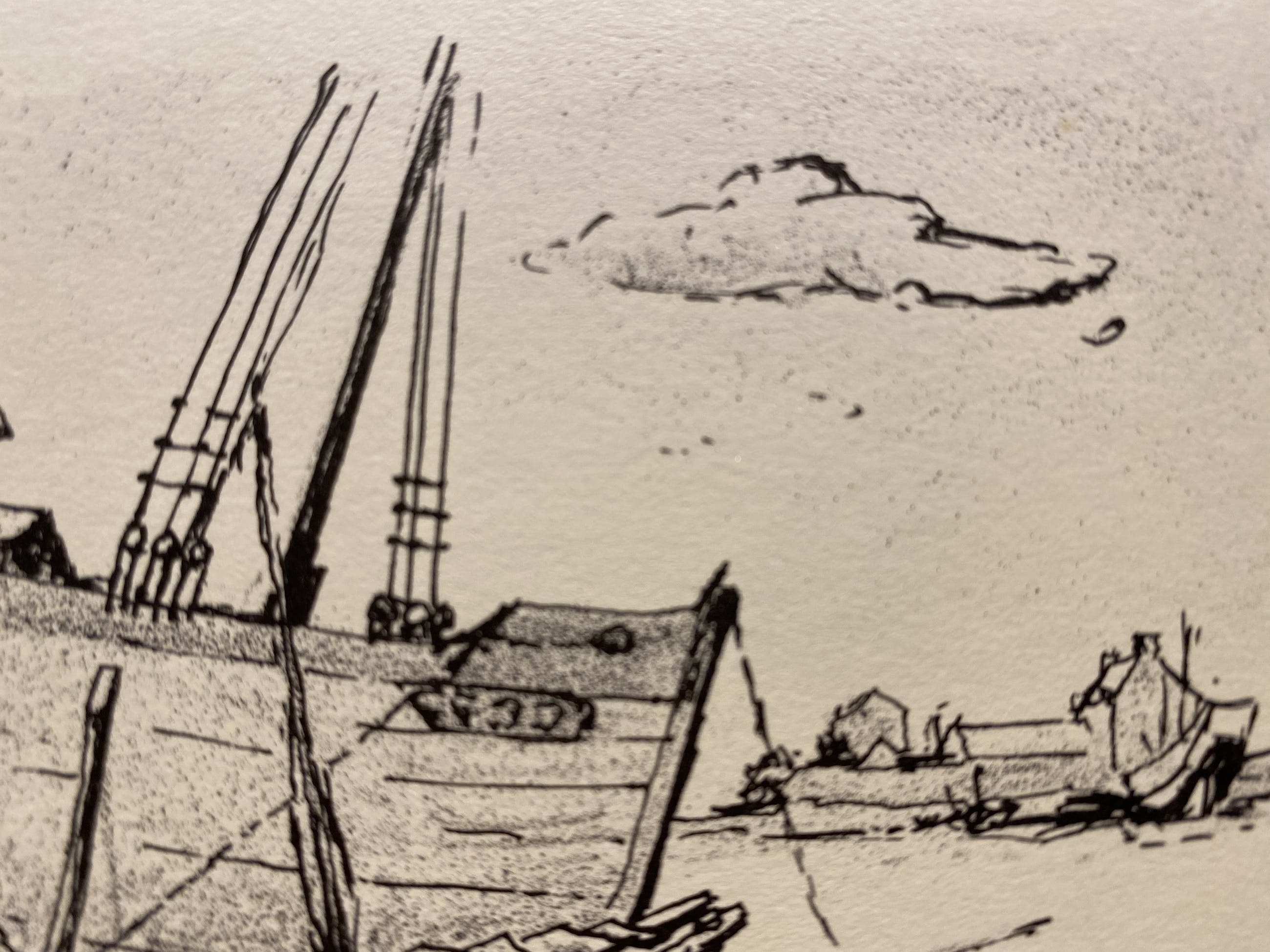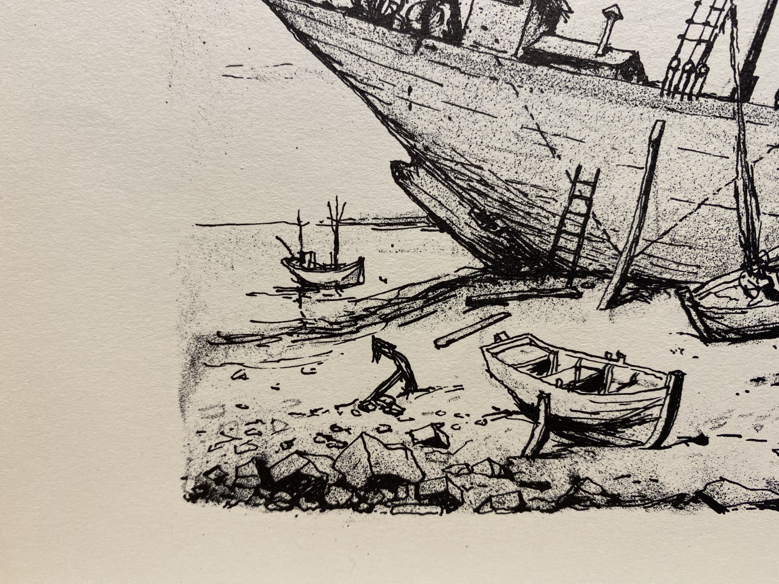 Strandtafereel; er ligt een grote boot, waar aan gewerkt wordt, scheefgezakt in het zand. Er zijn kleinere bootjes, een anker en wat wrakhout zichtbaar. De tekening is bijzonder verfijnd. Zeer waarschijnlijk op locatie in Normandië gemaakt.