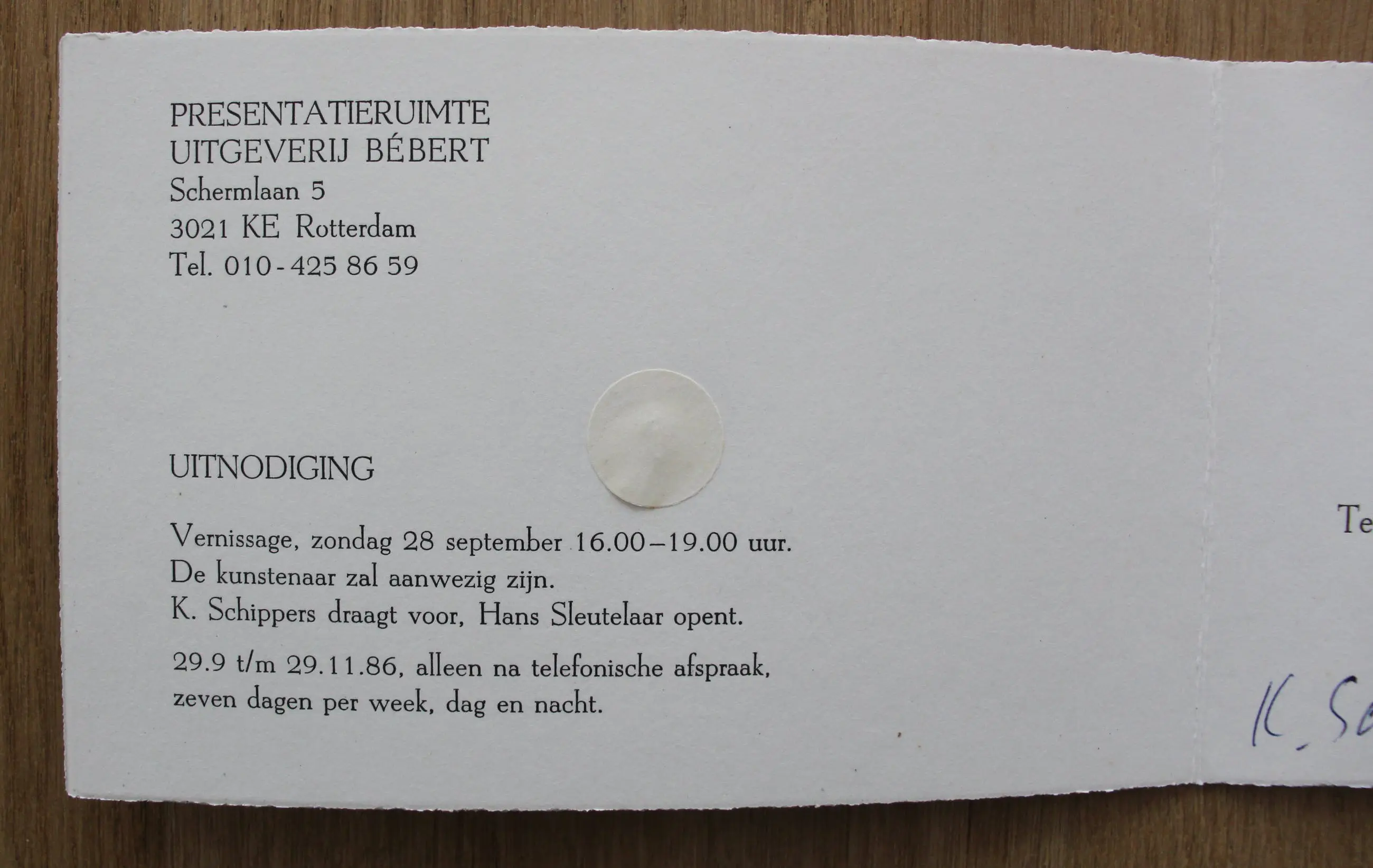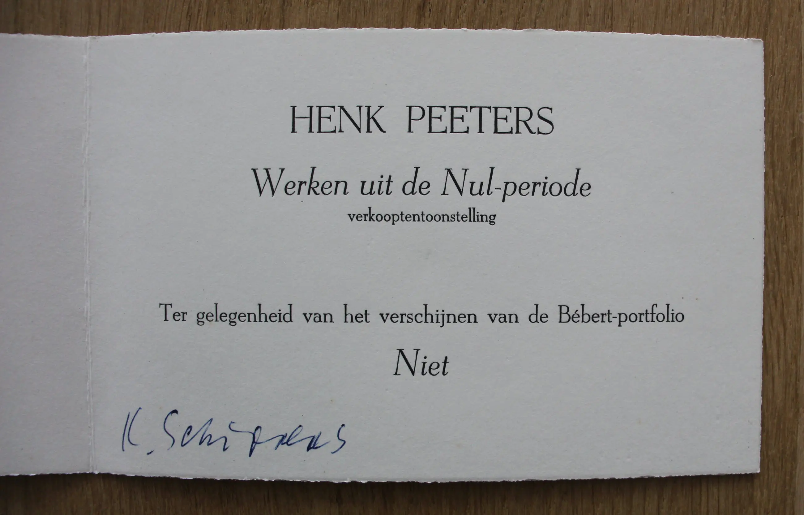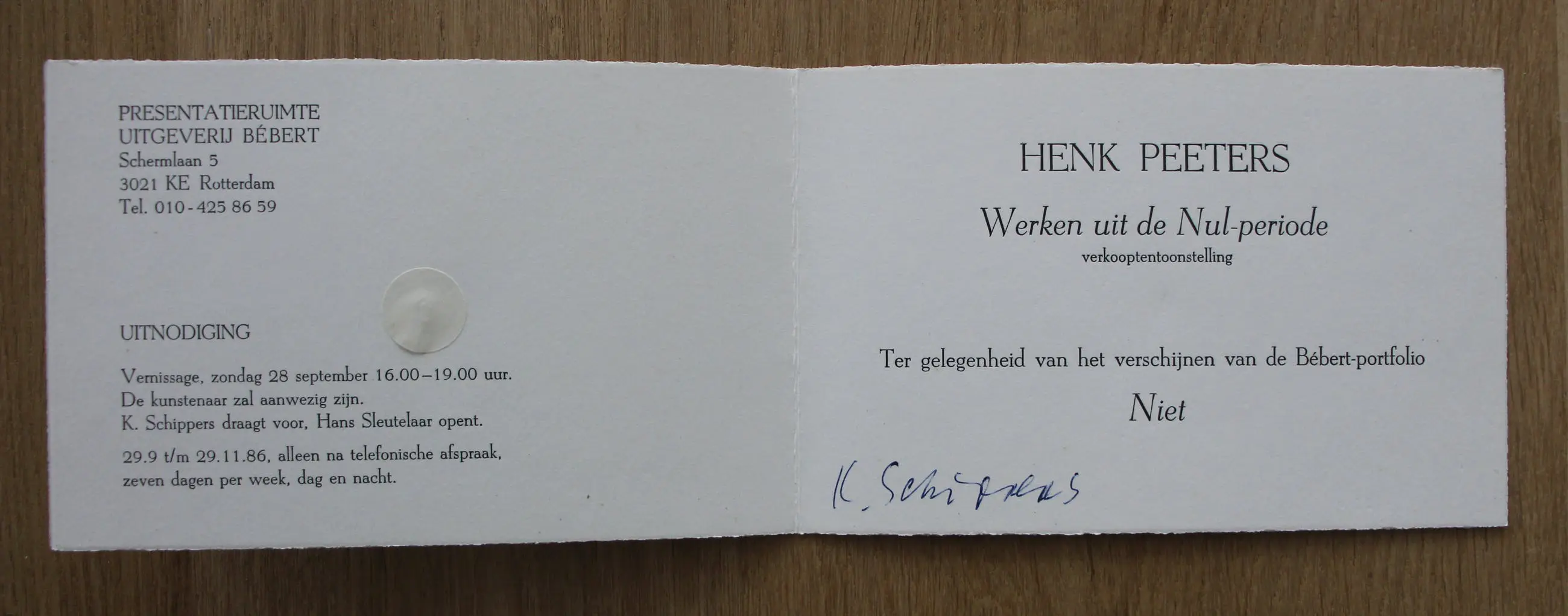 De normale uitnodigingen waren niet gesigneerd. Deze is zowel door Henk Peeters als door Klaas Schippers gesigneerd. Klaas Schippers was uitgenodigd bij de opening om voor te dragen. De authenticiteit van het aangeboden werk wordt volledig gegarandeerd. Een certificaat van echtheid kan, op aanvraag, worden gemaild.