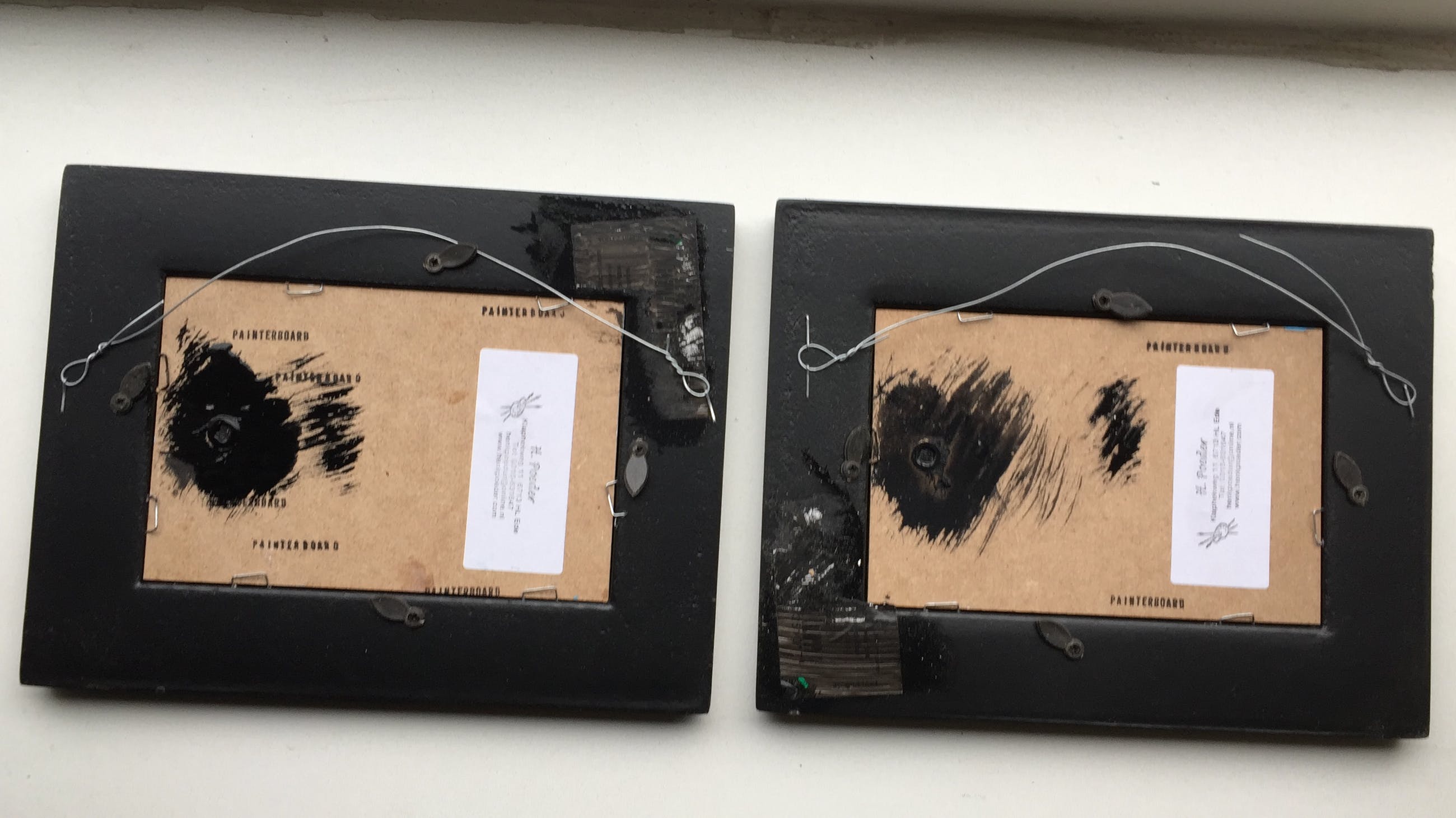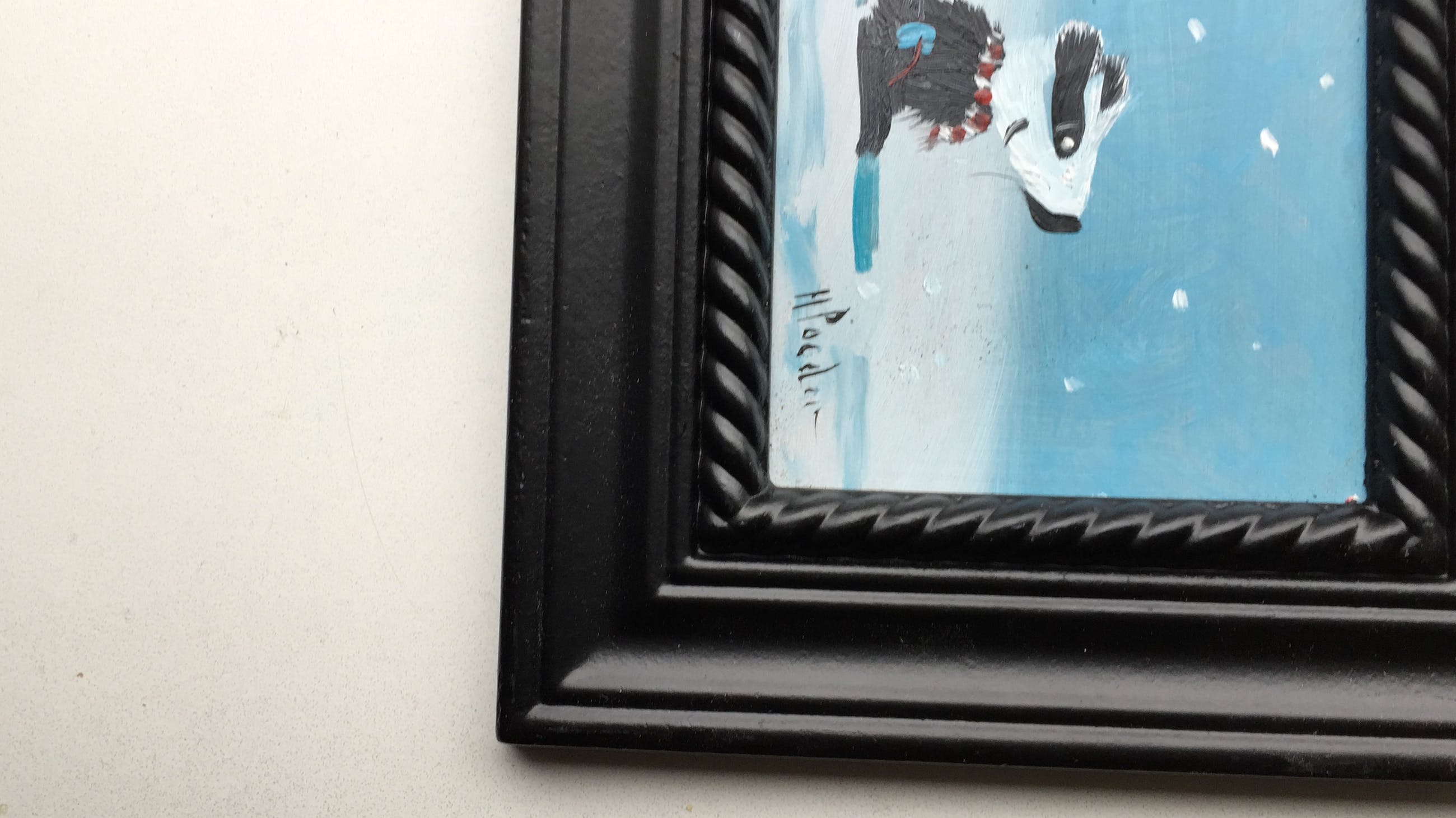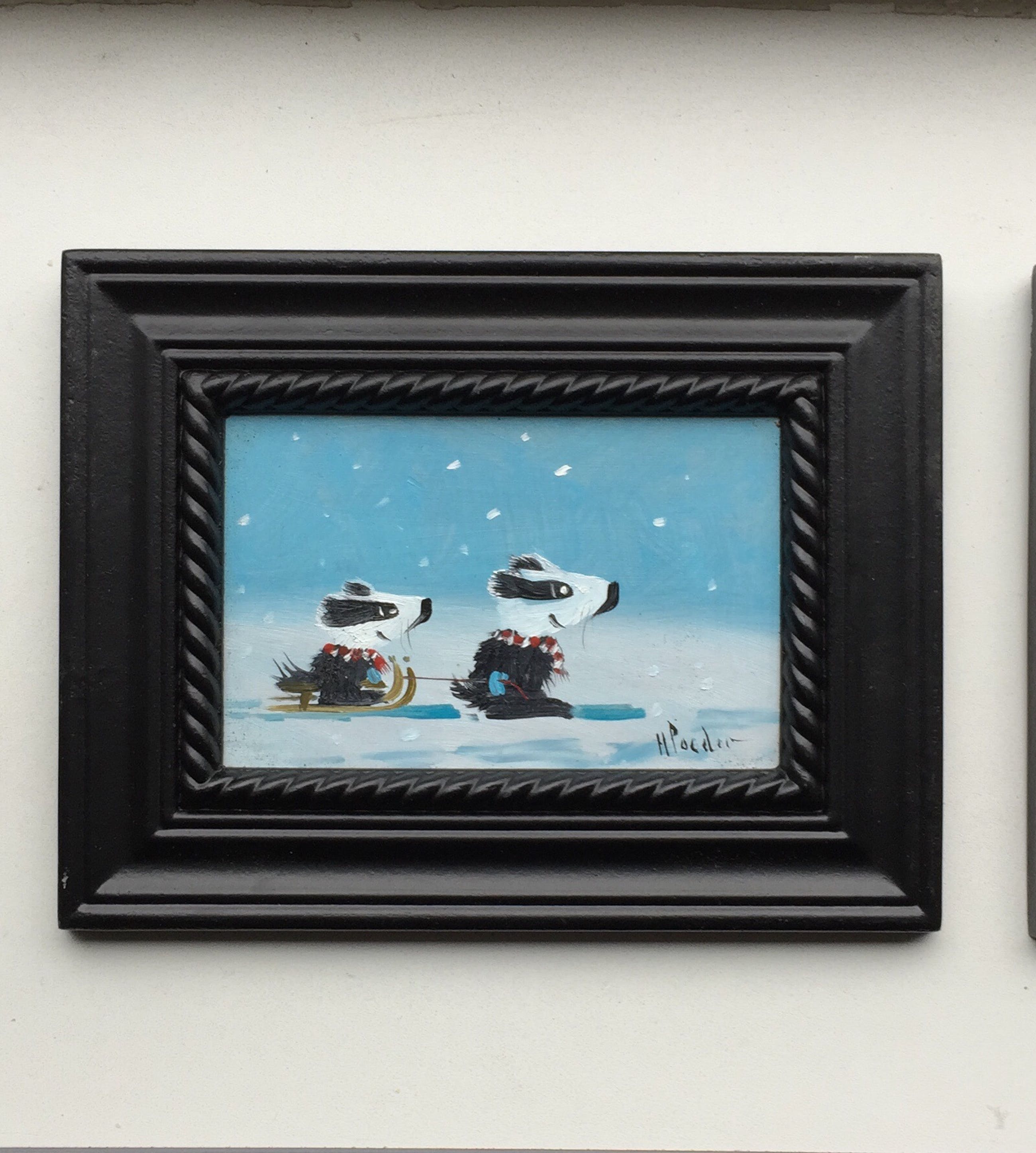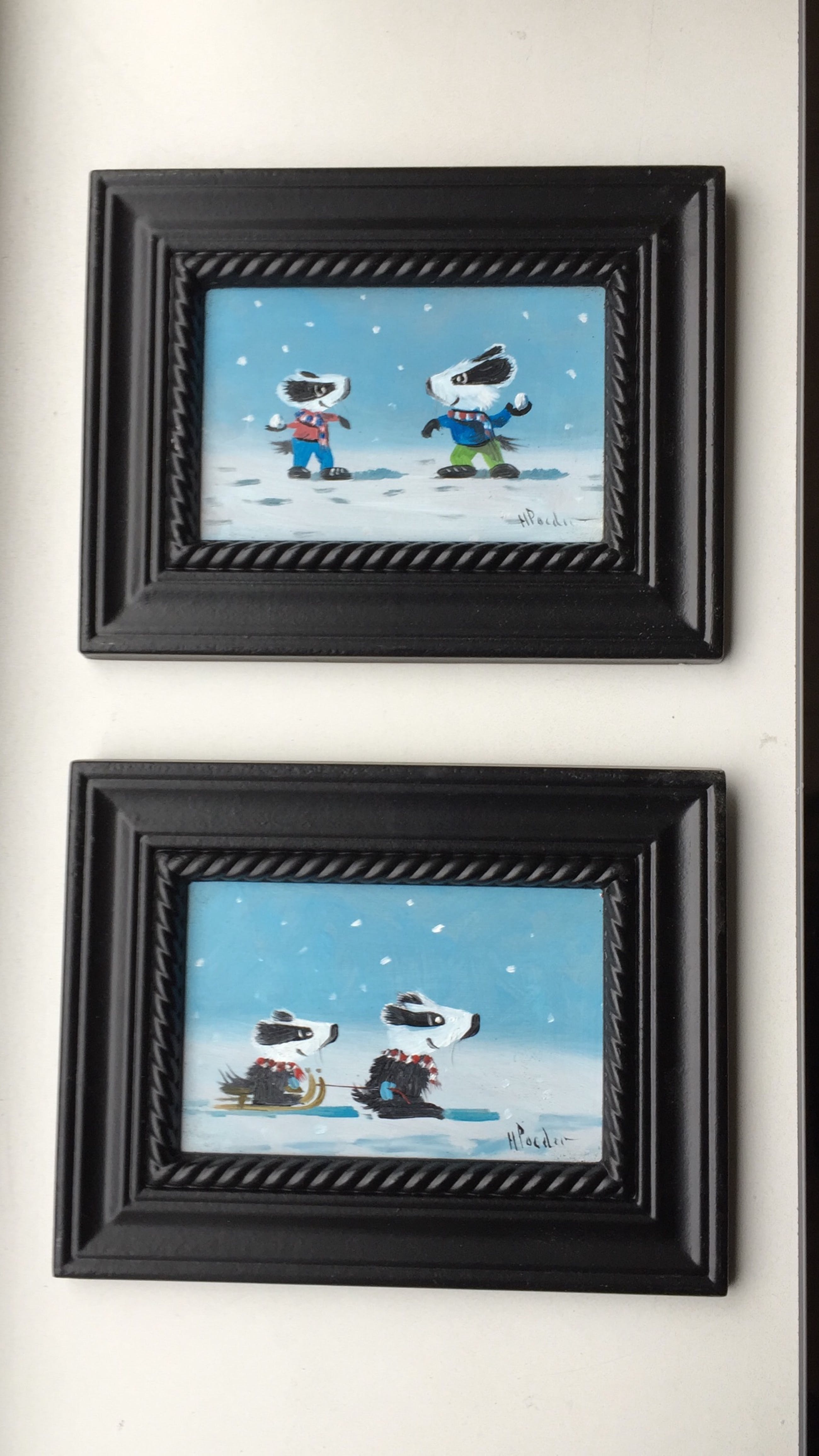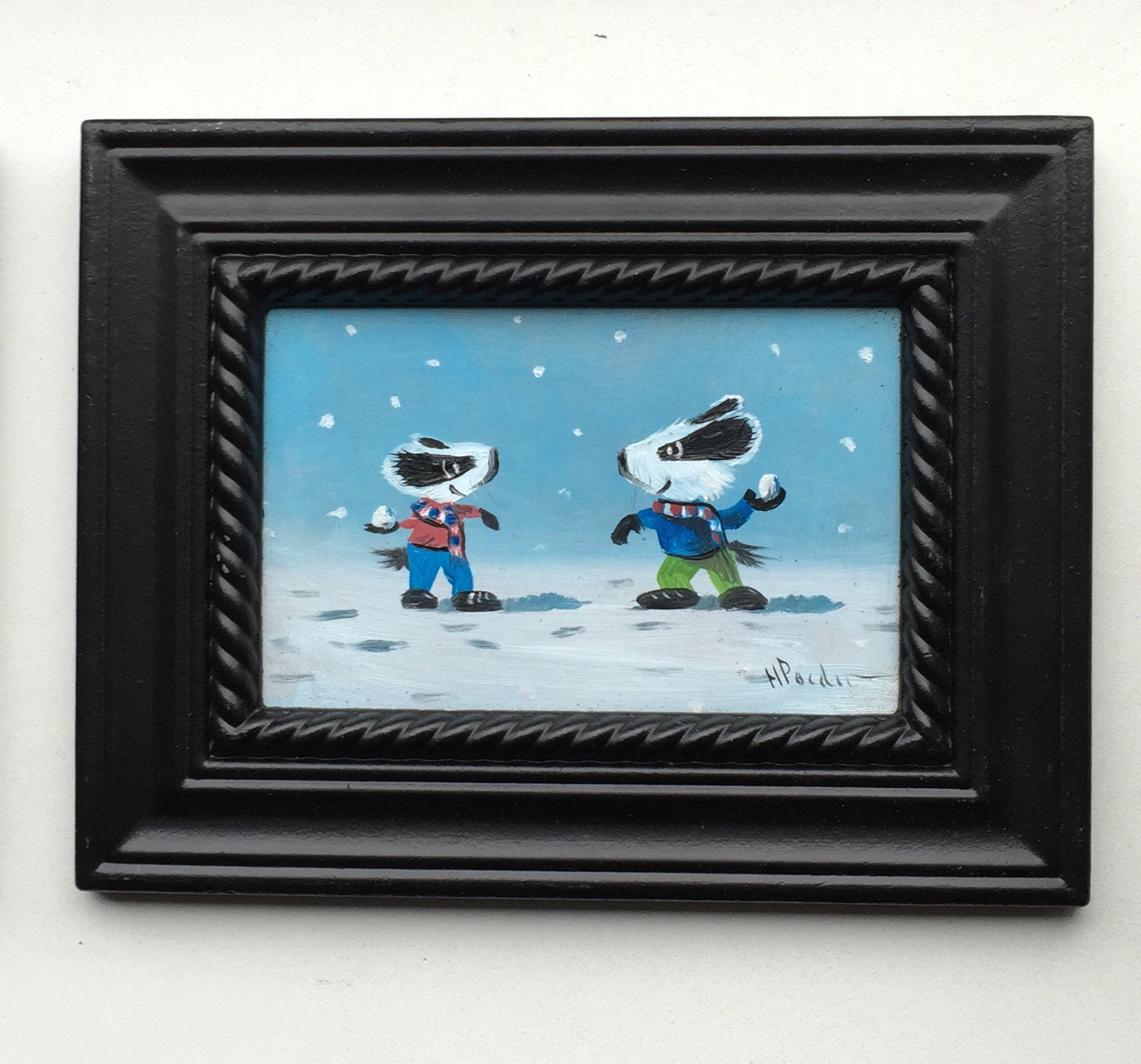 Olieverf op painterboard spelende dassen in de sneeuw pendant (2schilderijtjes) bij elkaar