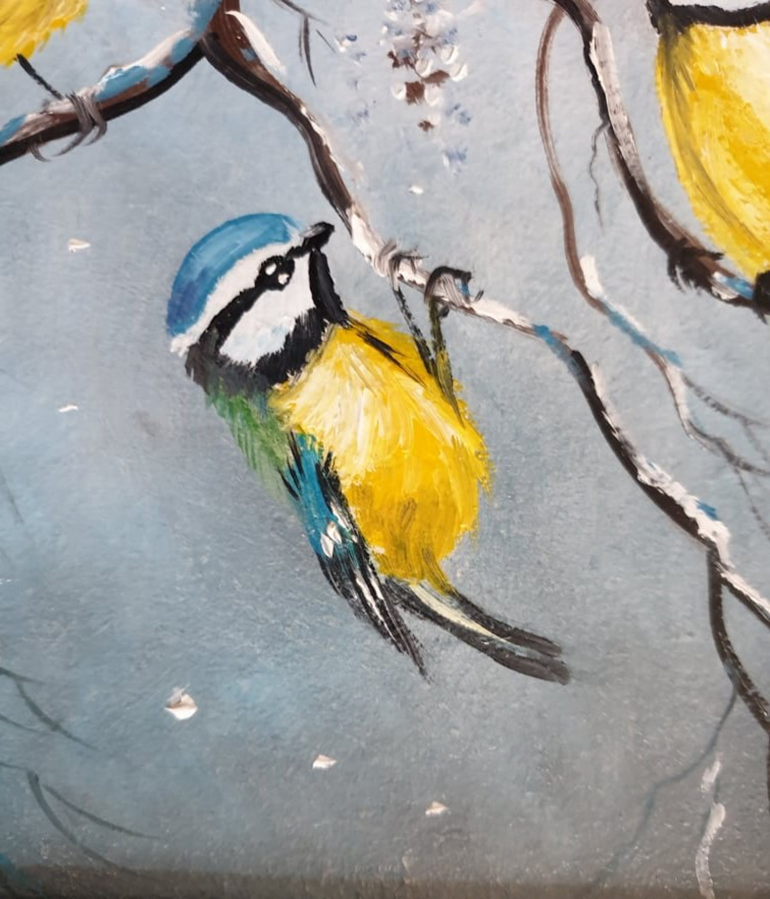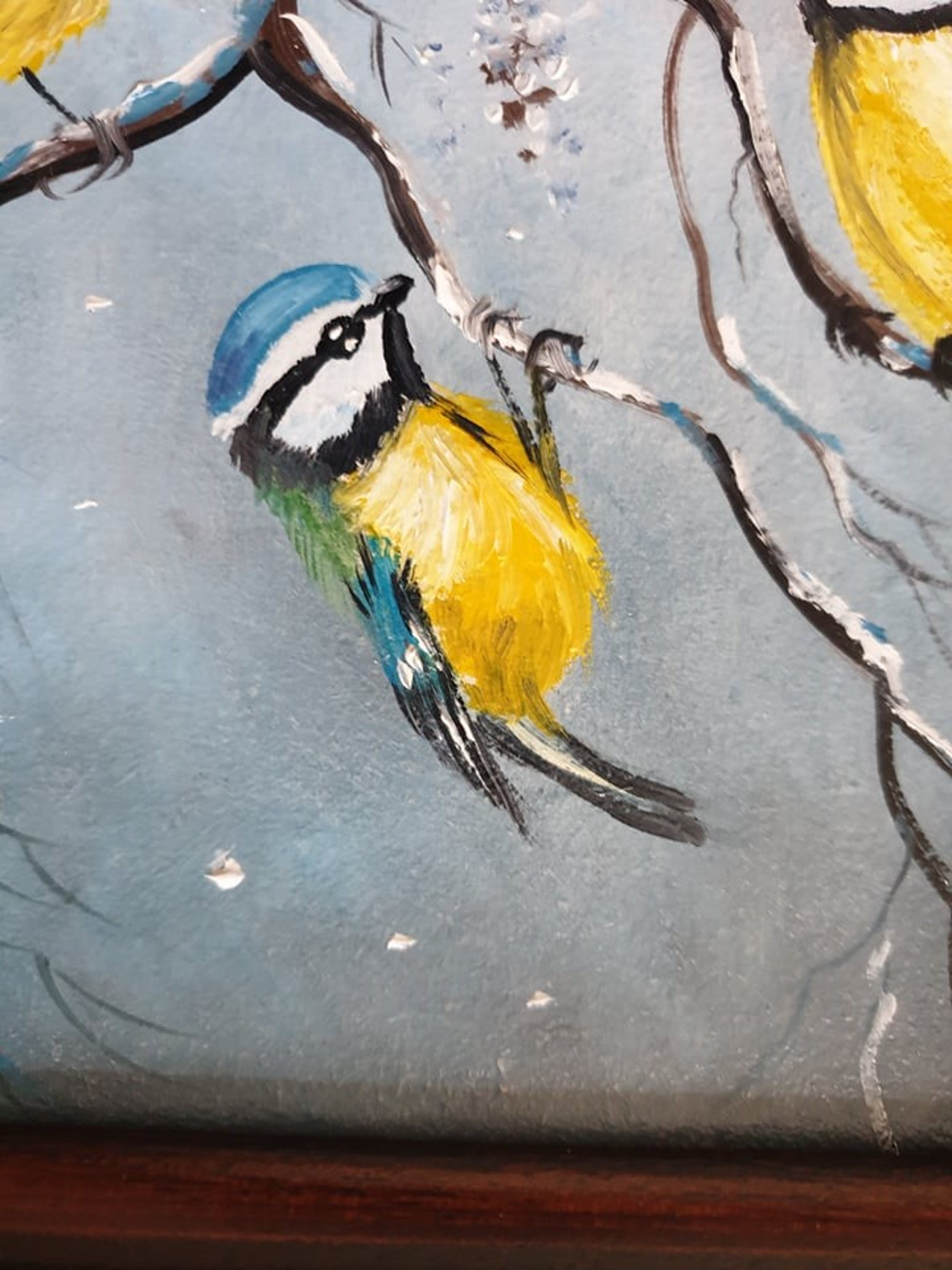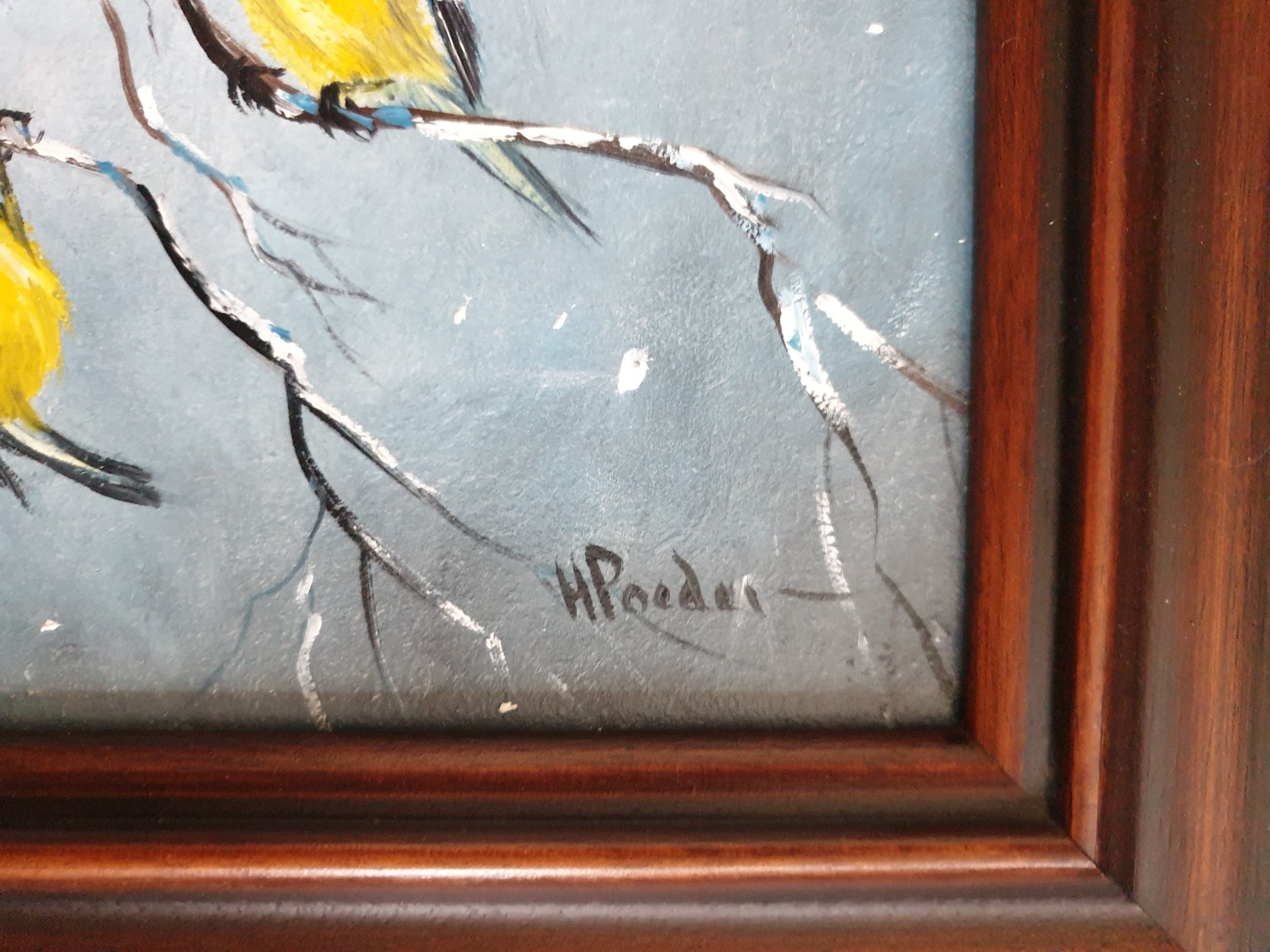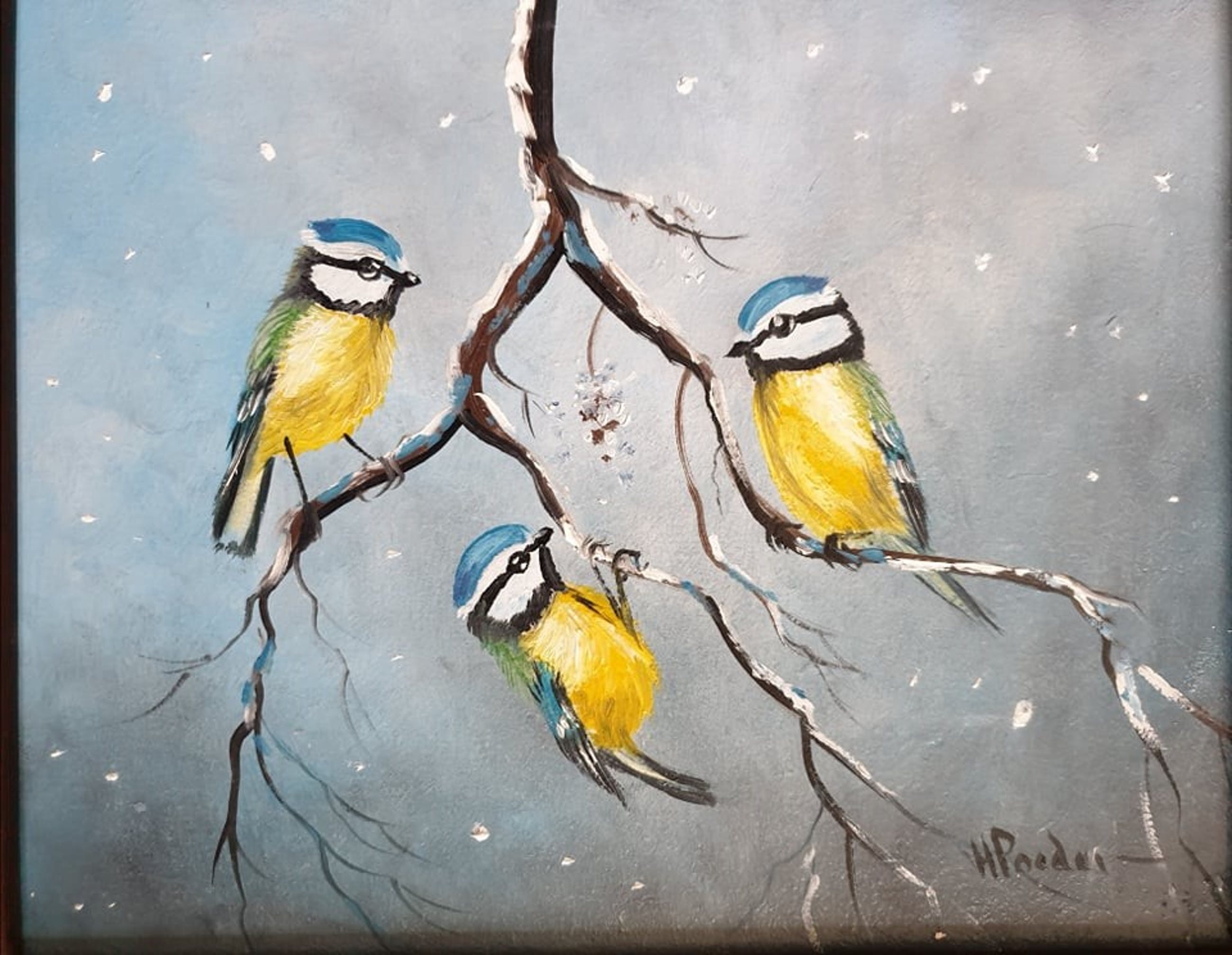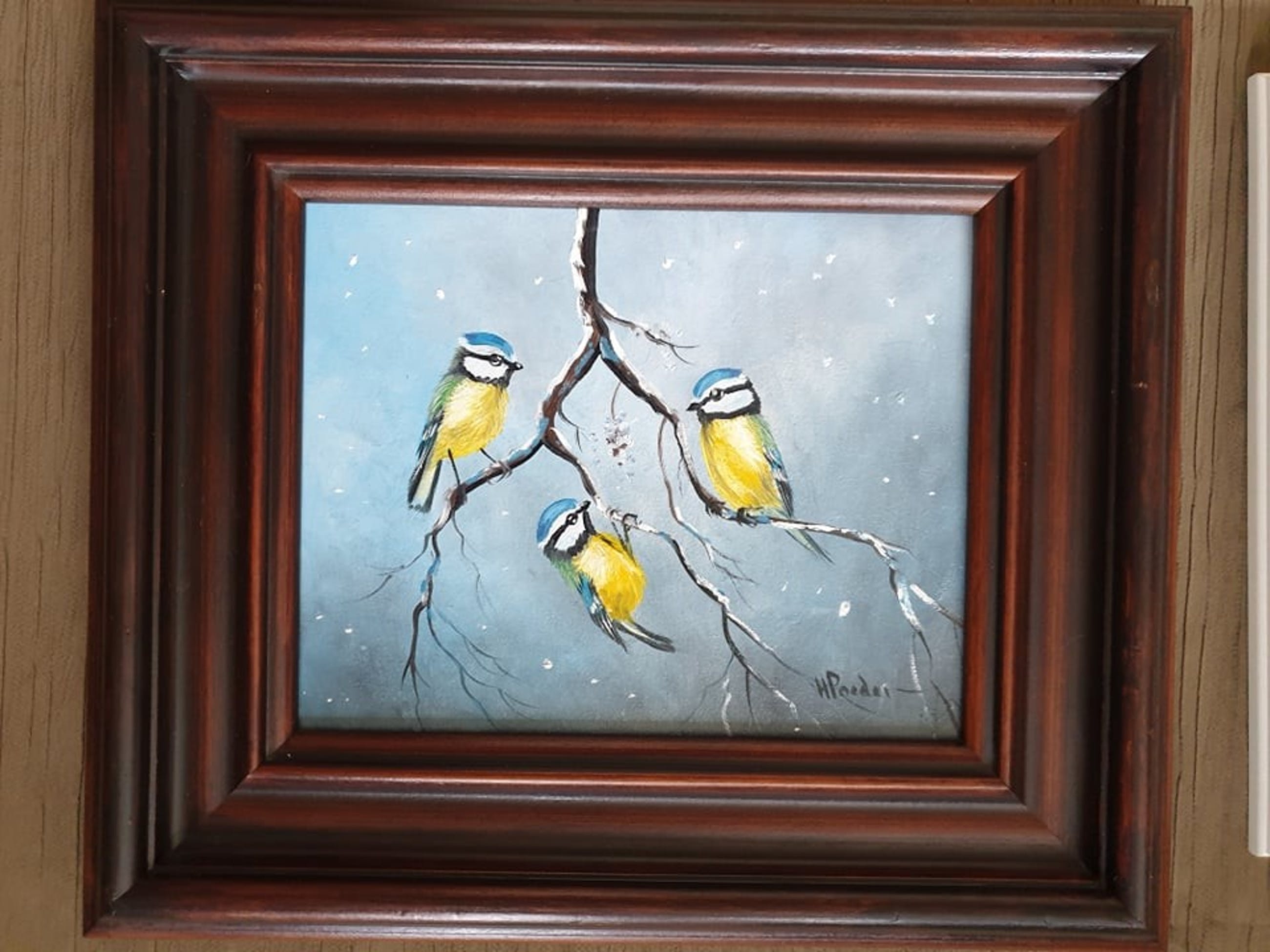 Henk Poeder is een van de bekendere Nederlandse kunstenaars. Hij schildert vooral landschappen, dieren uit het bos en stillevens. Zeer mooie kleine foto een beetje warmte in de bevroren winteromgeving! Drie kleine vogels, praten op de ijzige takken ze zeggen zeker hoe koud het is! Aan de achterkant van het schilderij verschijnt de stempel van de meester, maar hij schreef ook hieronder, met je eigen bord! Levering met trackingcode in professionele verpakking!