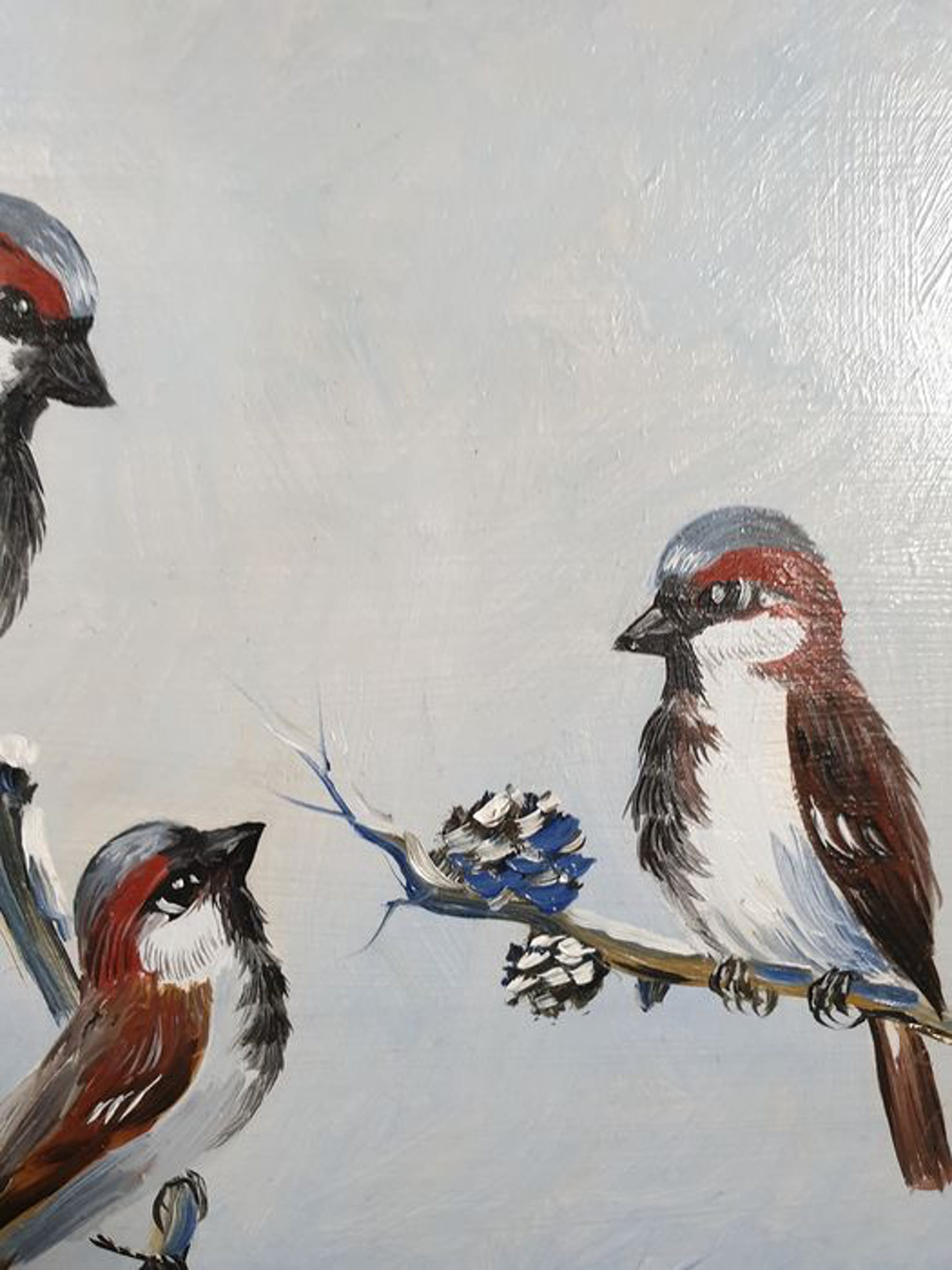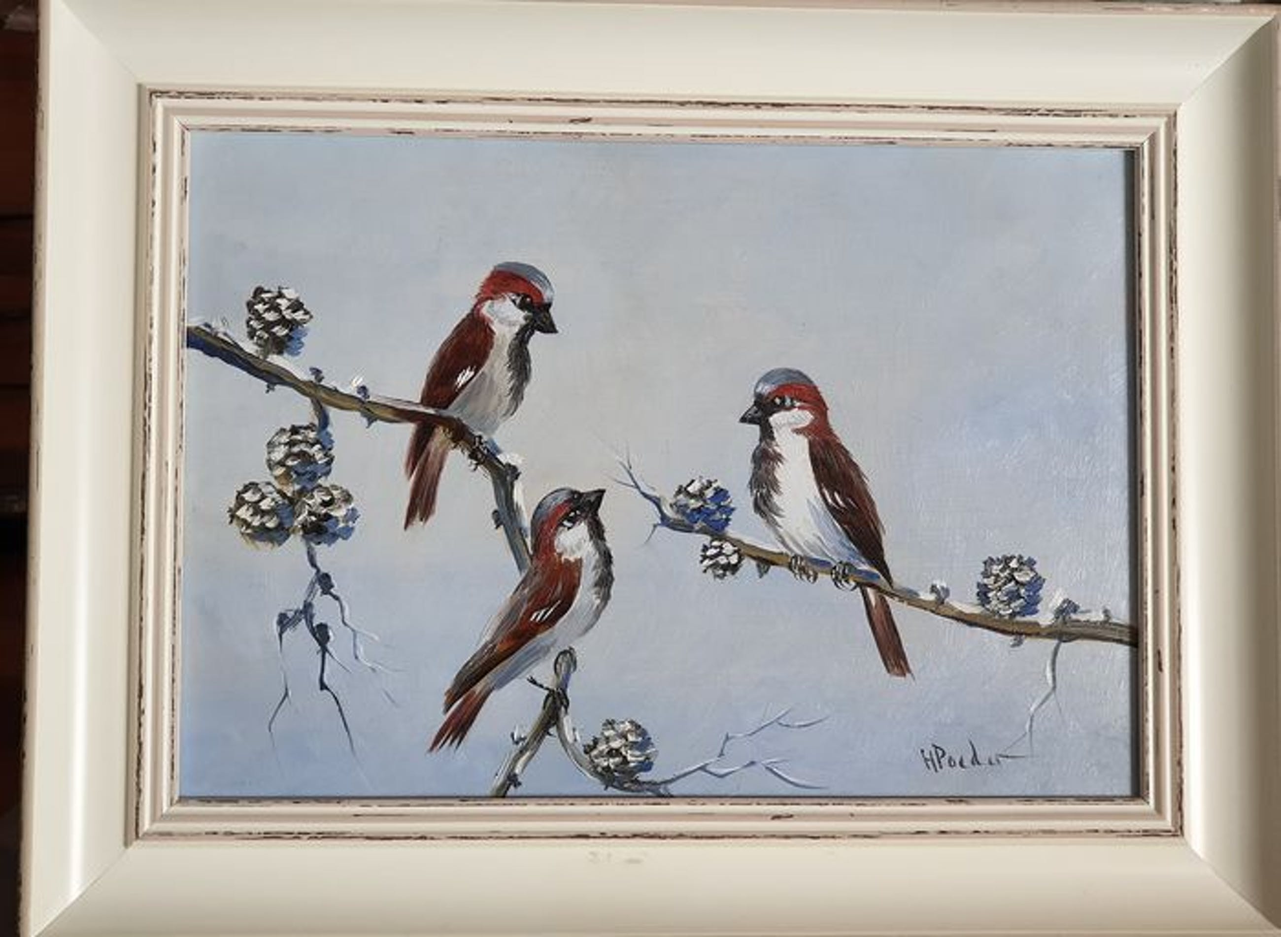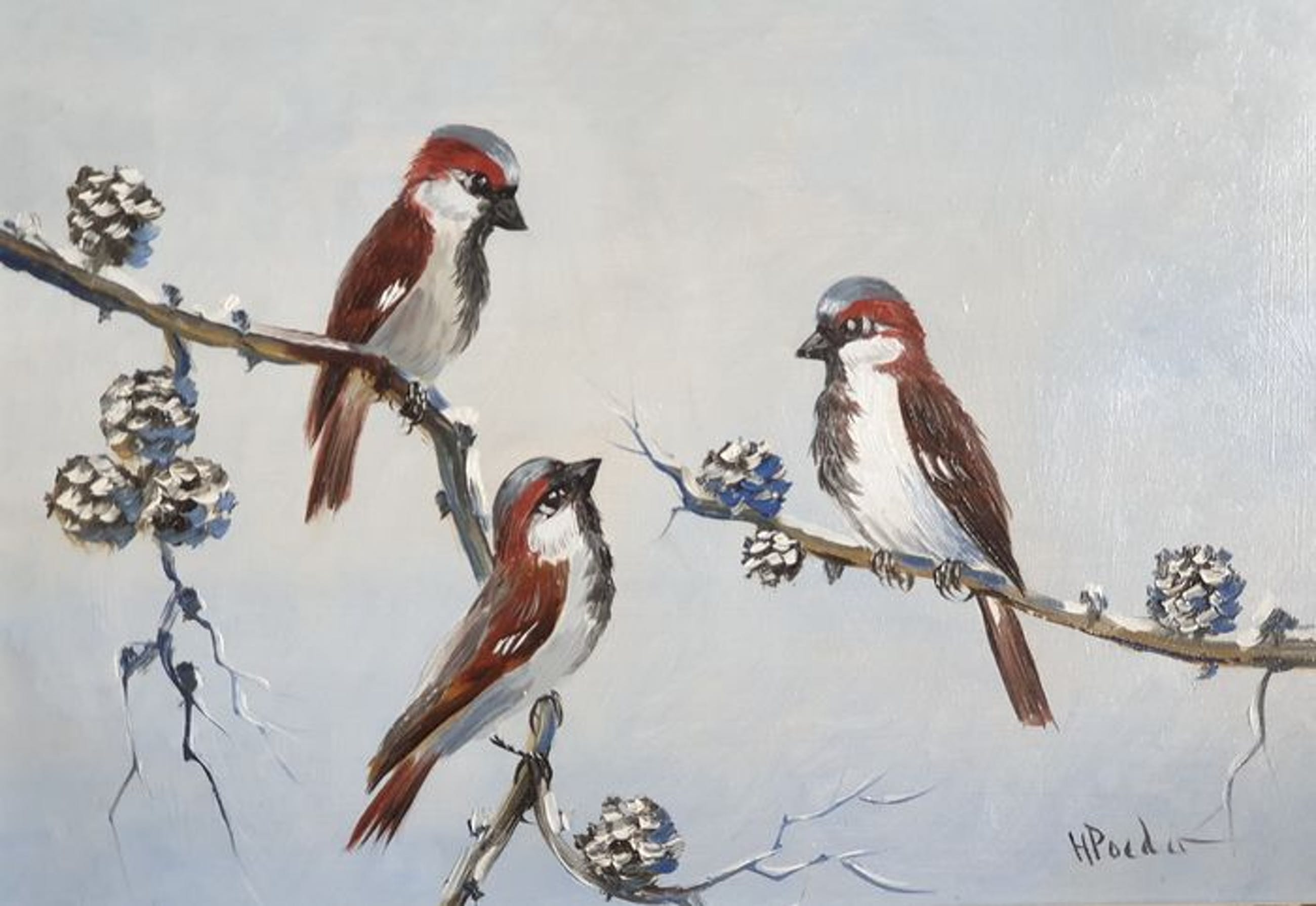 Henk Poeder is een van de bekendere Nederlandse kunstenaars. Hij schildert vooral landschappen, dieren uit het bos en stillevens. Zeer mooie kleine foto een beetje warmte in de bevroren winteromgeving! Drie kleine vogels, praten op de ijzige takken ze zeggen zeker hoe koud het is! Aan de achterkant van het schilderij verschijnt de stempel van de meester, maar hij schreef ook hieronder, met je eigen bord! Levering met trackingcode in professionele verpakking!
