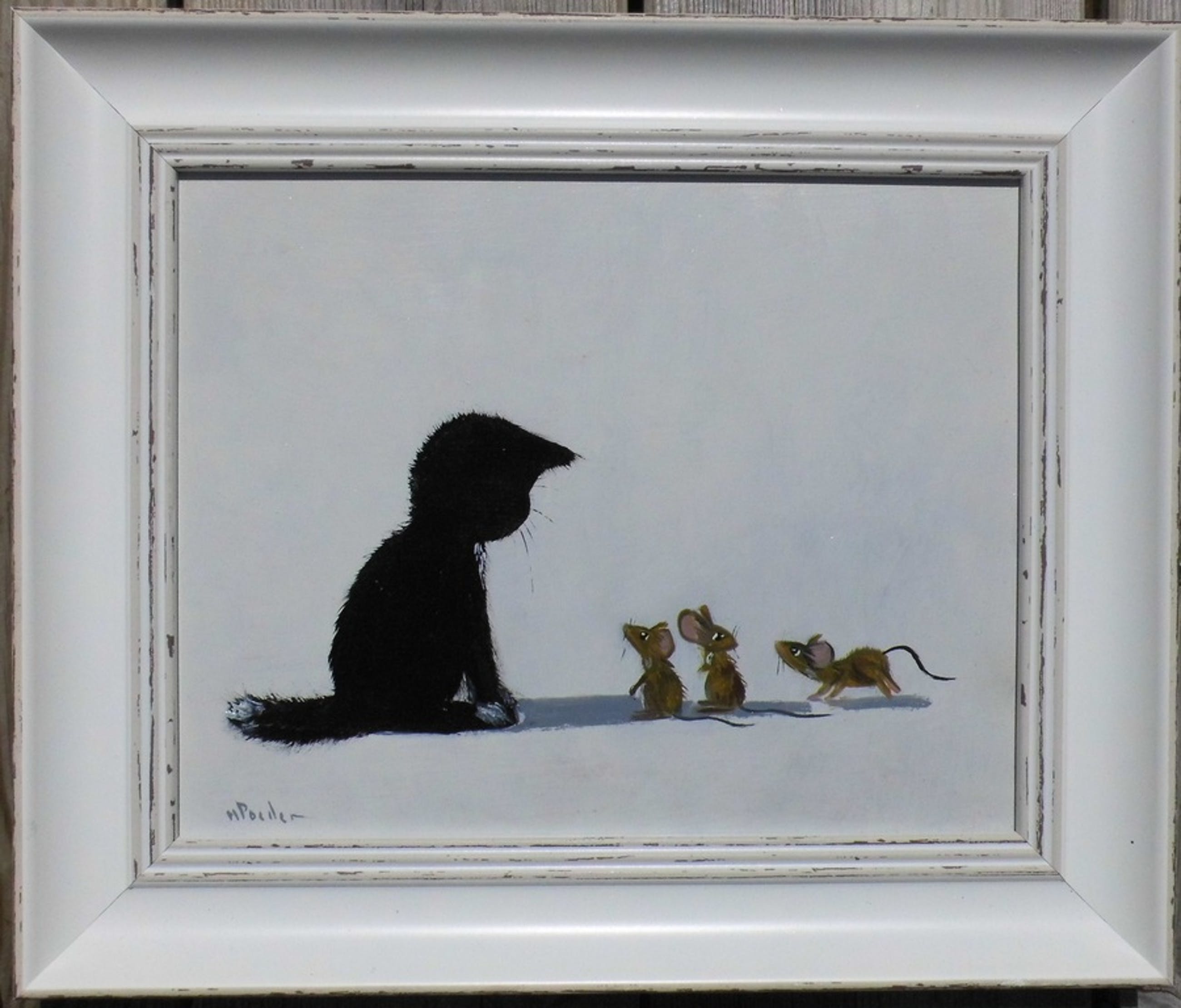 Zeer enig schilderijtje met een kitten en een aantal muisjes. Hij kijkt aandachtig en weer niet zo goed wat de ermee aan moet.