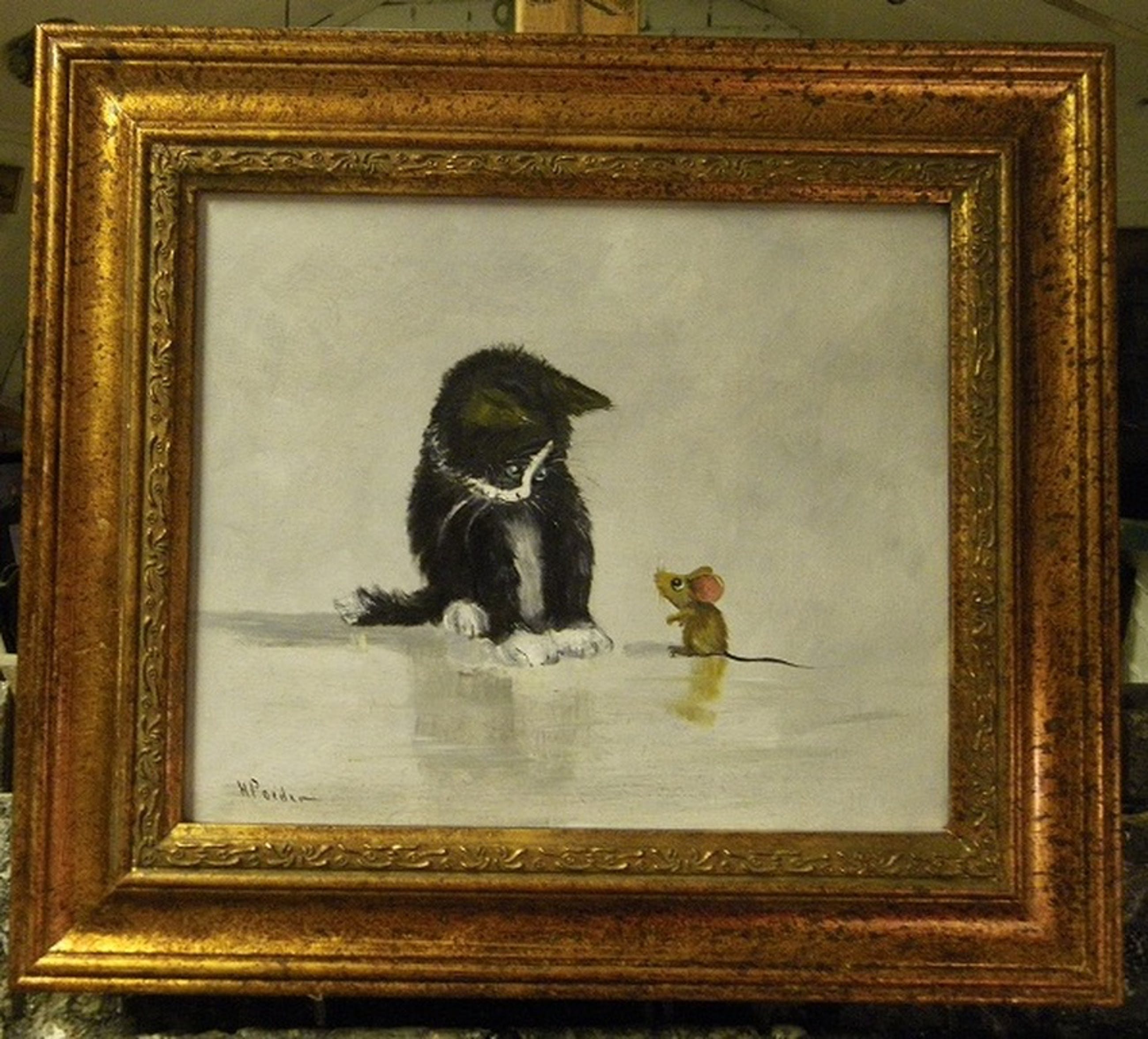 Zeer leuk en enig schilderijtje van een poesje die bedachtzaam naar het muisje kijkt.