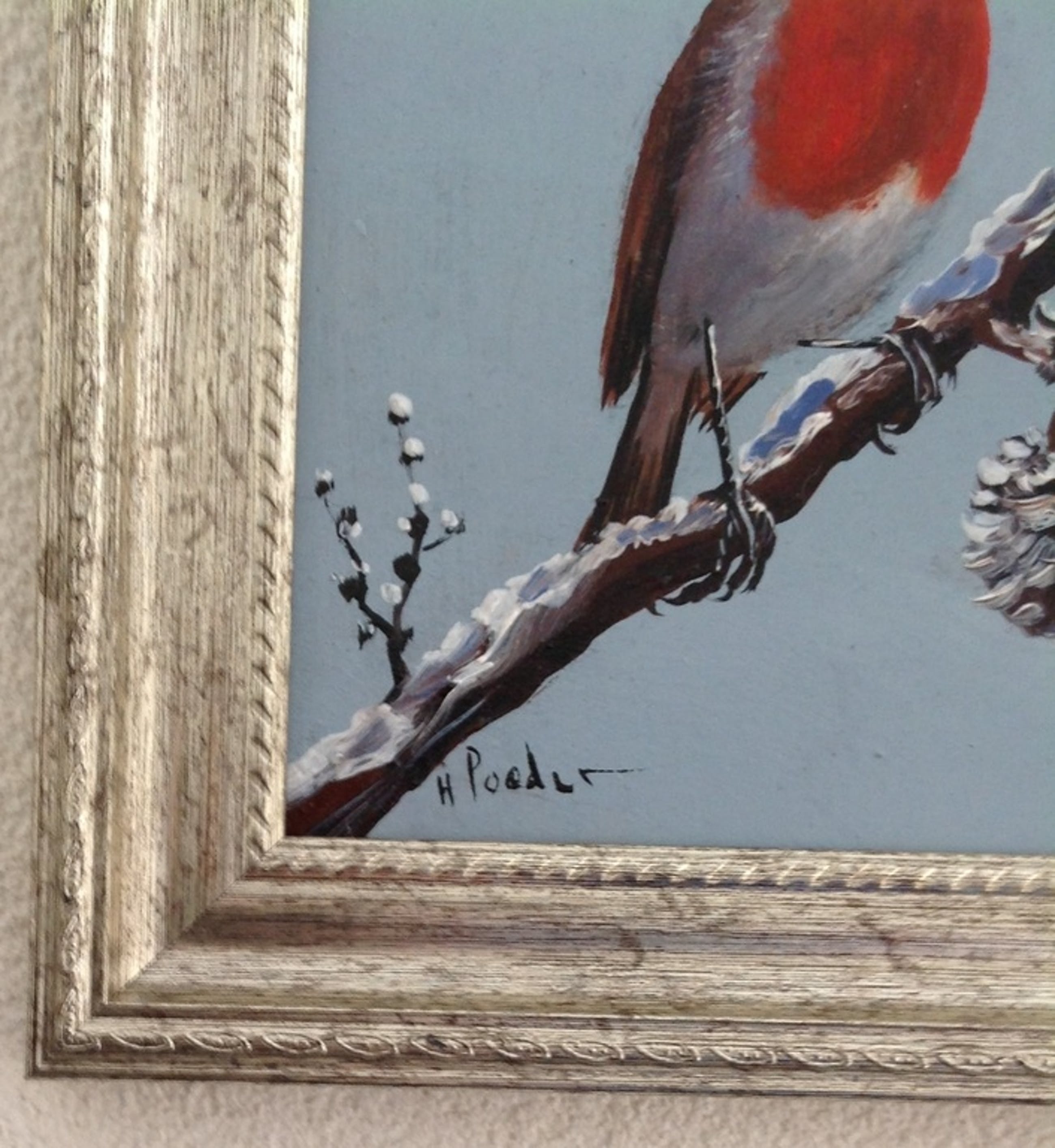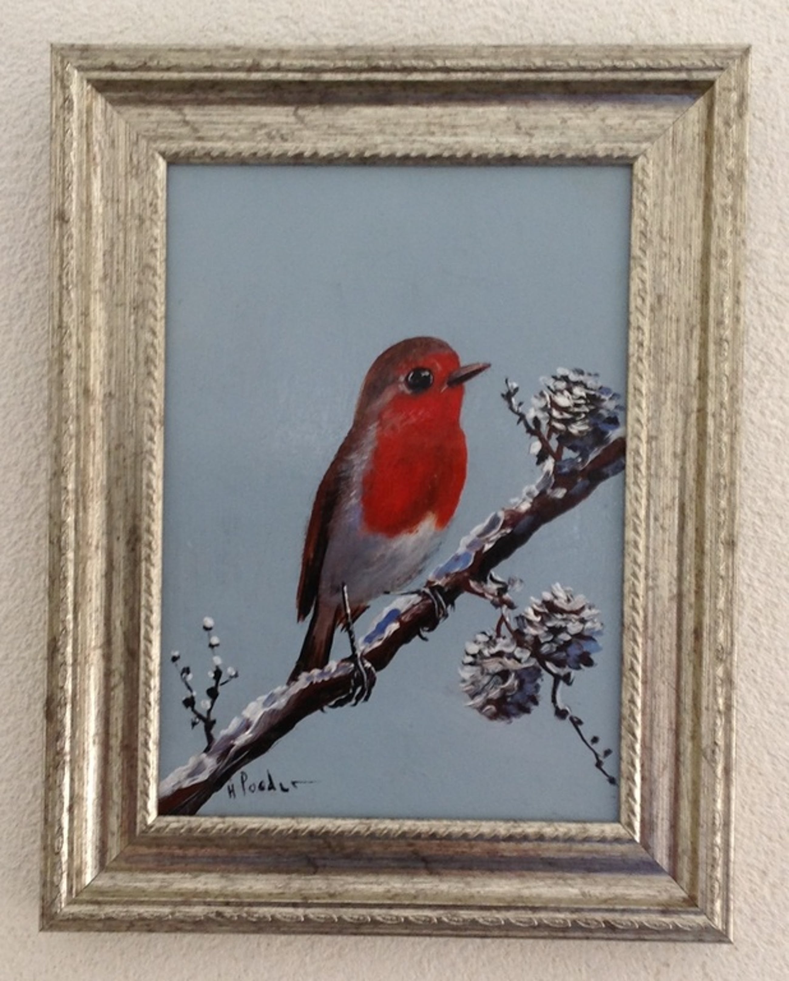 Zeer leuk en herkenbaar schilderij van een roodborstje in de sneeuw. Het mooie en nostalgische beeld in de voortuin tijdens de koude maanden.