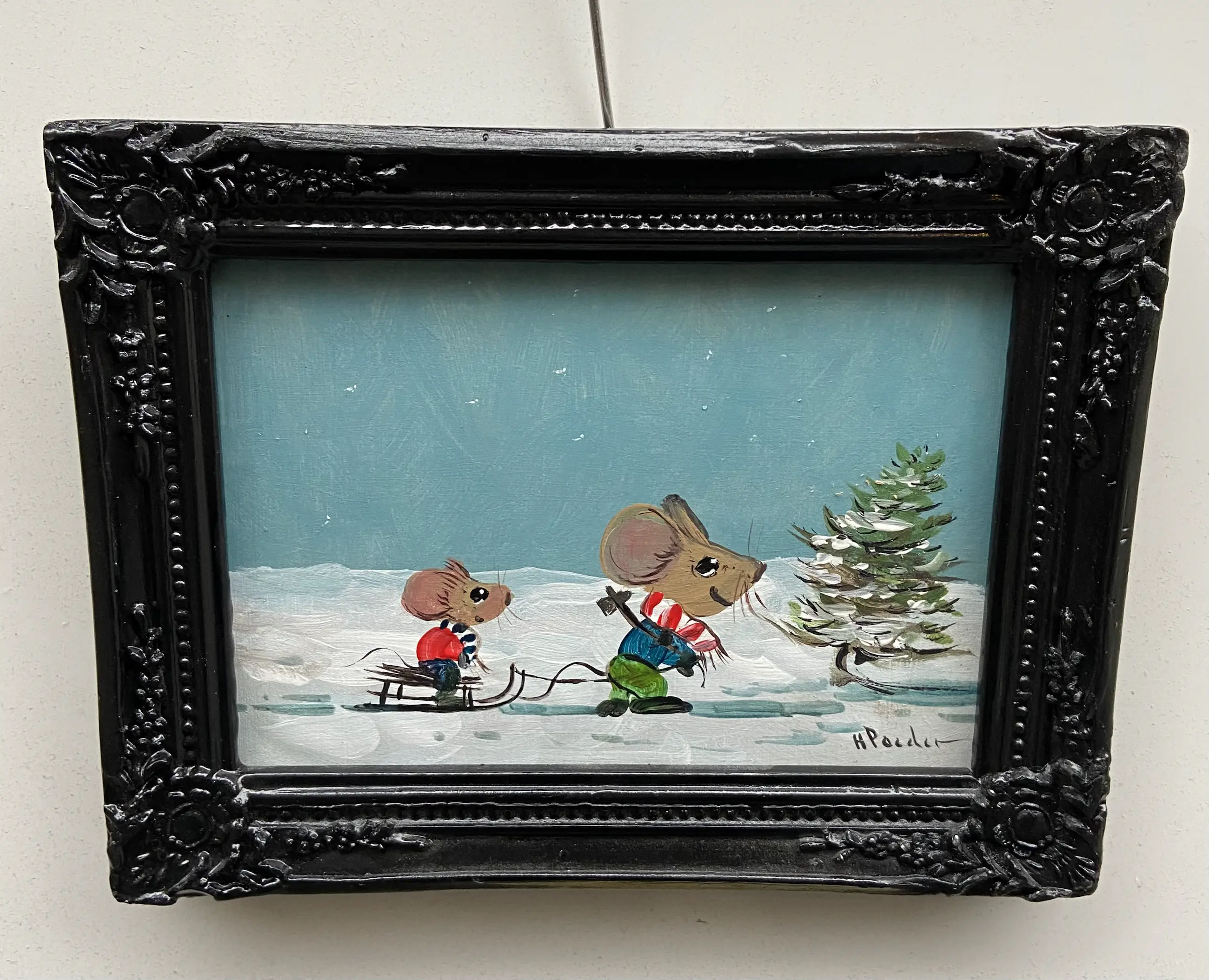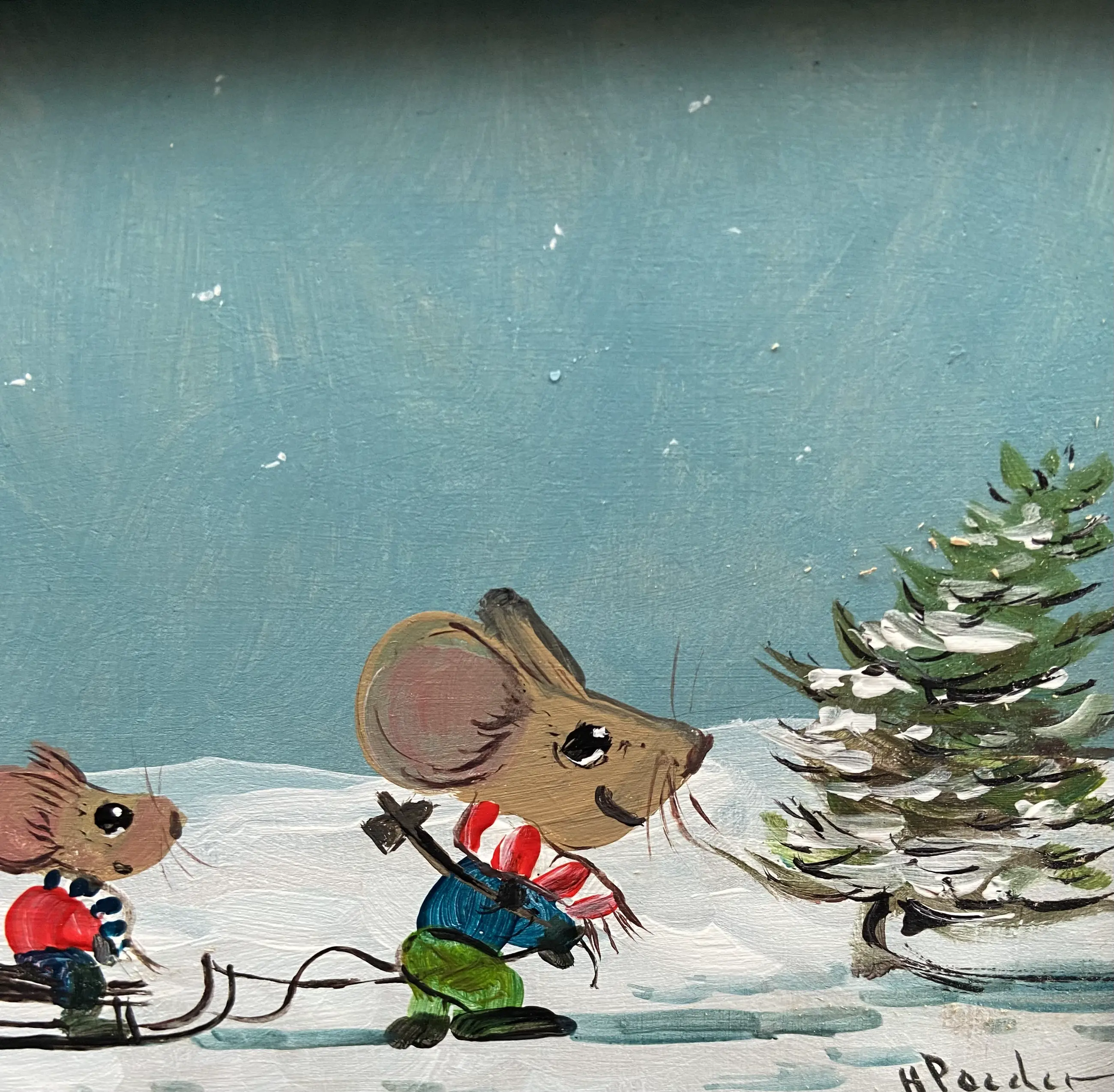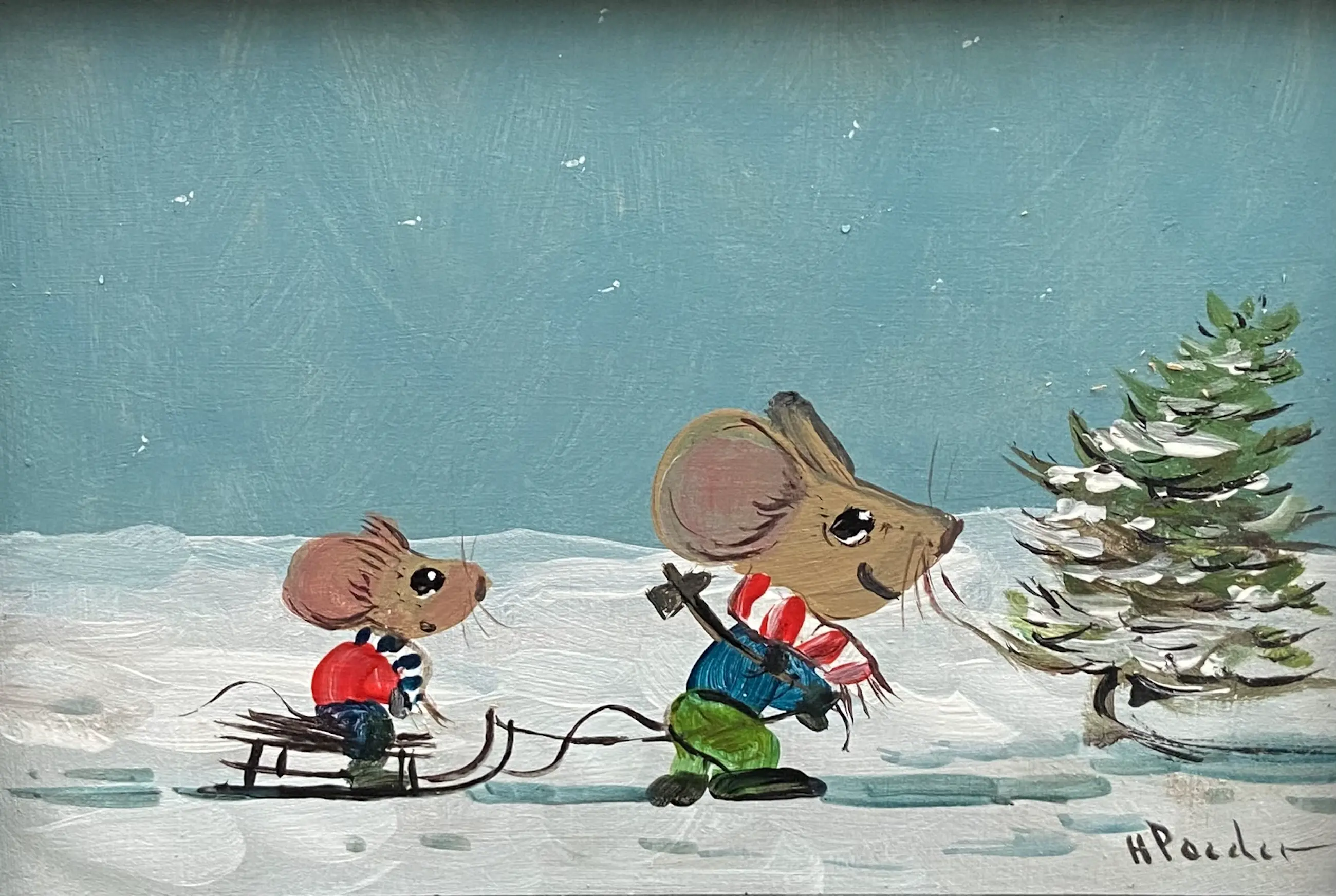 Leuk werk van Henk poeder 1964 betreft een kerst schilderijtje 2 muisjes met de slee en ze gaan een kerstboom zoeken voor in hun huisje schilderij is rechts onder gesigneerd h poeder