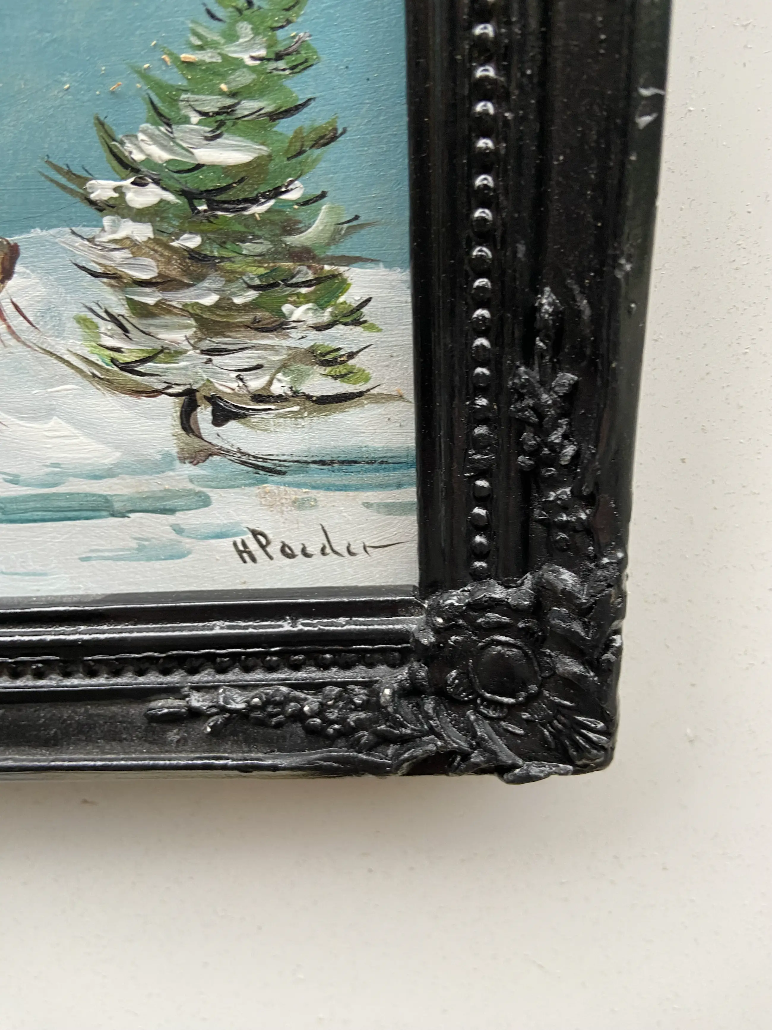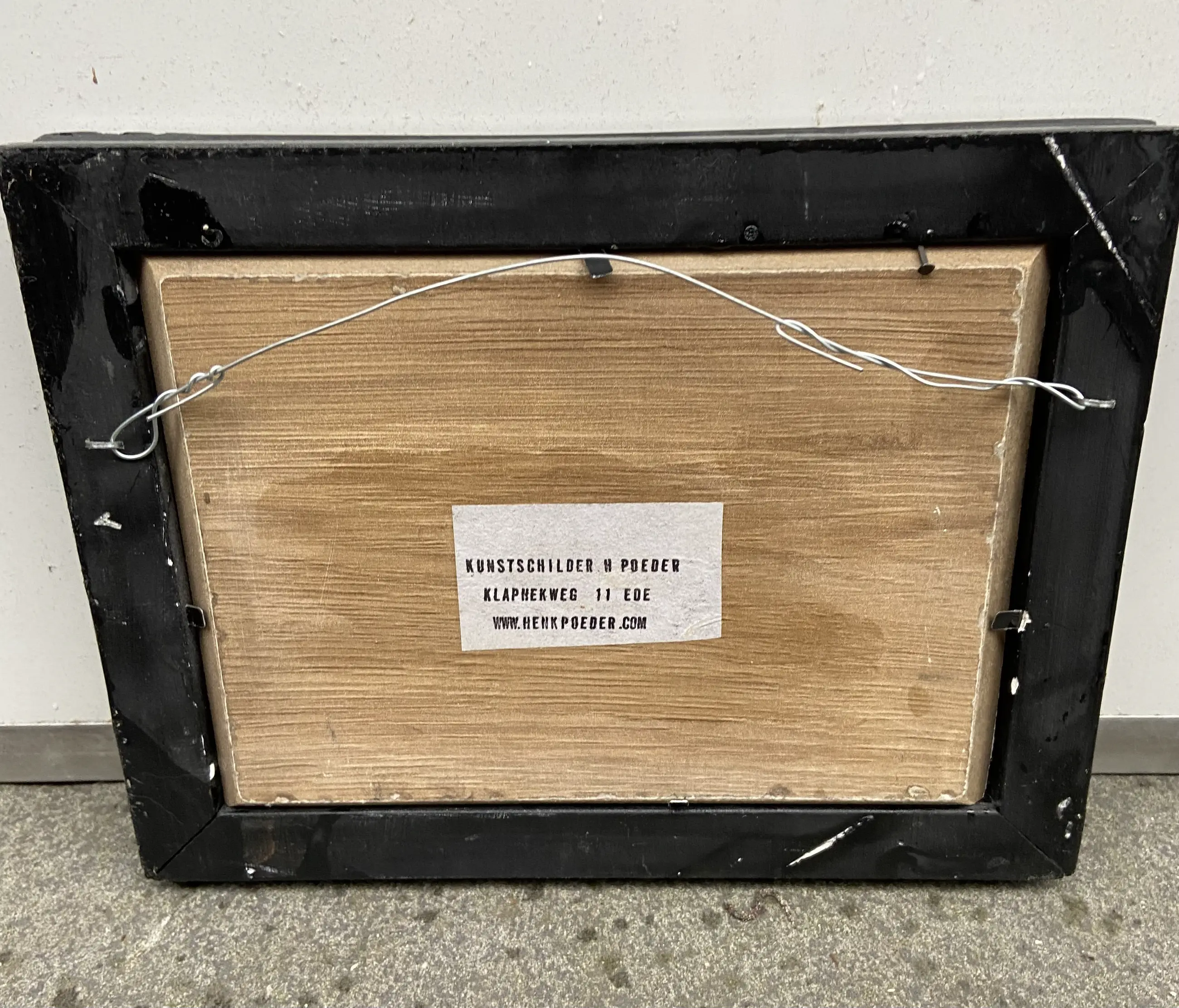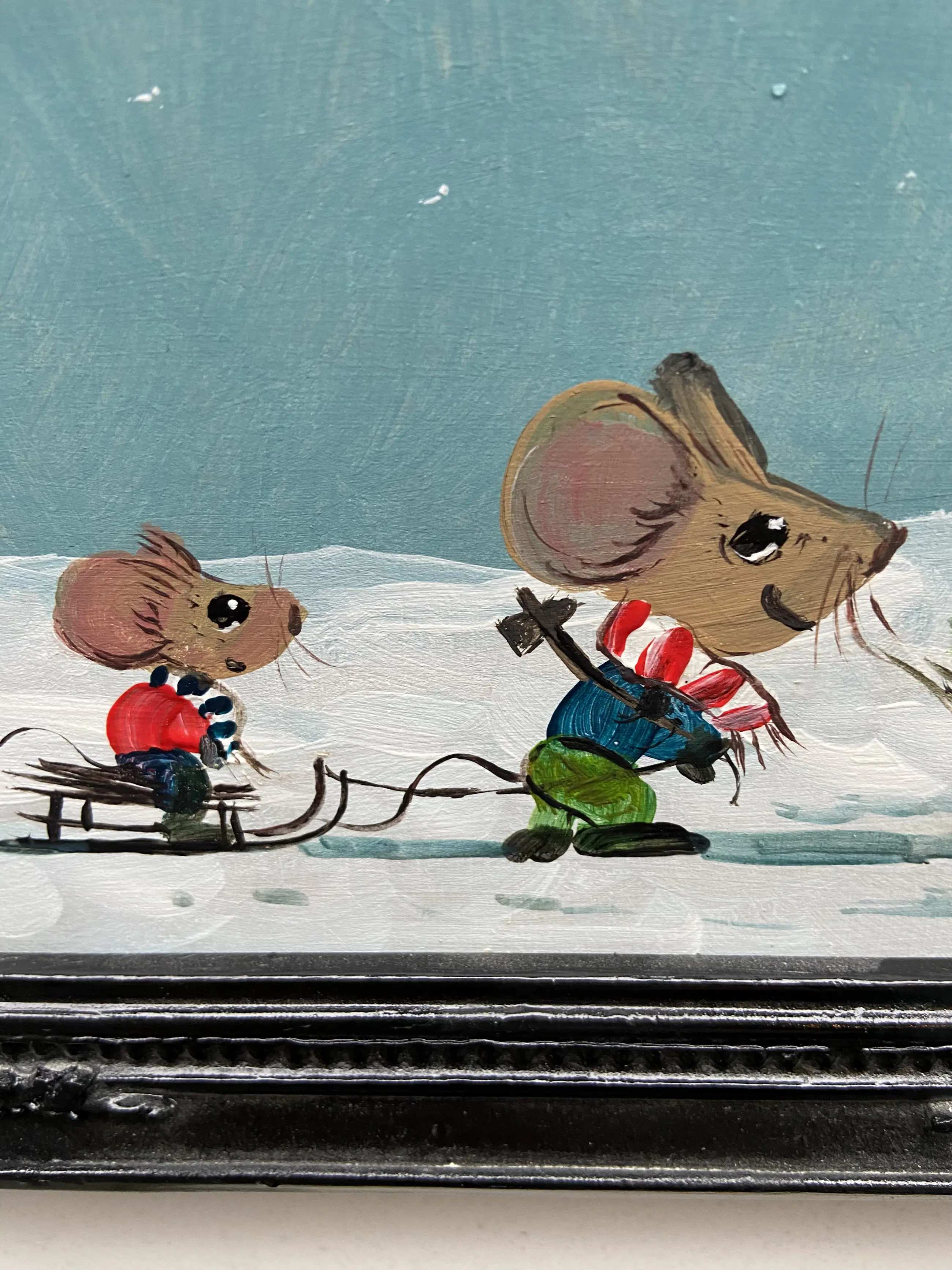 Leuk werk van Henk poeder 1964 betreft een kerst schilderijtje 2 muisjes met de slee en ze gaan een kerstboom zoeken voor in hun huisje schilderij is rechts onder gesigneerd h poeder