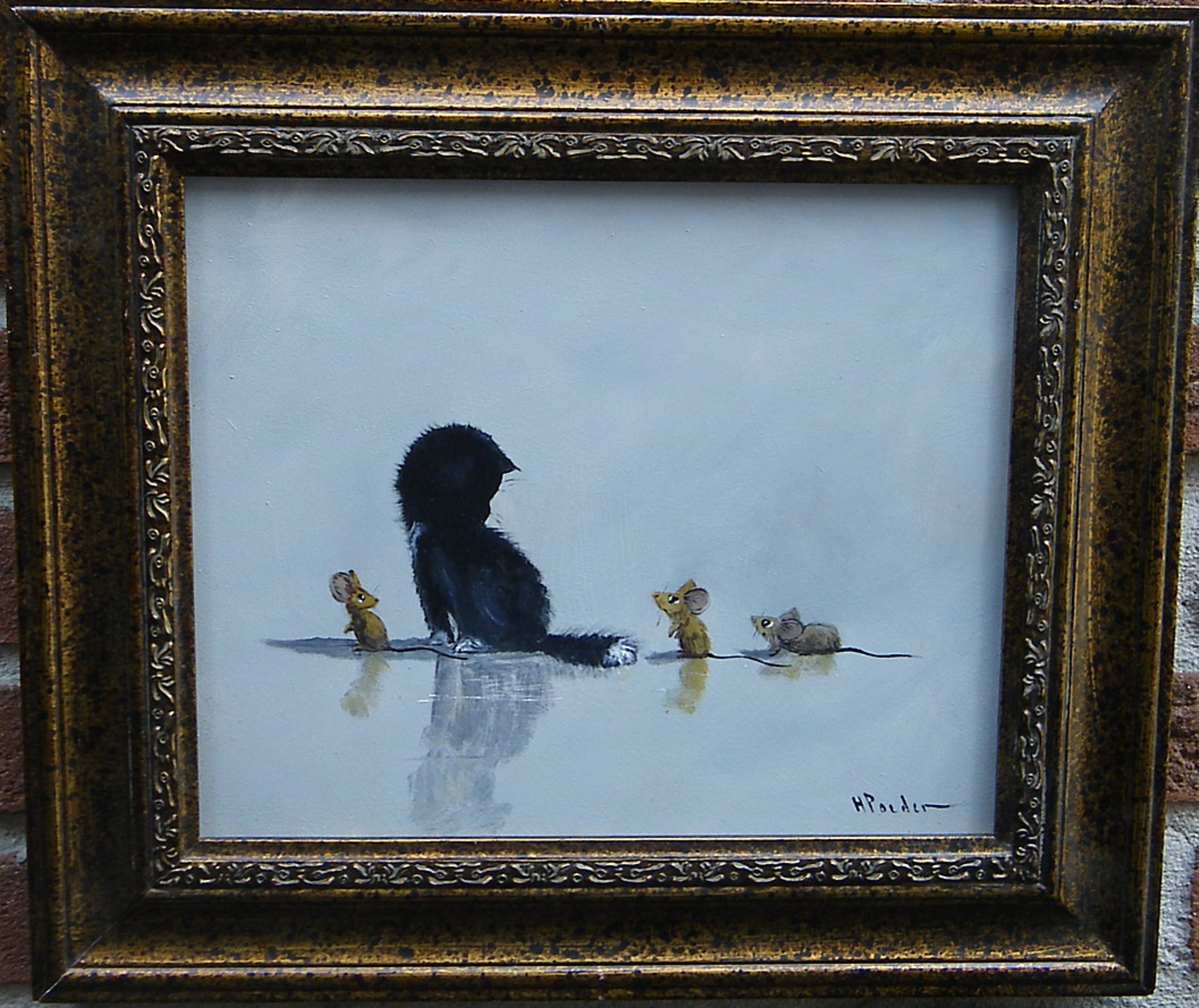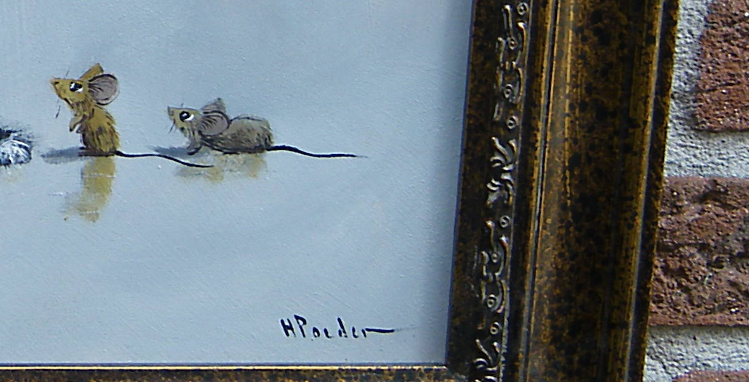 kitten met 3 muisjes die niet bang zijn voor een klein poesjegesigneerd ro H Poeder mooie lijst en schilderij netjes in de vernis .