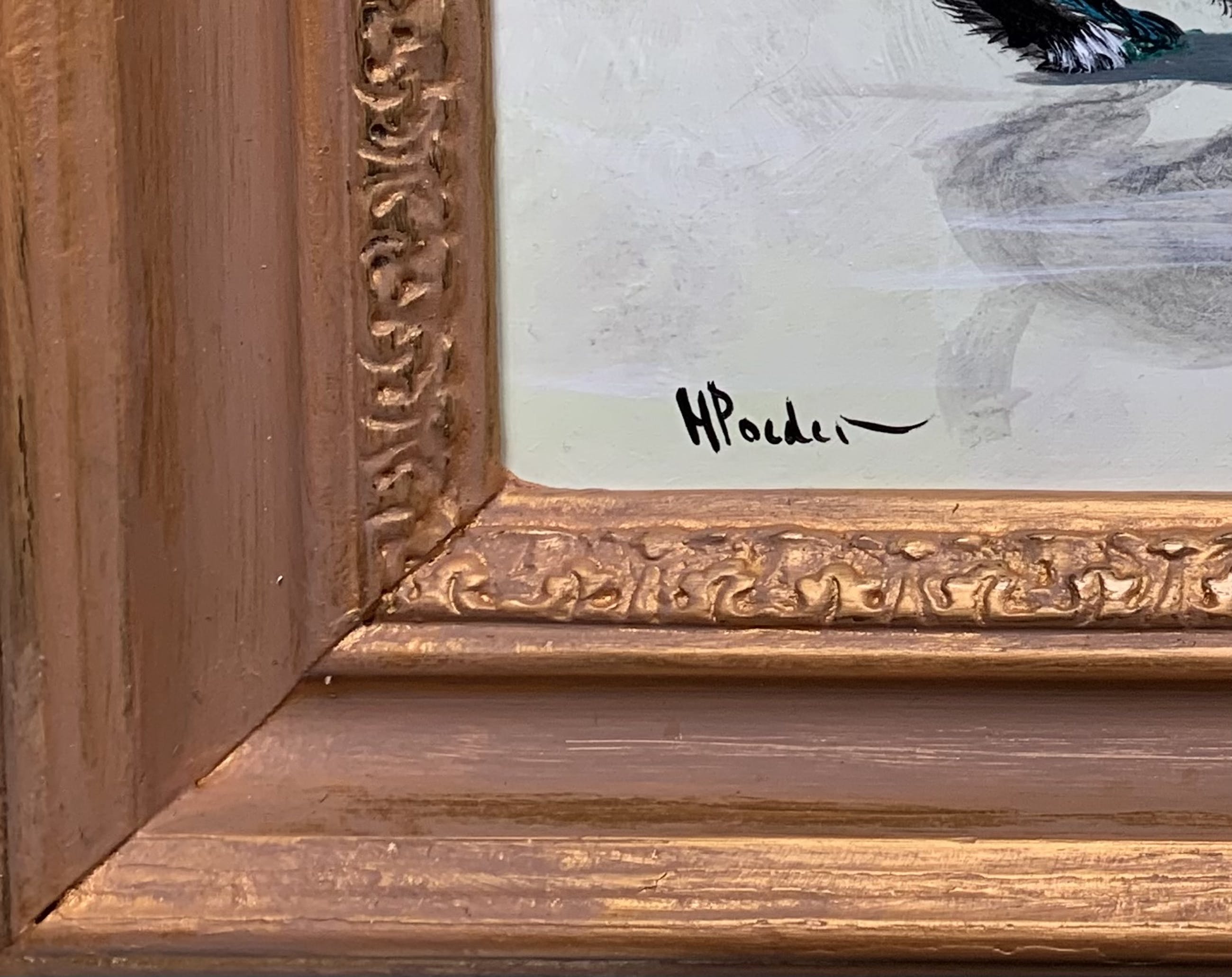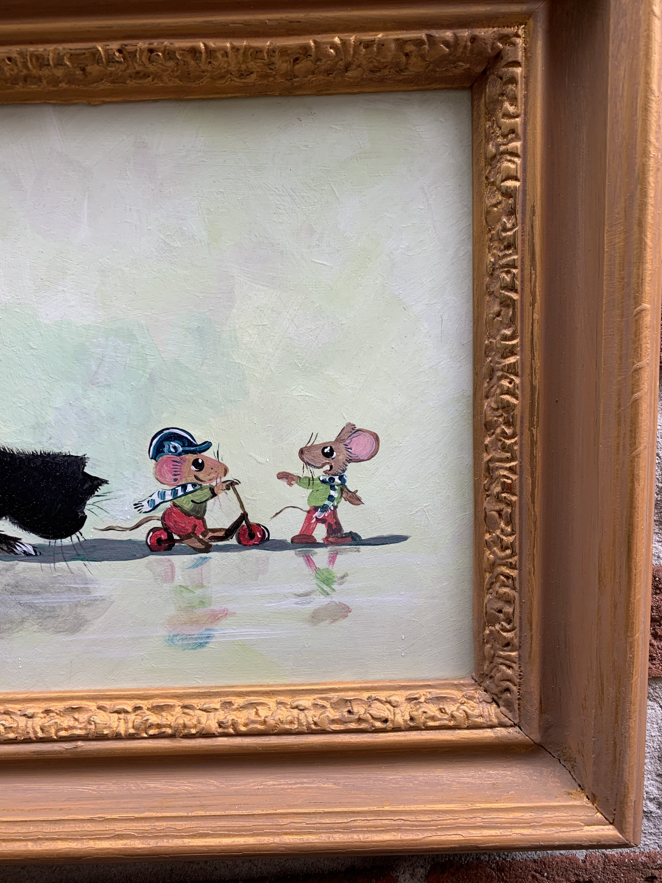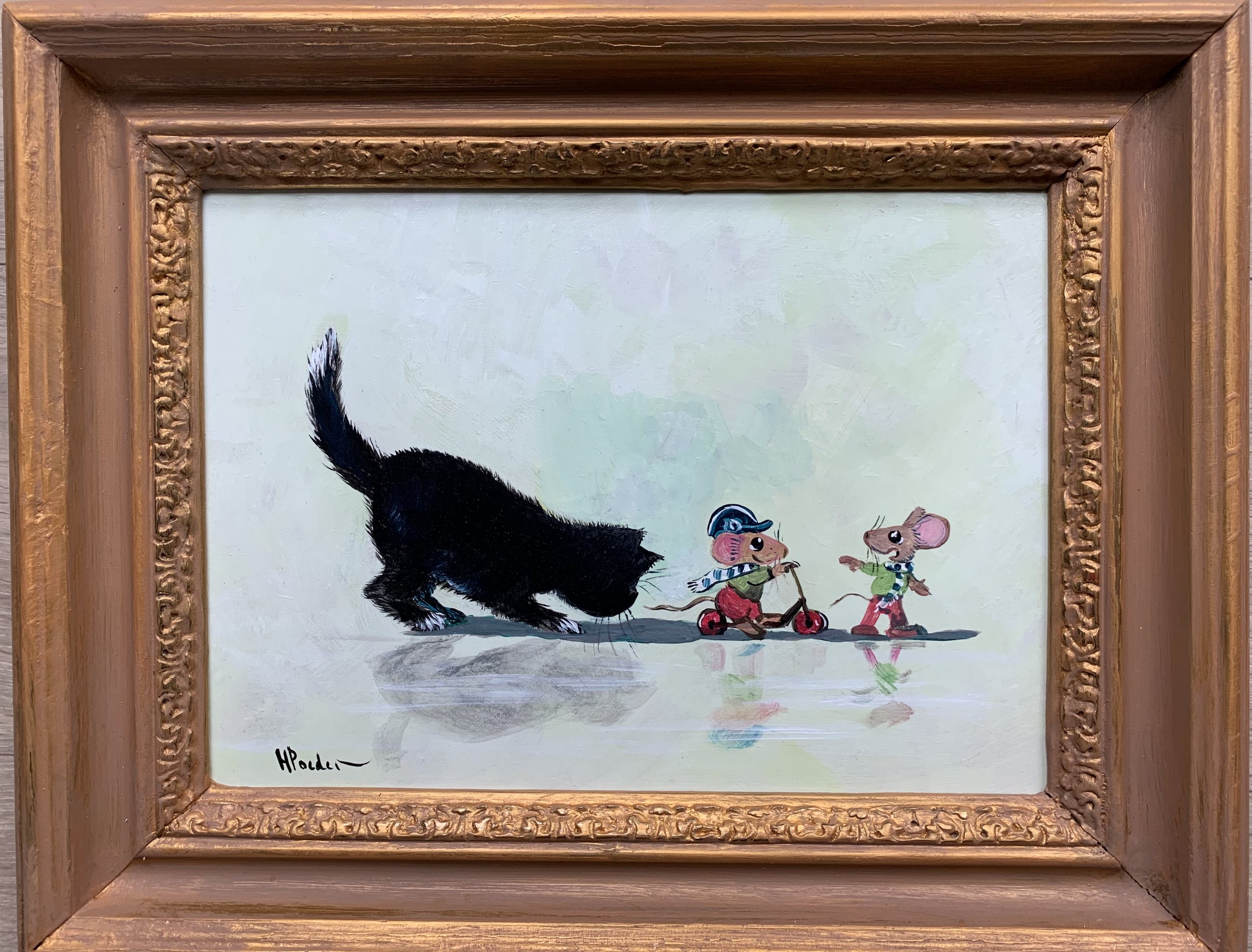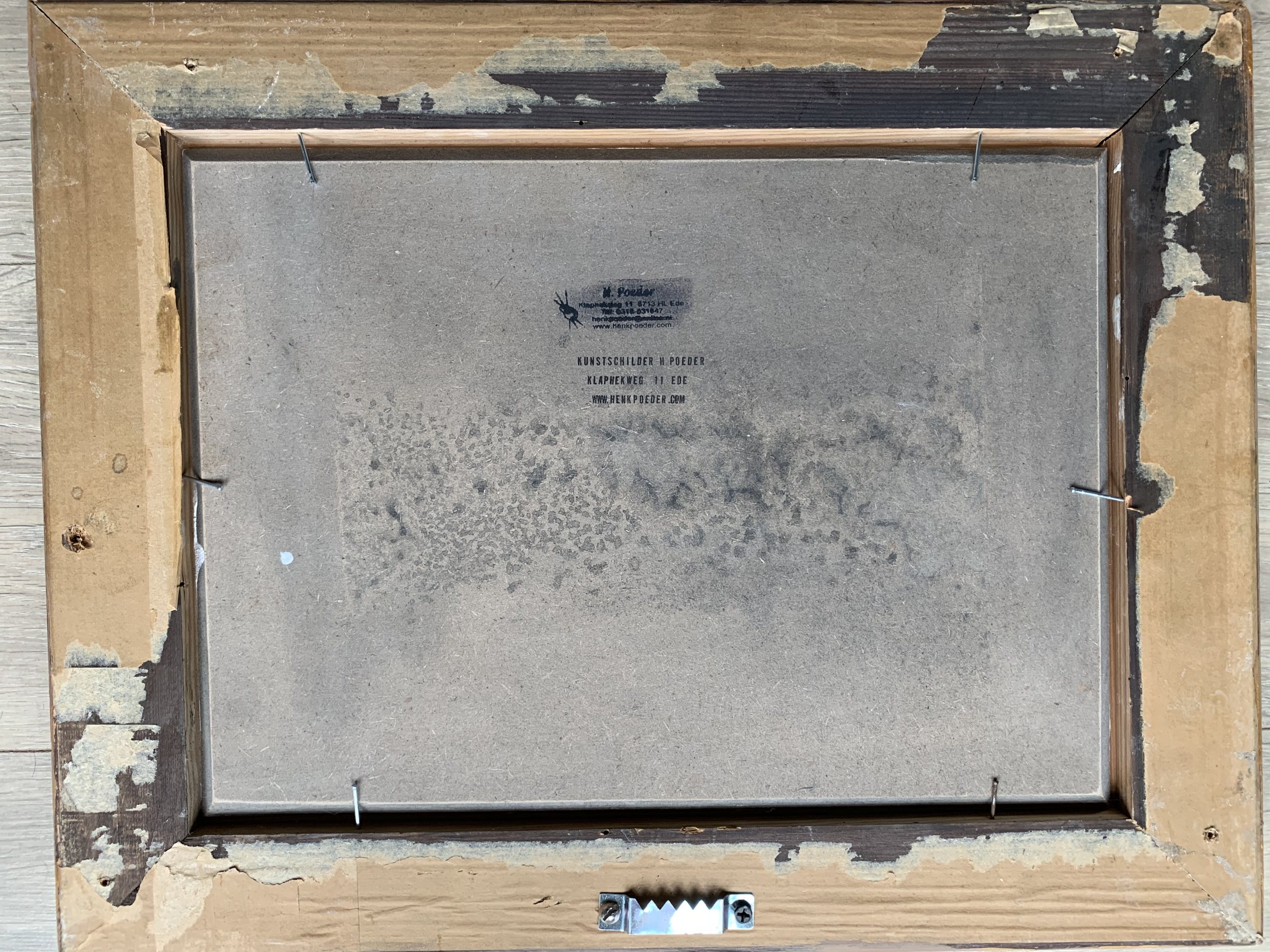 Grappig olieverf schilderij v henk poeder in een leuke oude lijst schilderij betreft een kitten met 2 muisjes met een step links onder gesigneerd h poeder zie voor info ook het (rkd in Denhaag ).