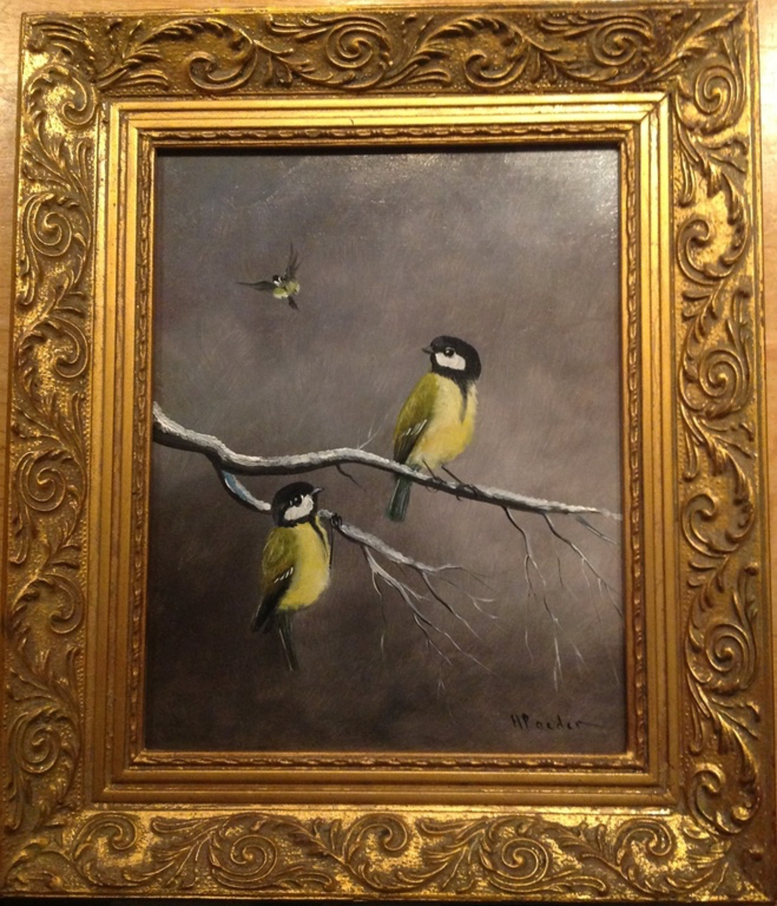 Zeer leuk schilderijtje van meerdere koolmezen aan een tak in de sneeuw.