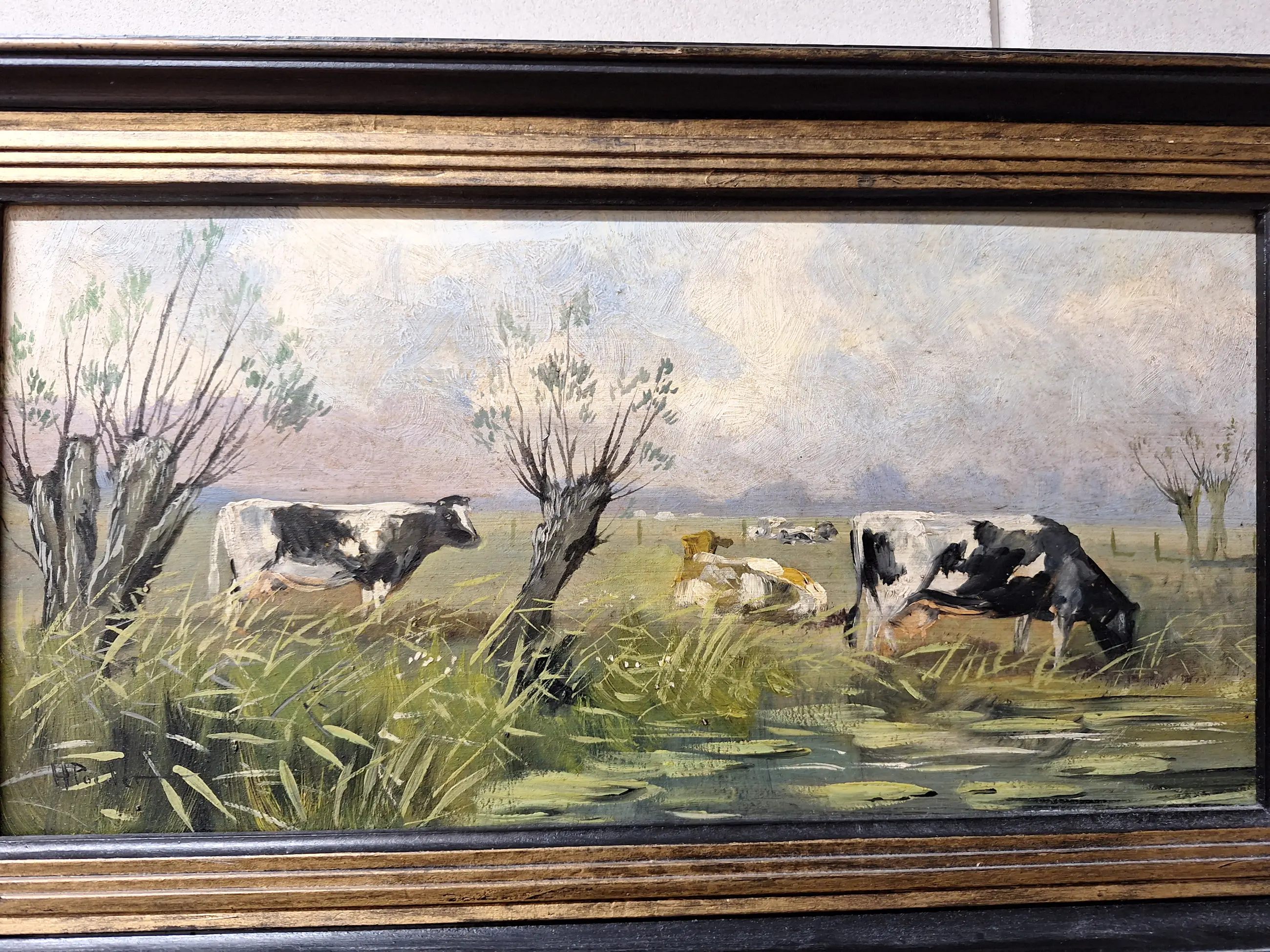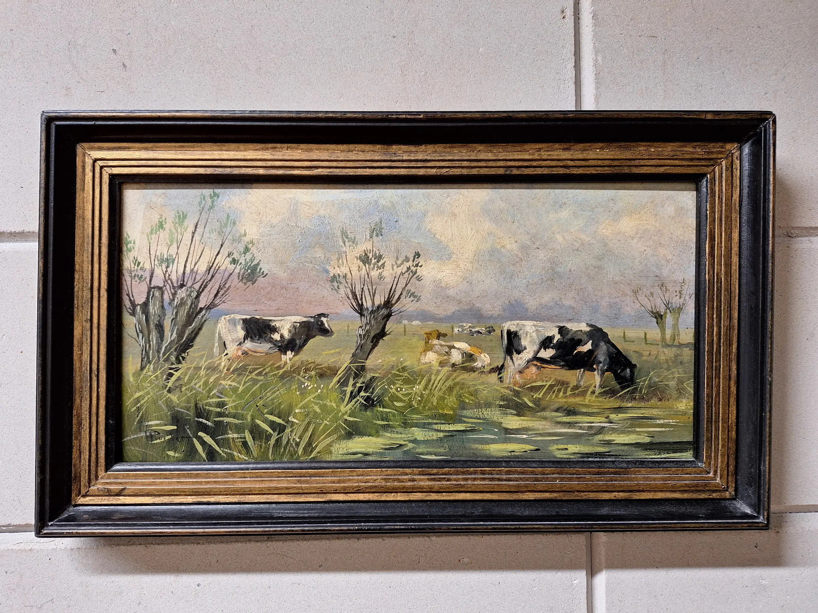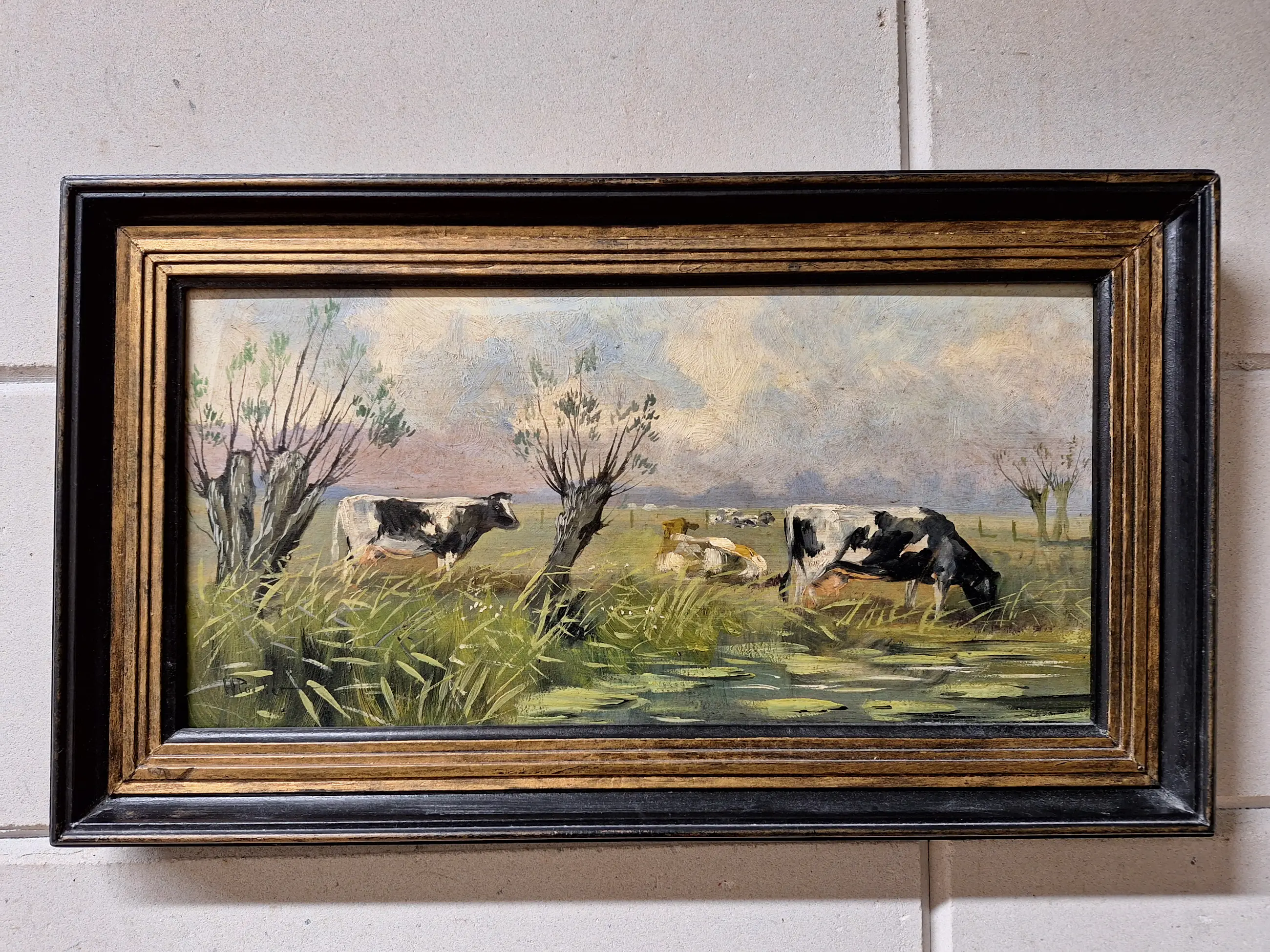 Te koop een mooi schilderij met een Landschap met koeien Maat is 27 bij 47 Gesigneerd H Poeder