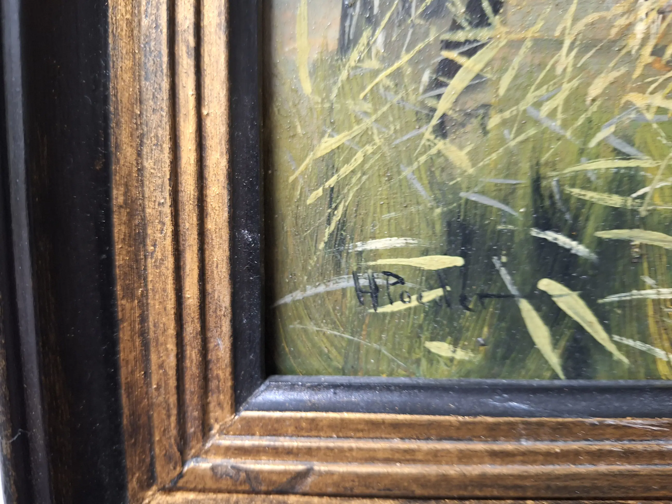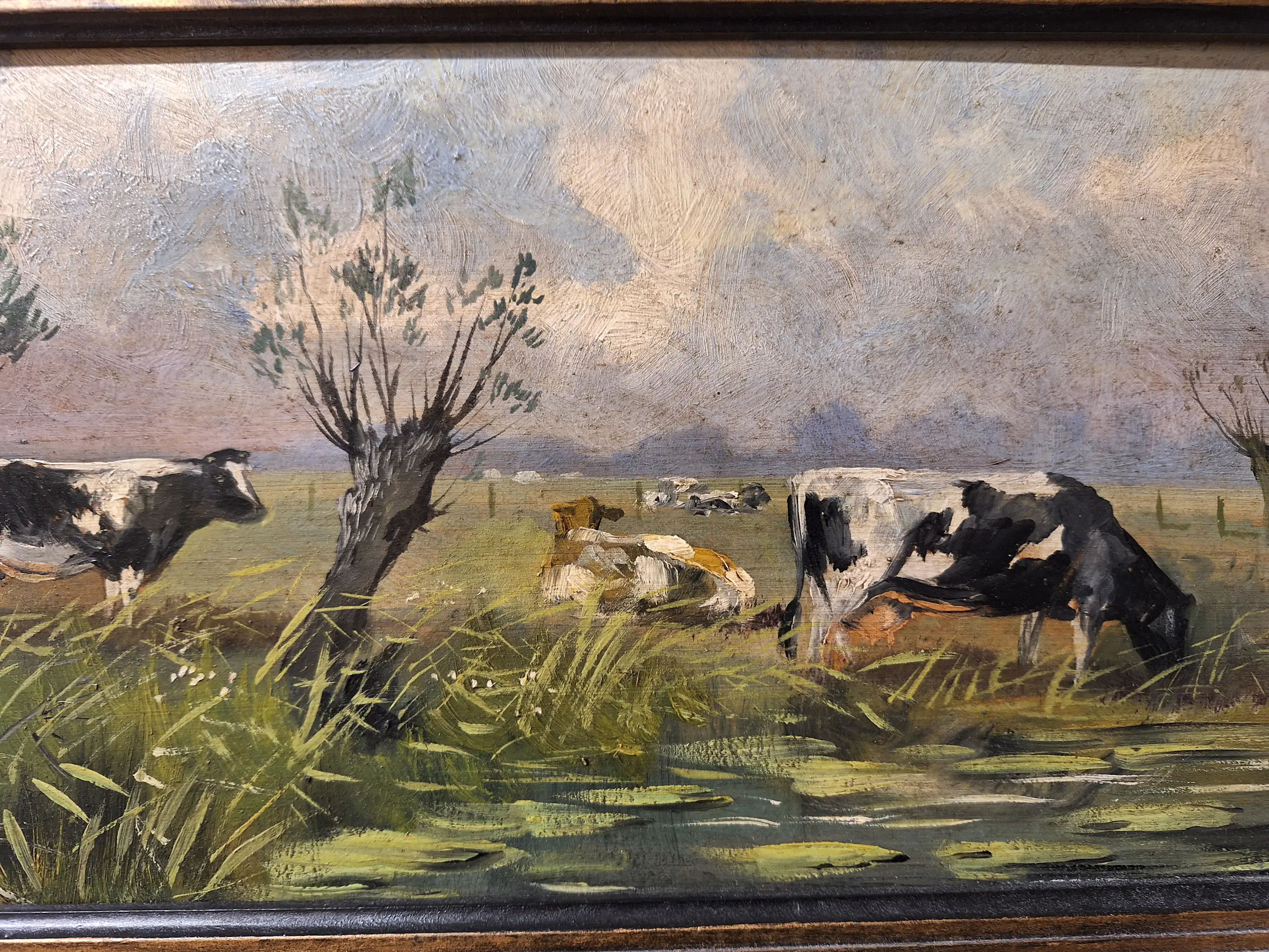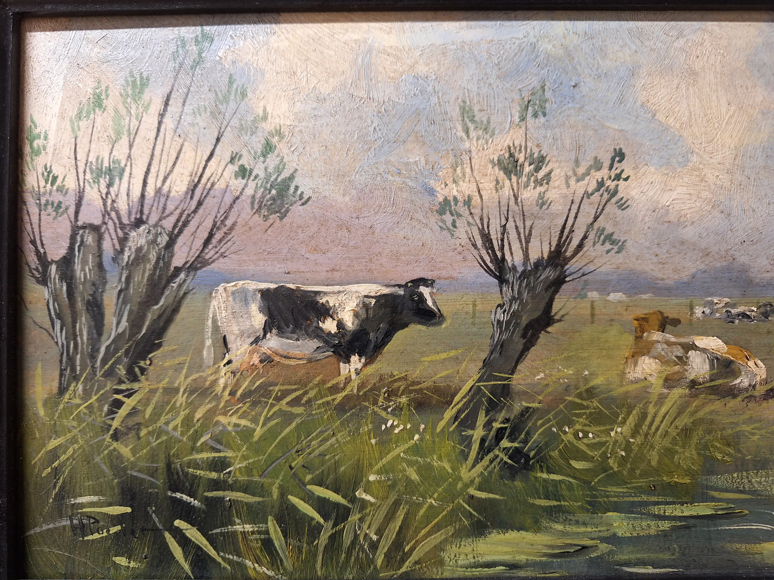 Te koop een mooi schilderij met een Landschap met koeien Maat is 27 bij 47 Gesigneerd H Poeder