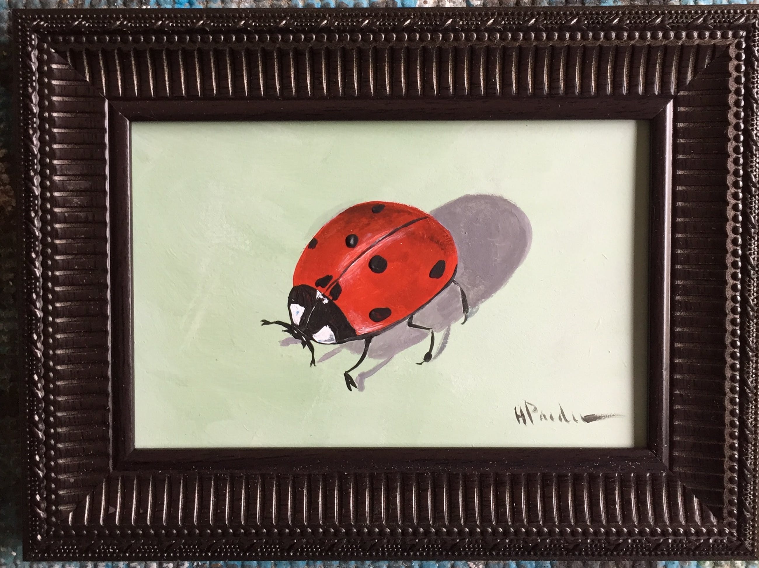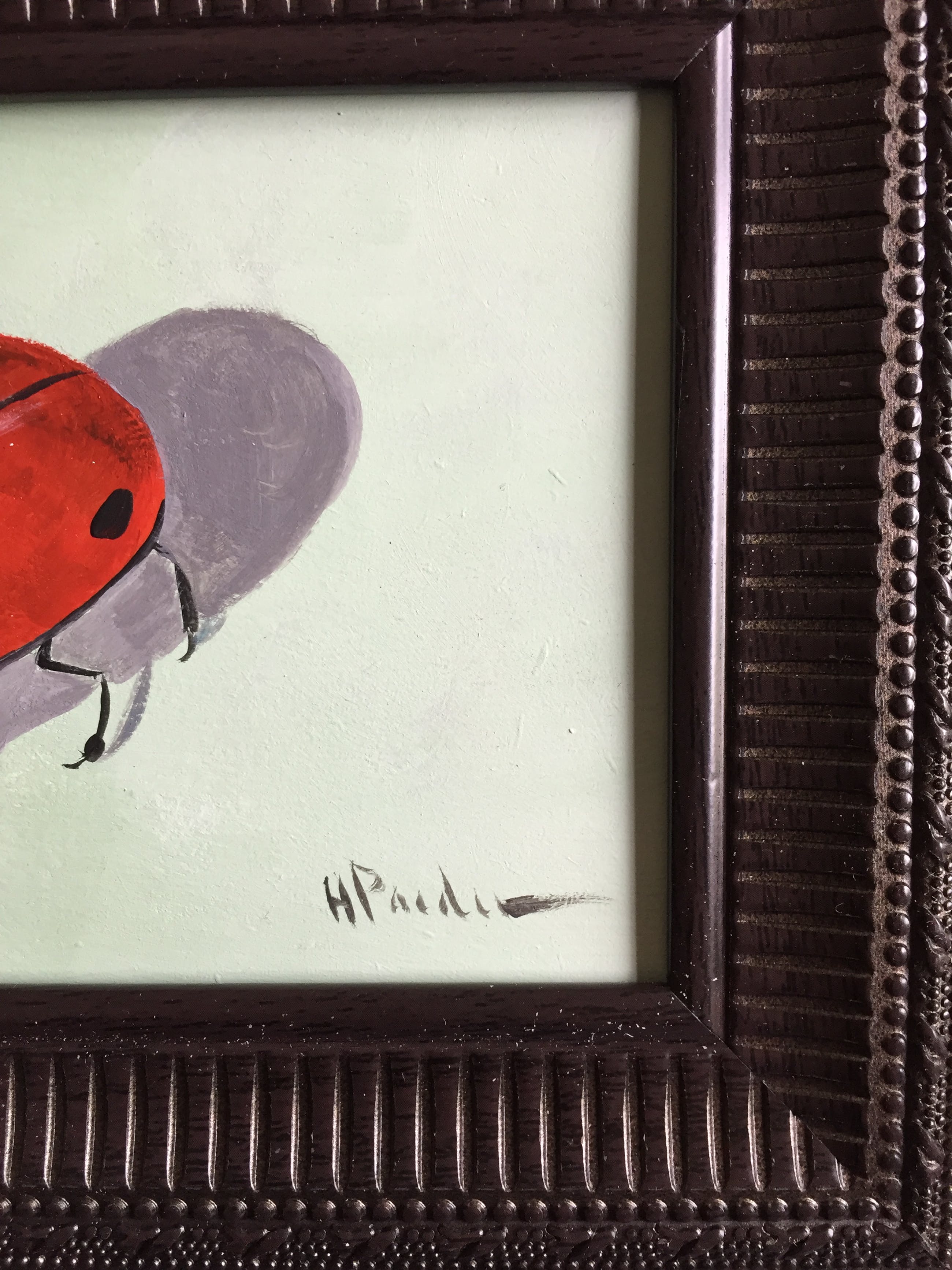 Leuk schilderij van een lieveheersbeestje het symbool van zinloos geweld gesigneerd h poeder verder spreekt het schilderijtje voor zich