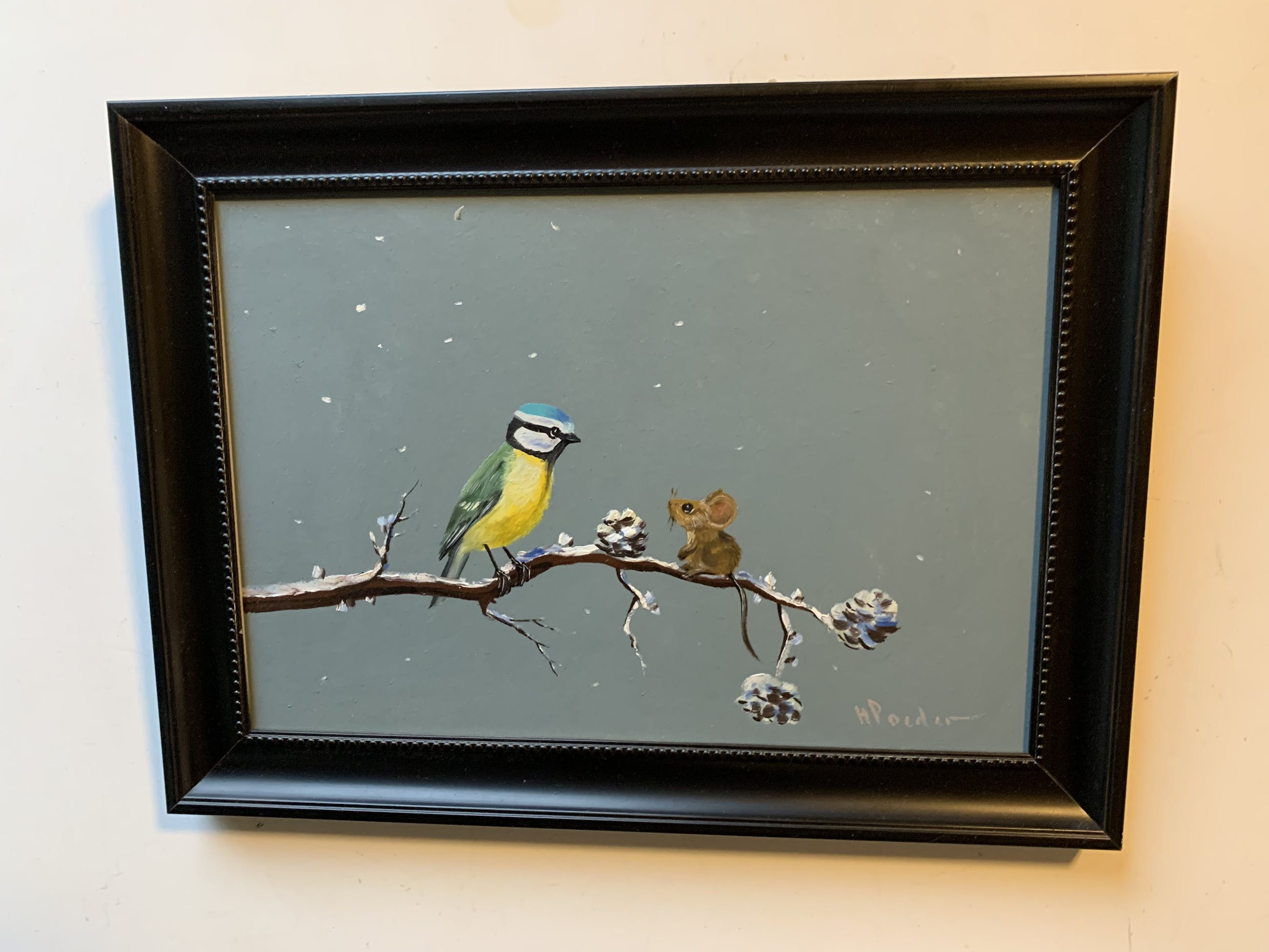 Super leuk schilderij met een pimpelmees en een muisje die elkaar toevallig tegen komen in de winter het schilderij is rechts onder gesigneerd H Poeder (zie ook info rkd in Denhaag)( Rijks kunst en documentaties in Denhaag .)