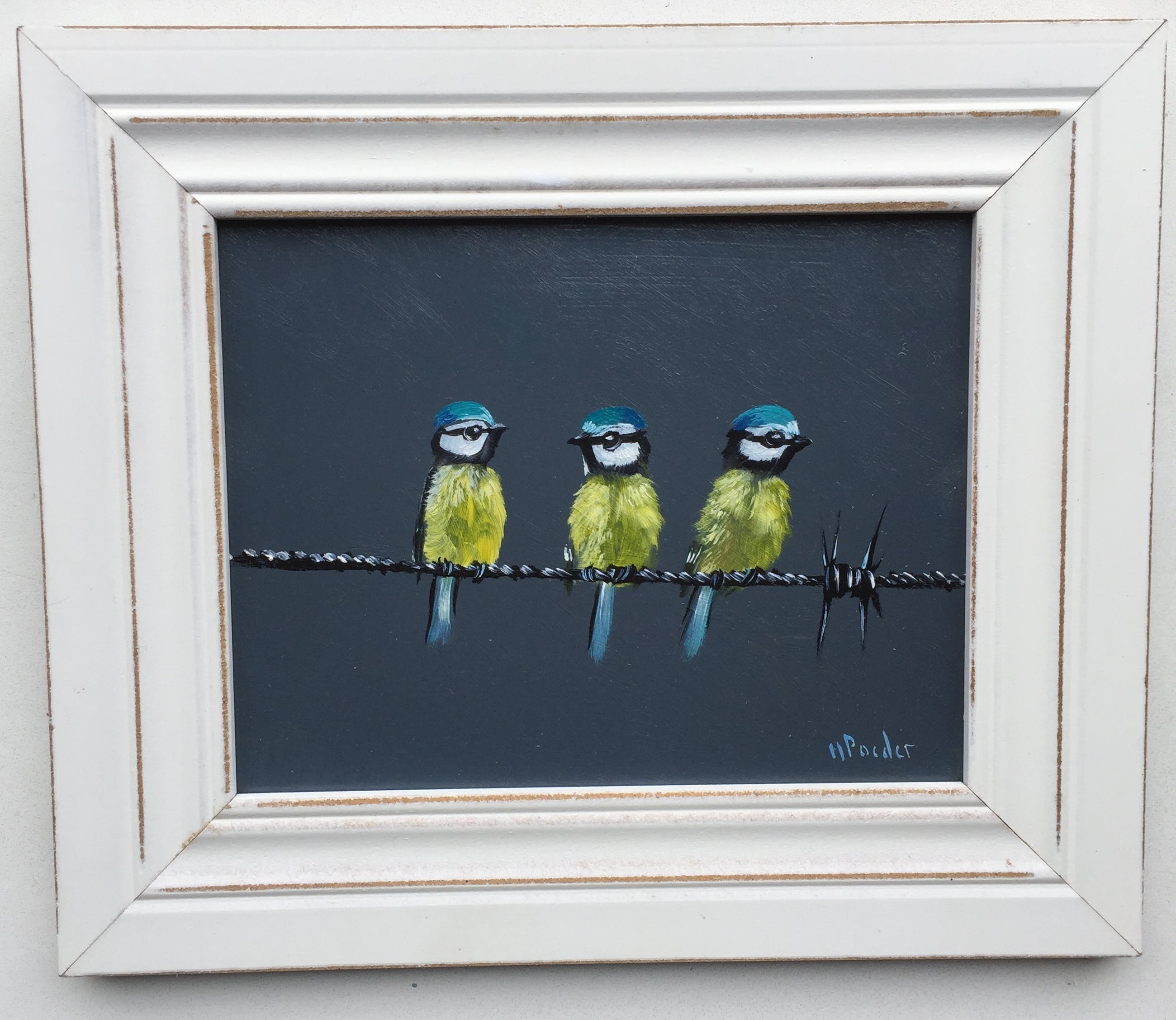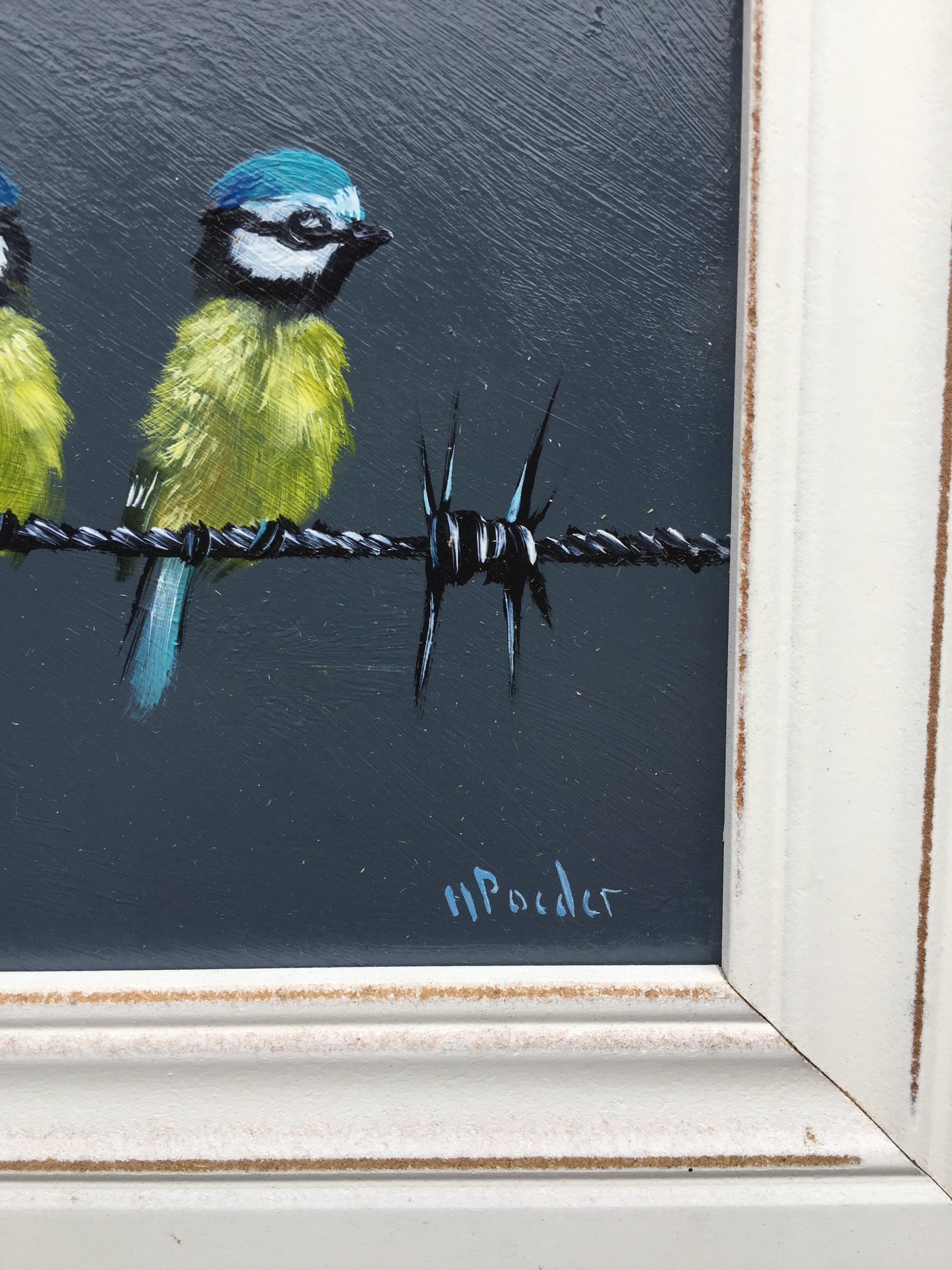 Leuk oliverfje v h poeder 1964 betreft 3pimpelmezen op het prikkeldraad geschilderd op painterboad gesigneerd ro H poeder.