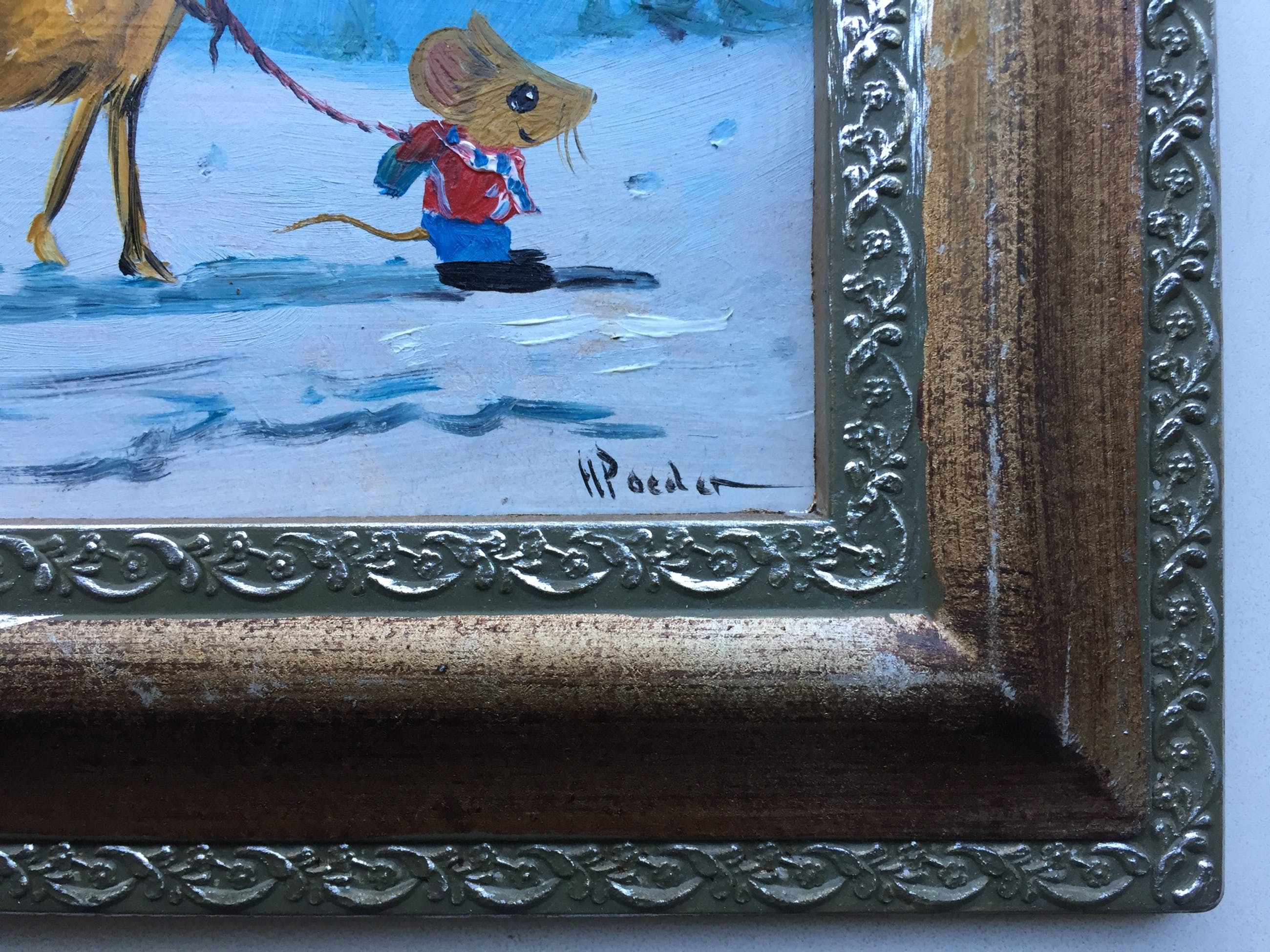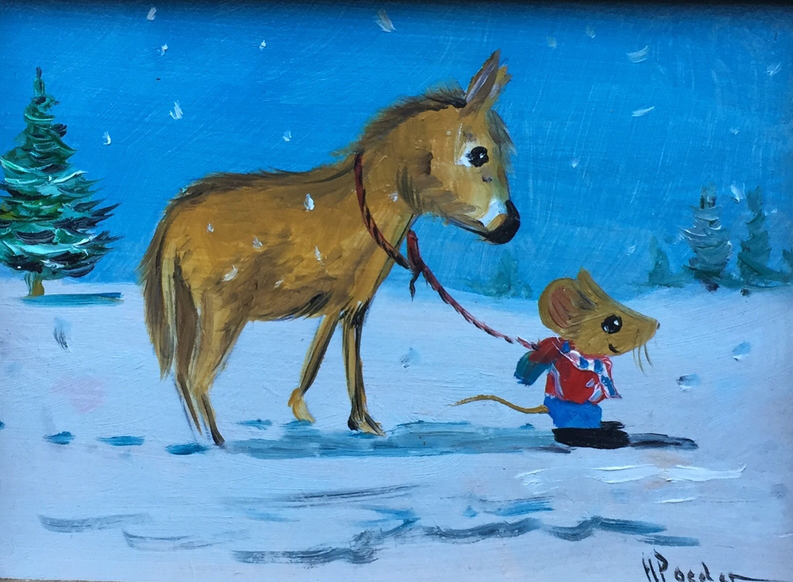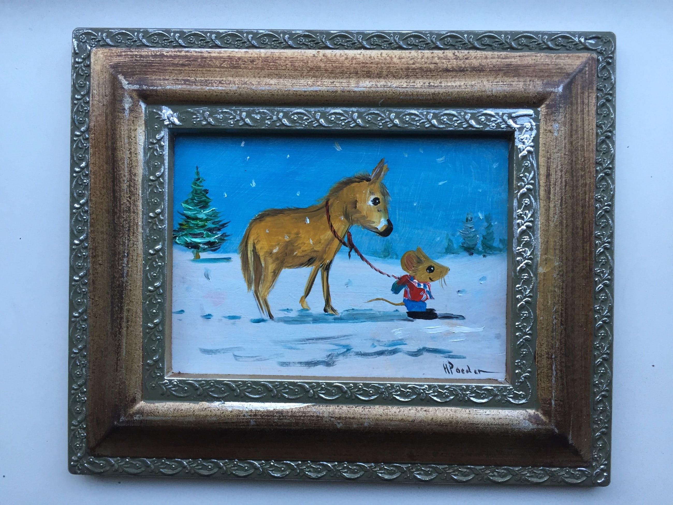 Leuk schilderijtje met winter sfeertje een muisje dat zijn vrind mee neemt het ezeltje van Klaas vaak