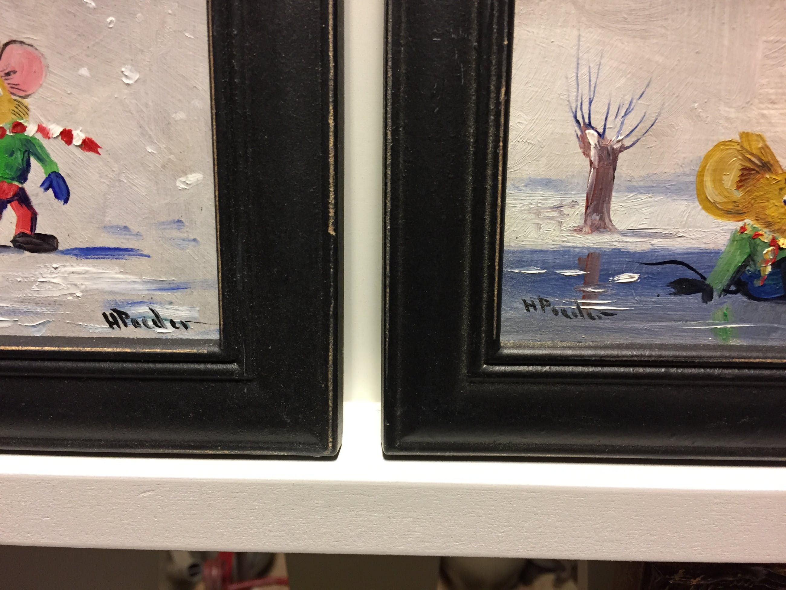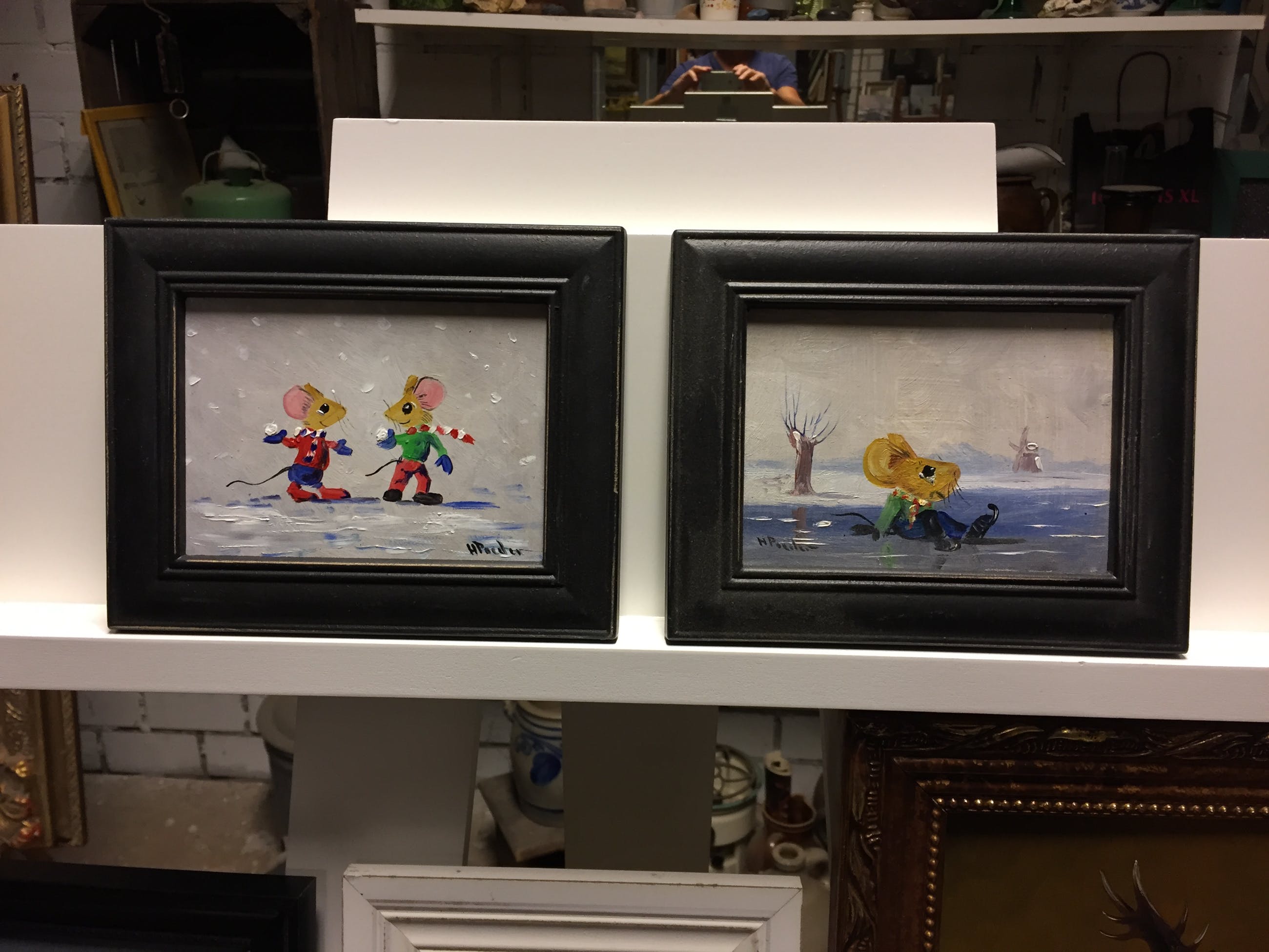 Wintertje olieverf op board 2 schilderijtjes gesigneerd h poeder ondeugende muisjes die spelen in de sneeuw gesigneerd h poeder