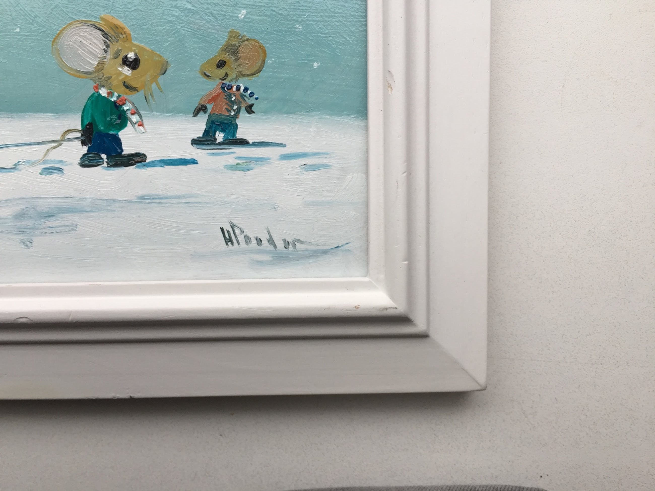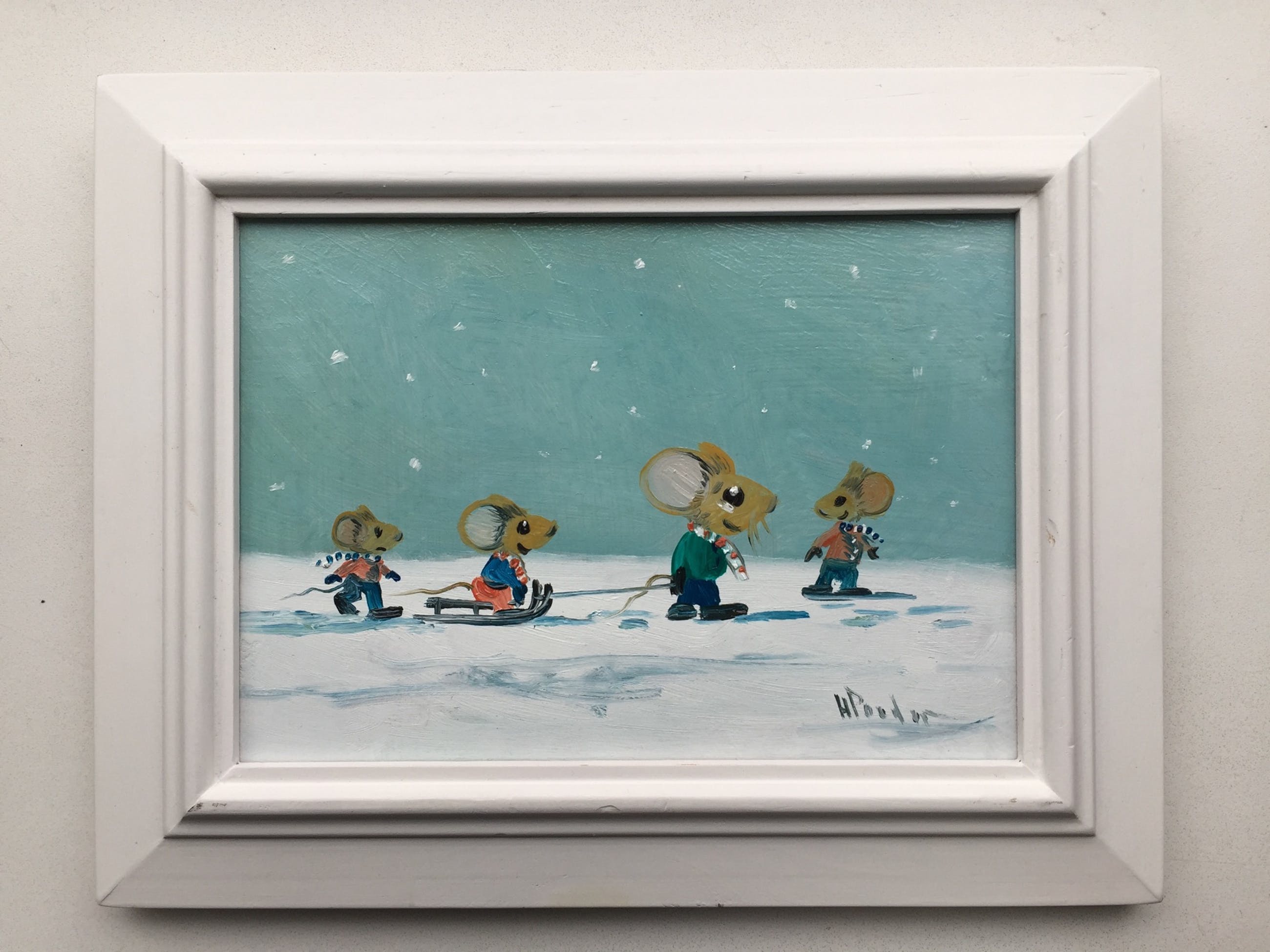 Olieverf op paneel door h poeder betreft muisjes met winter pret op de slee terwijl het sneeuwt