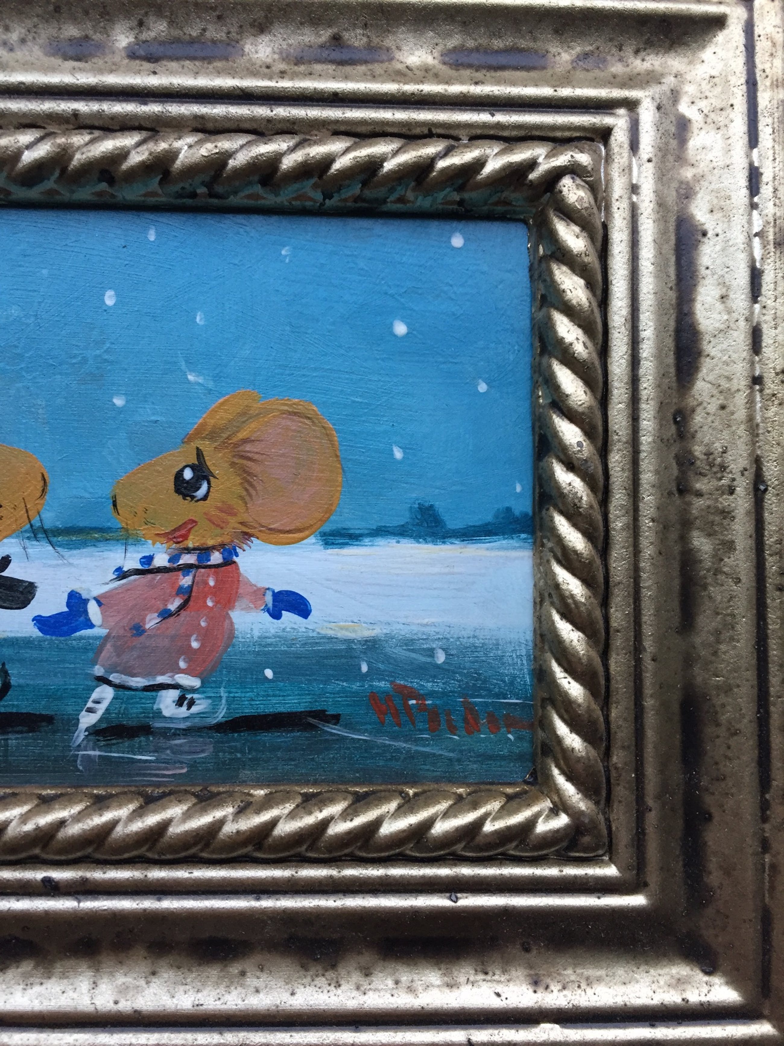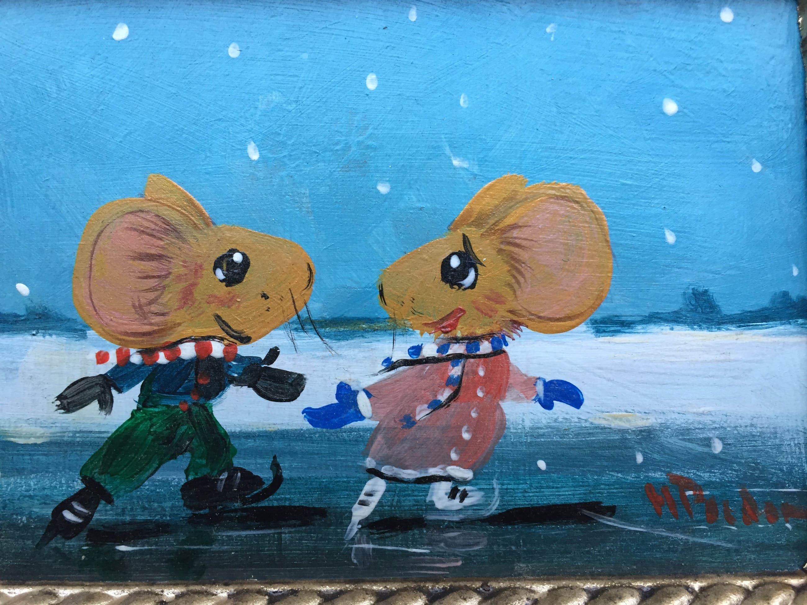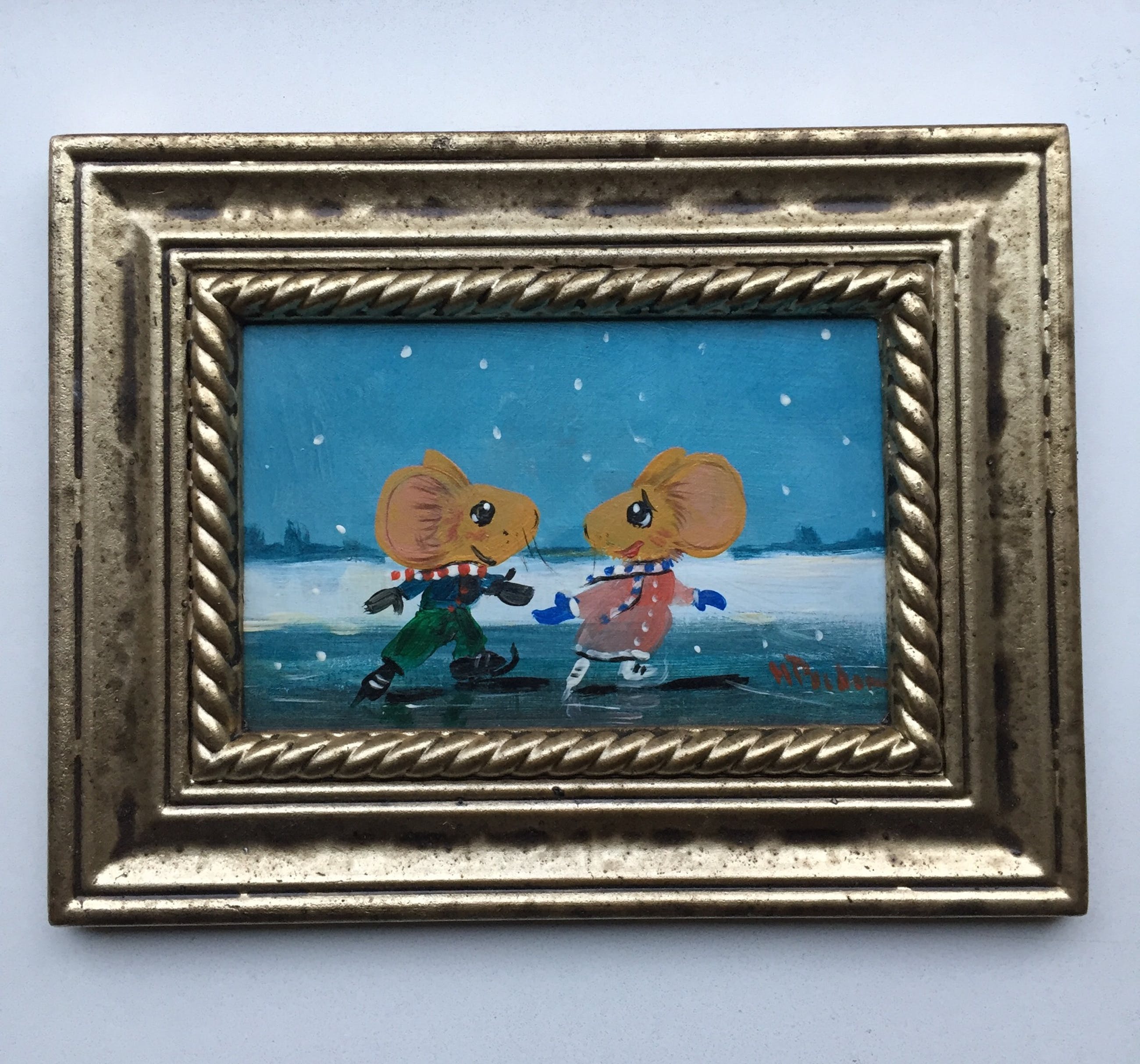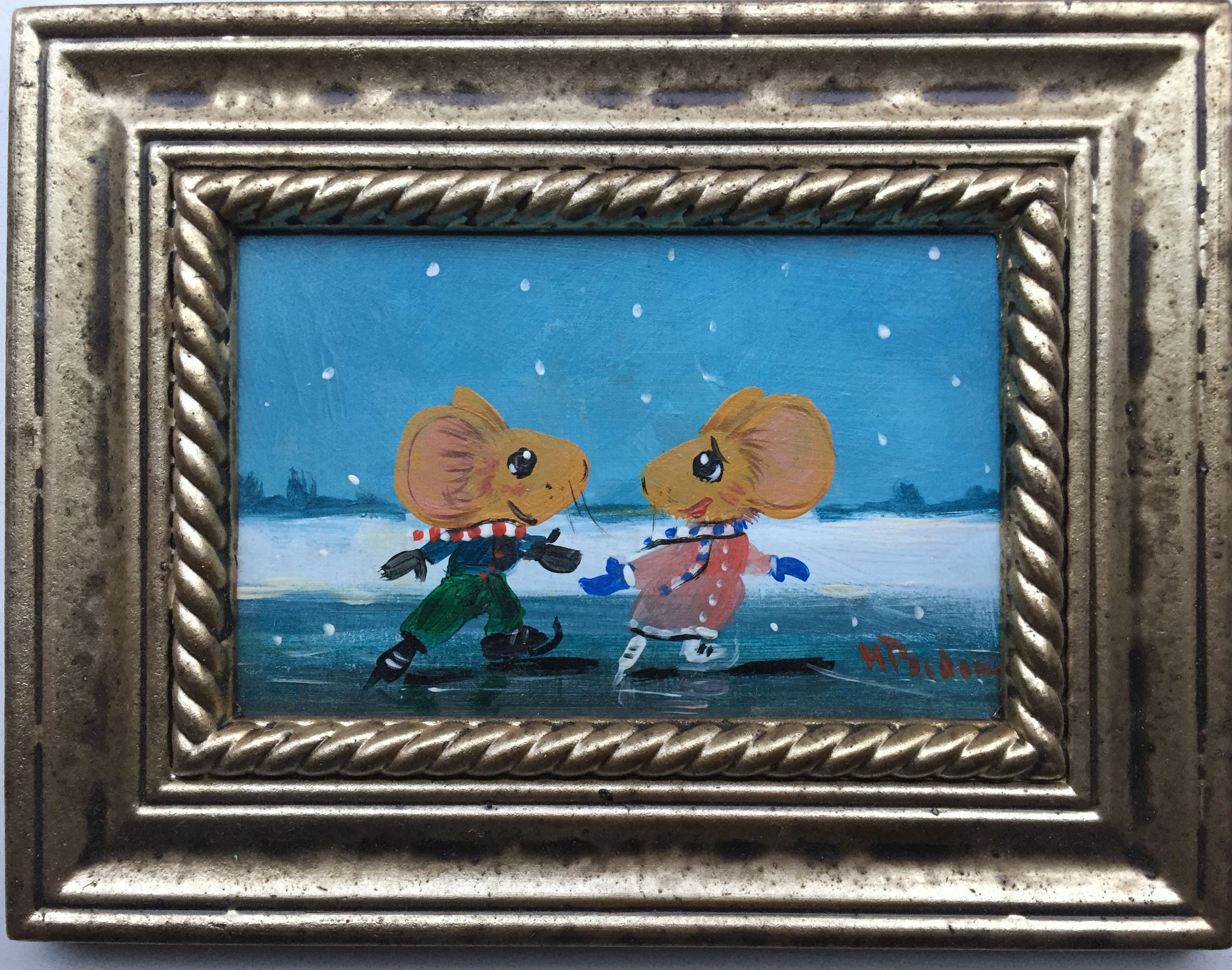 2 verliefde muisjes schaatsend op het ijs gesigneerd h poeder rechts onder.
