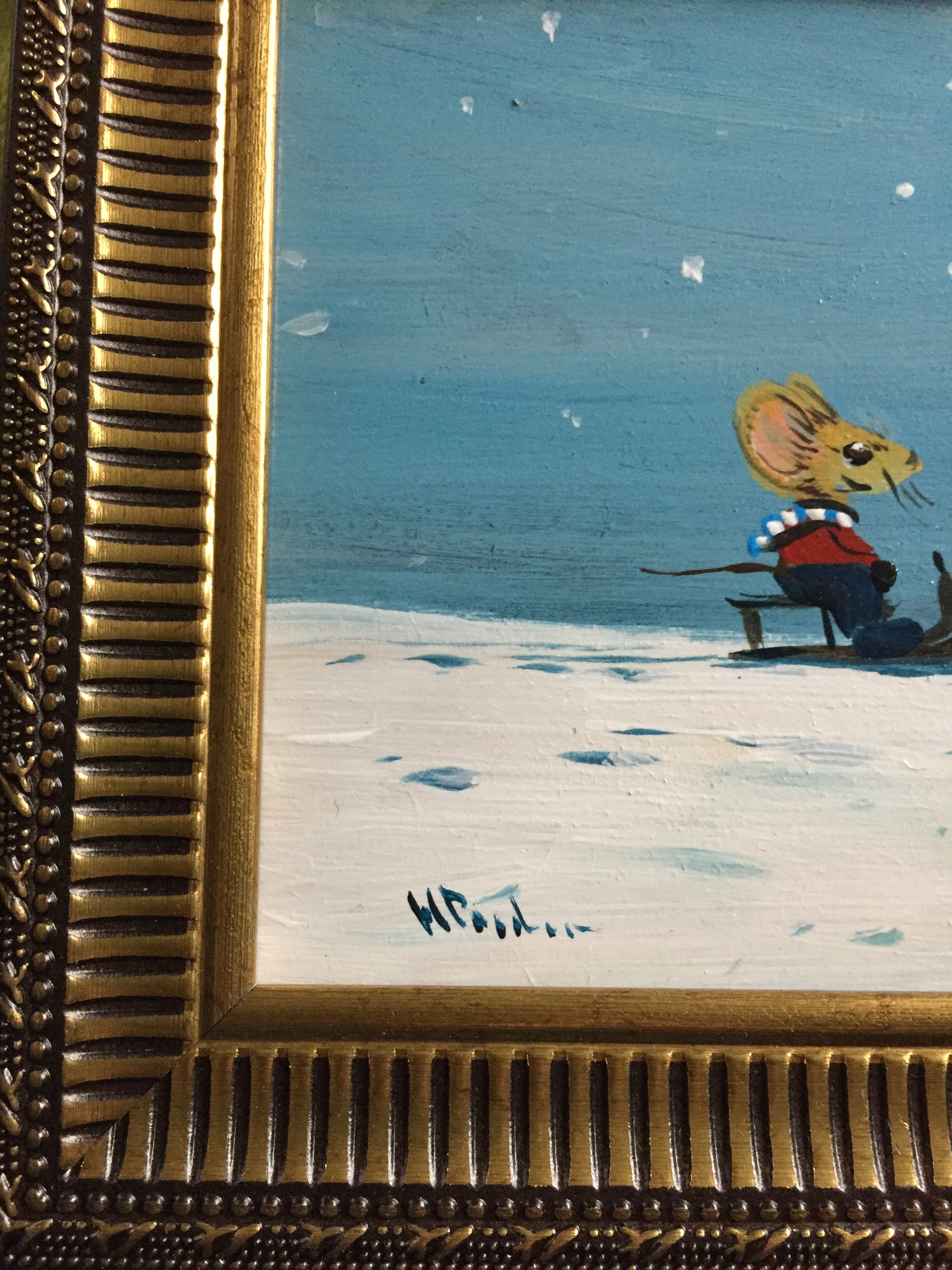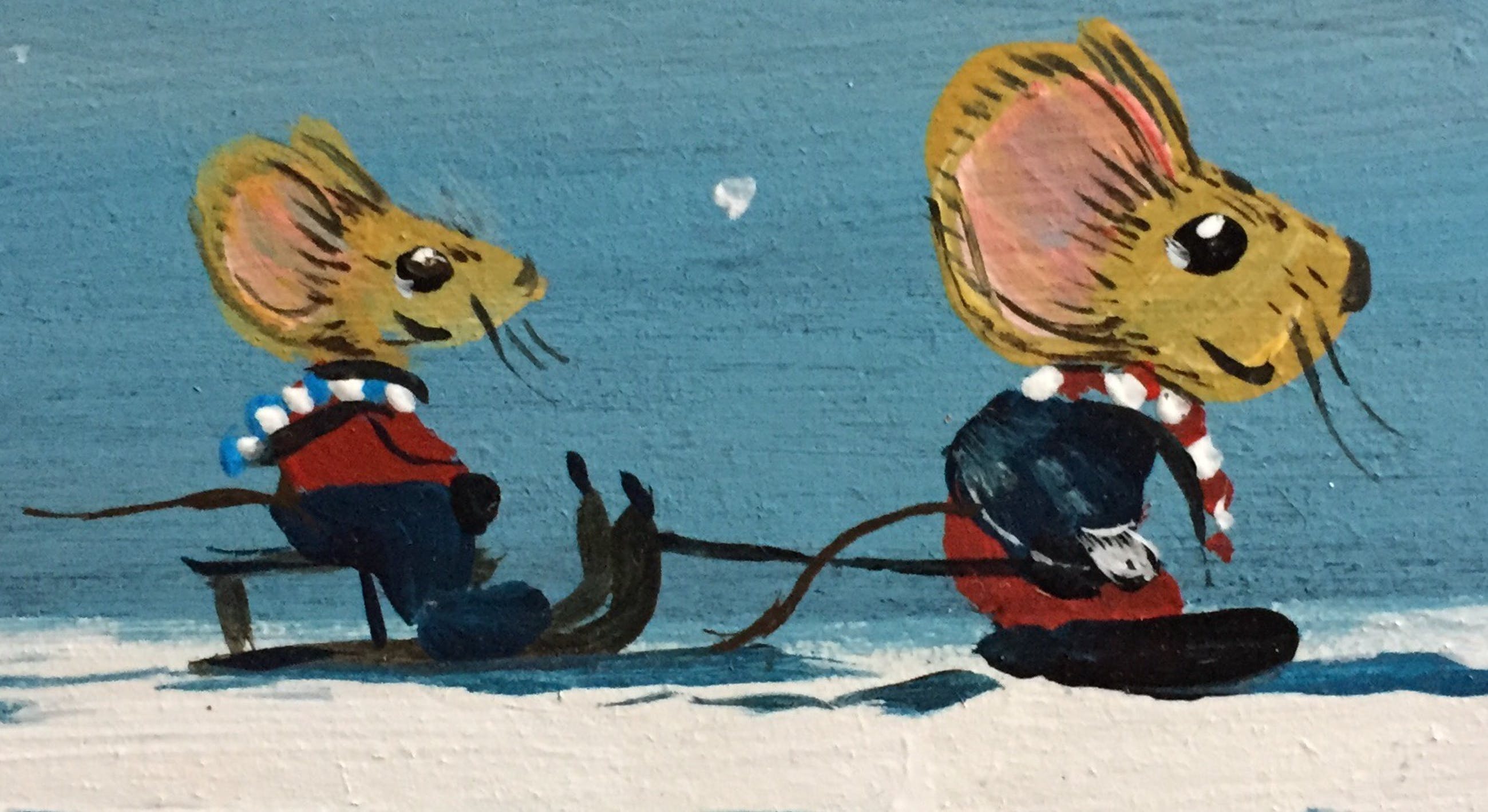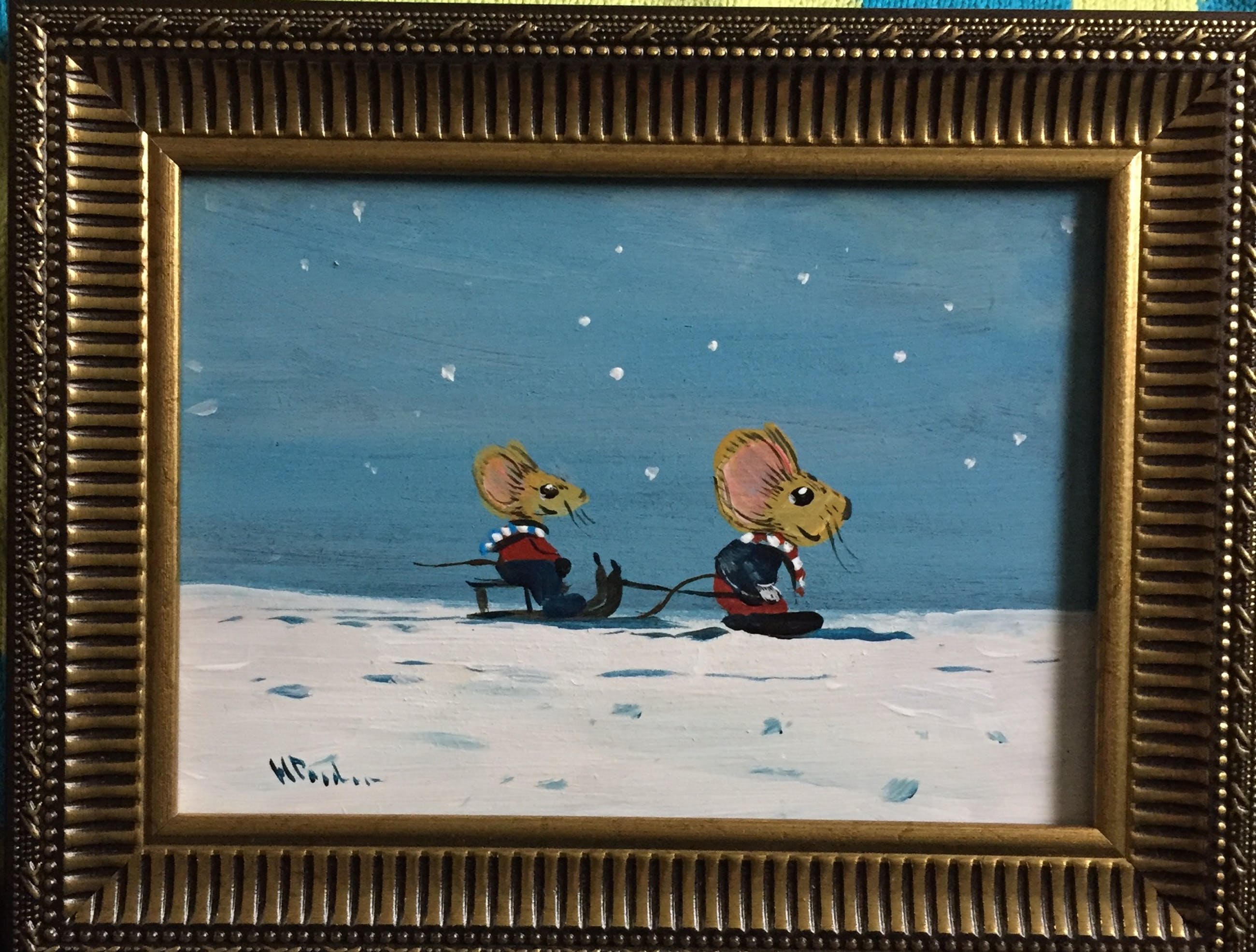 Schattig schilderij met muisjes in de sneeuw gemaakt op painter board. Door h poeder. Links onder gesigneerd